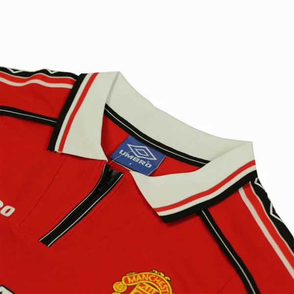 Famous home shirt from the glorious 98-99 Treble season when Alex Ferguson guided the Red Devils to the promised land with triumphs in the Premiership, FA Cup and Champions League. The iconic zip-collar design was worn in the memorable comeback to defeat rivals Liverpool in the FA Cup 4th Round, when the title was secured in a frantic season finale at Old Trafford against Spurs and at Wembley when Sheringham and Scholes saw off Shearer’s Newcastle