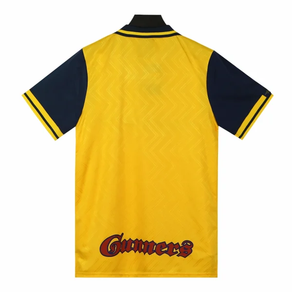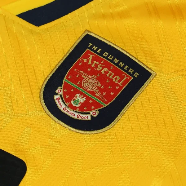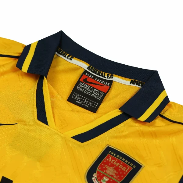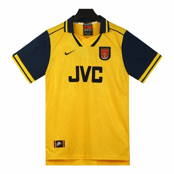 The Arsenal 1996-97 away shirt is a vintage piece of football memorabilia, designed by Nike. This shirt is notable for its navy and yellow color scheme, which was a popular design choice during that era. It was worn during Arsène Wenger’s first season as Arsenal’s manager, a significant period in the club’s history.