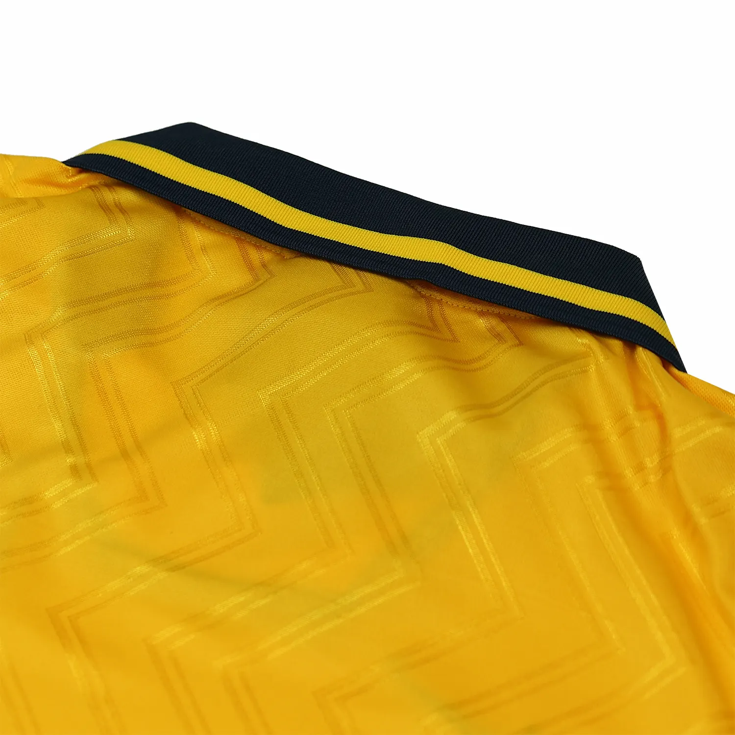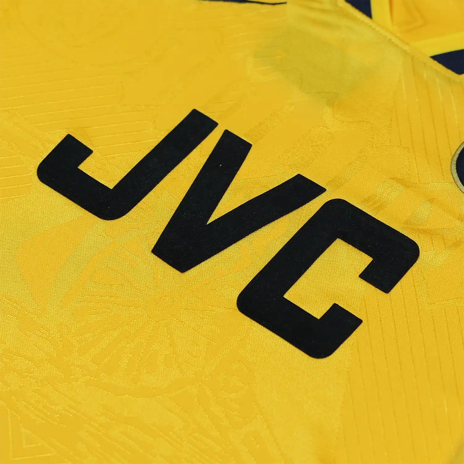 The shirt features a striking bright yellow base color, which is complemented by navy blue accents. In the center of the shirt, the “JVC” sponsor logo is featured prominently. This sponsor’s logo was a significant part of Arsenal’s branding during this period.