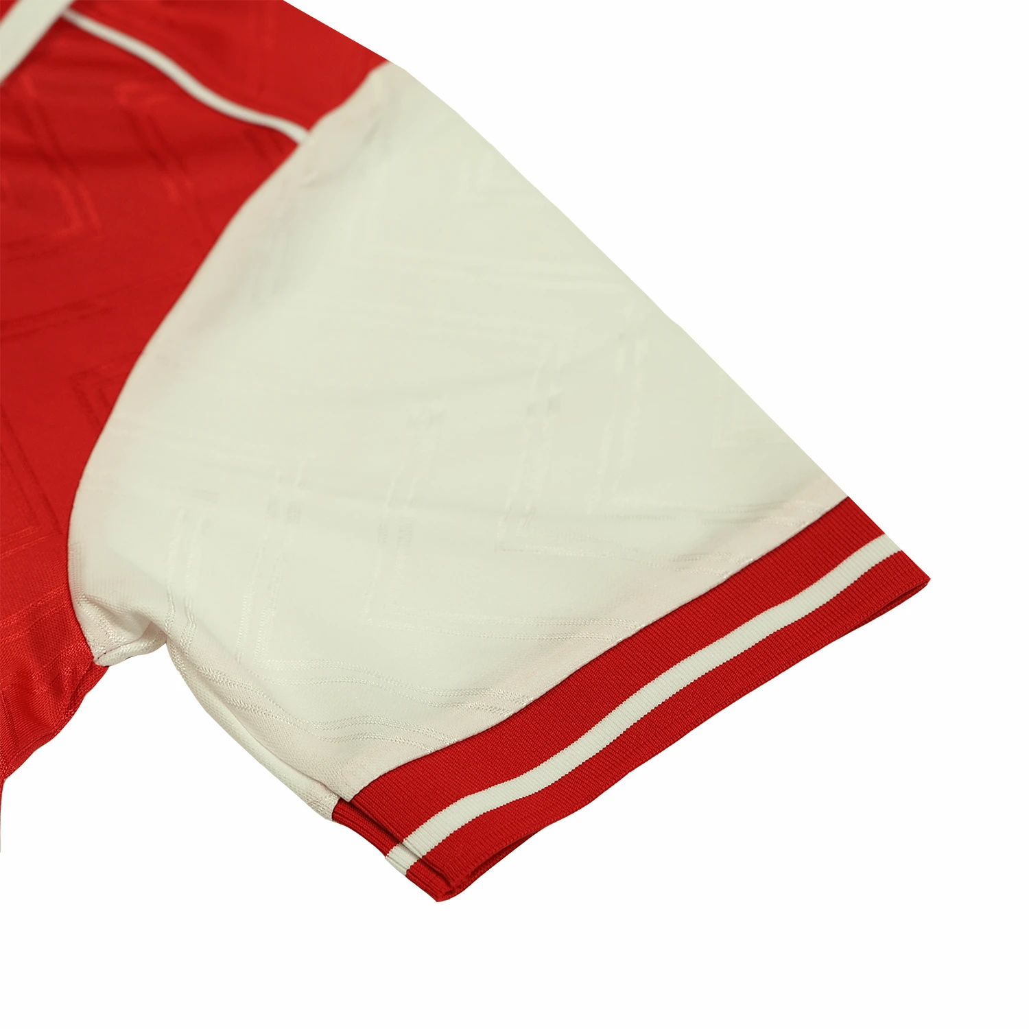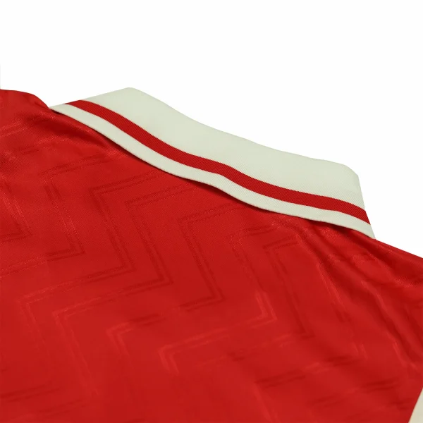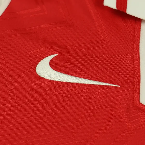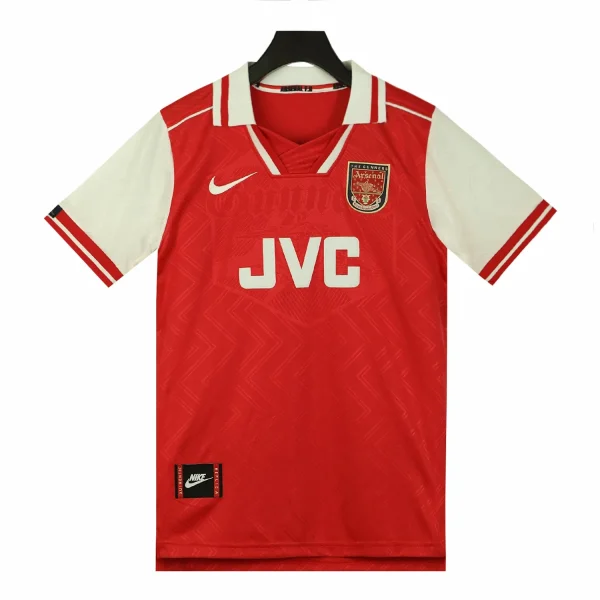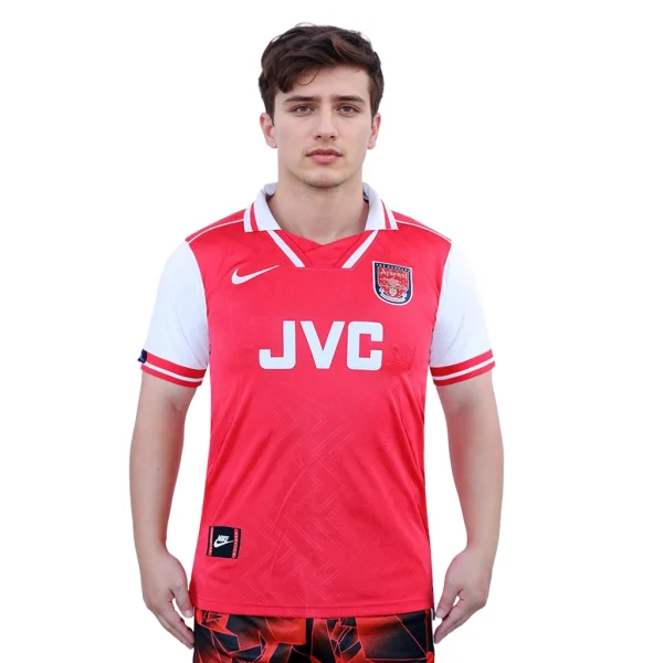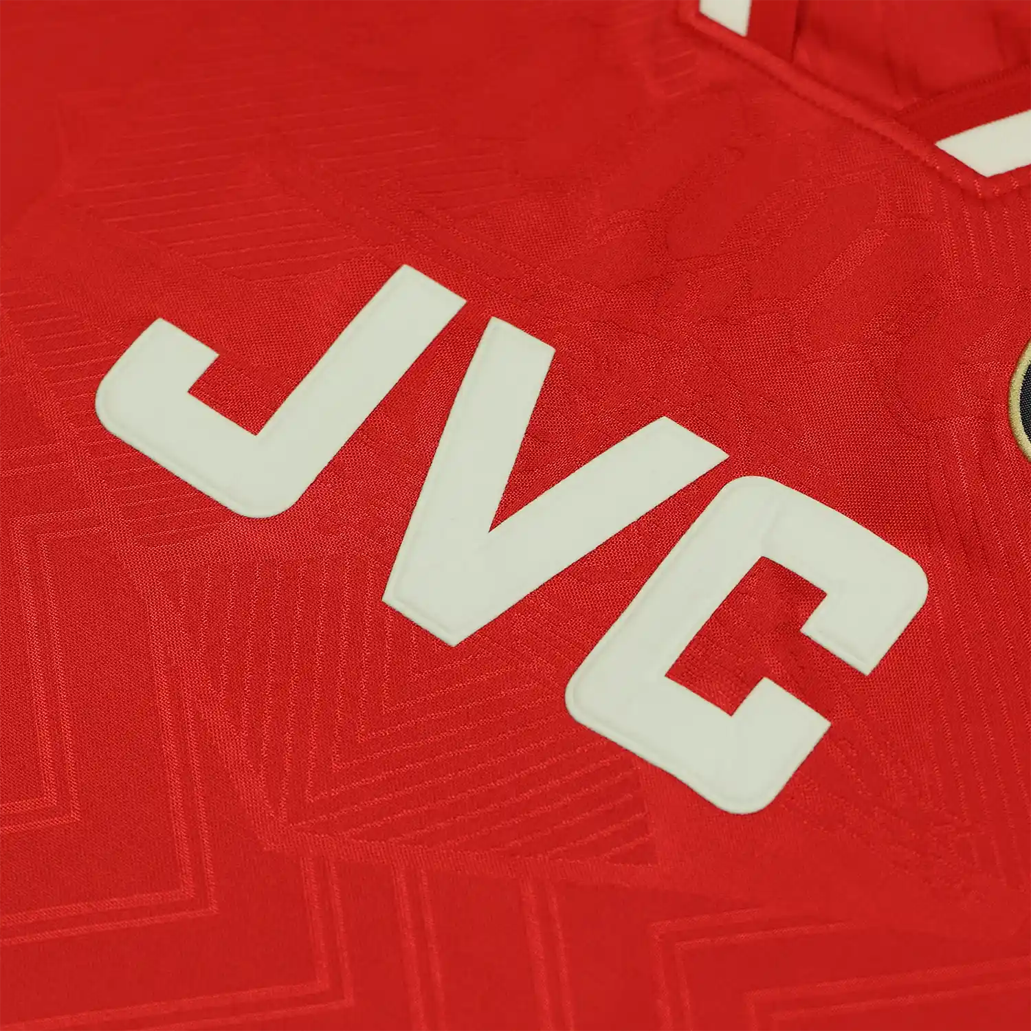 The shirt was manufactured by Nike and features the traditional red body with white sleeves, a design that has become synonymous with Arsenal. The club’s crest is prominently displayed on the left chest, while the Nike logo is on the right. The shirt also includes the JVC sponsor logo across the front.