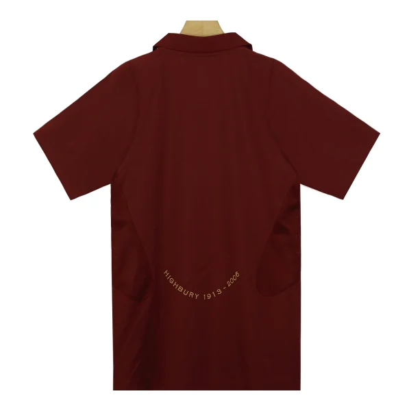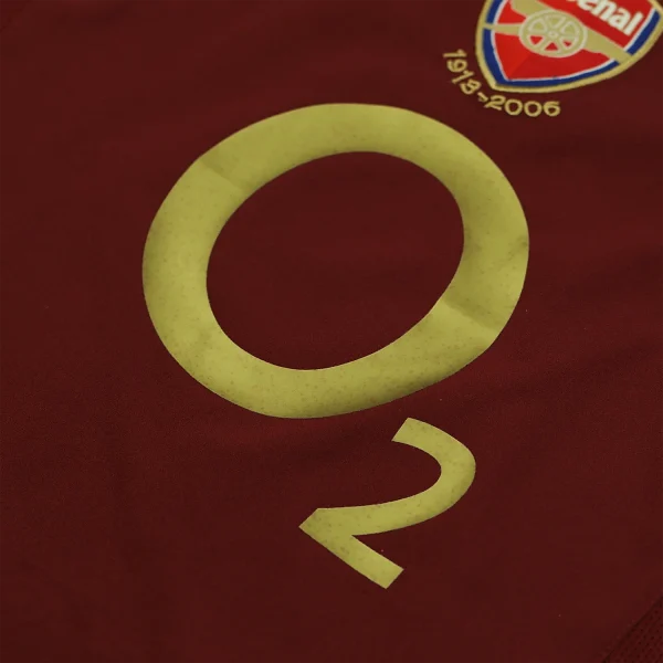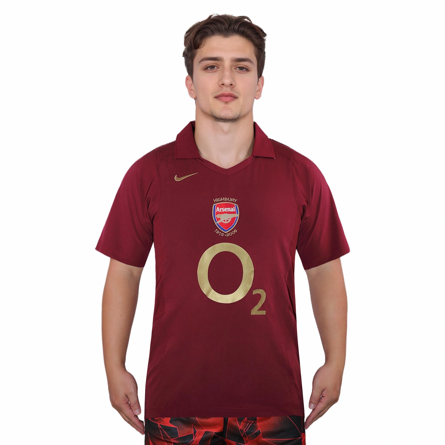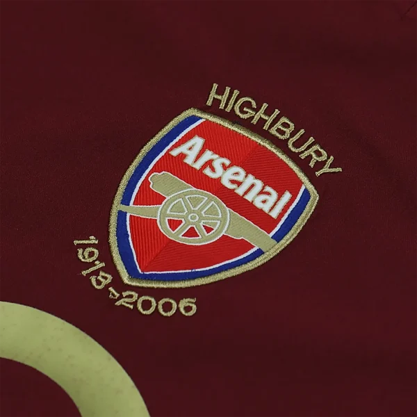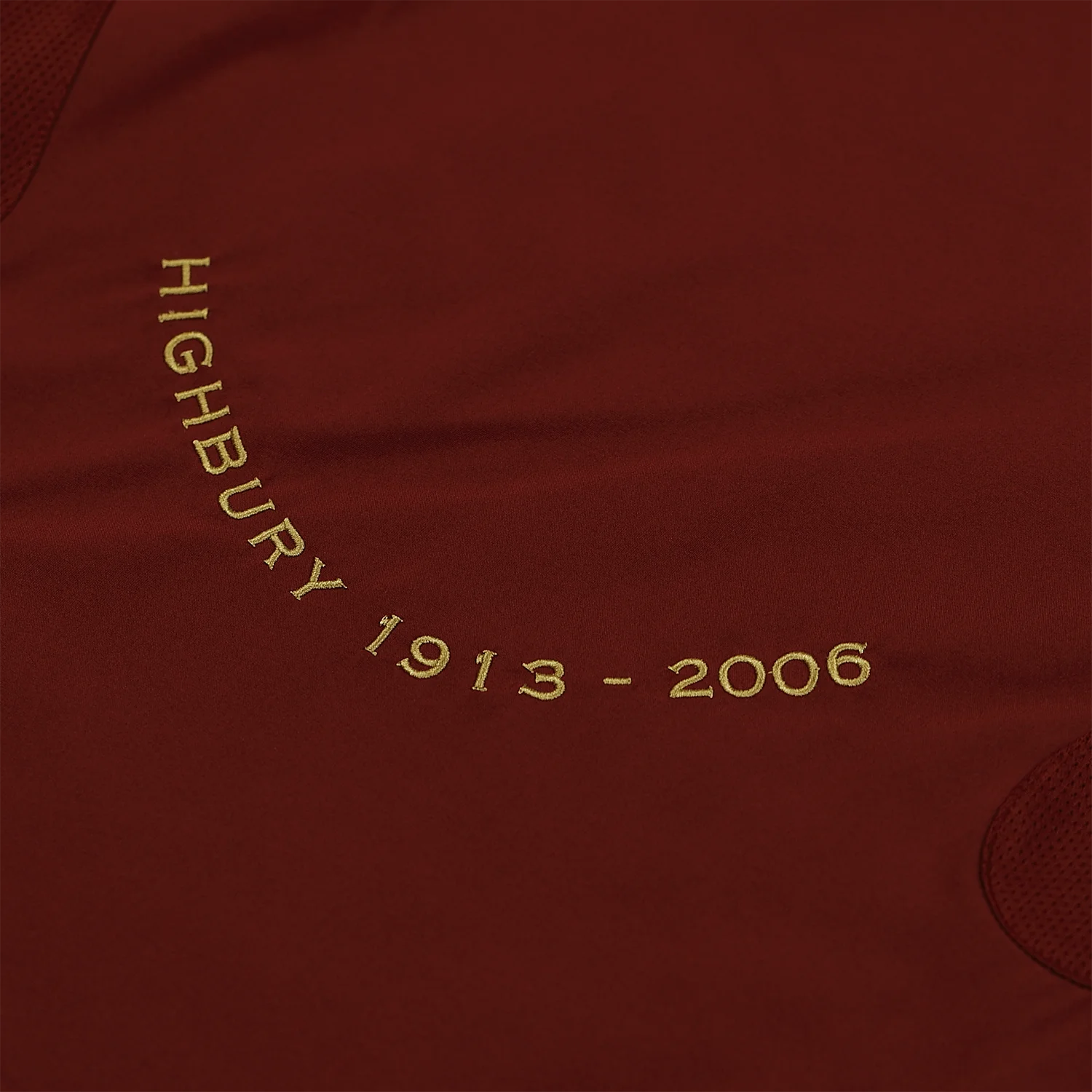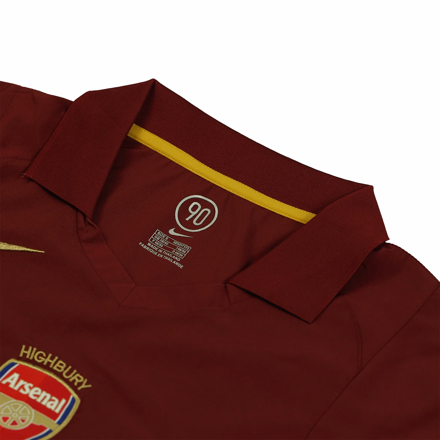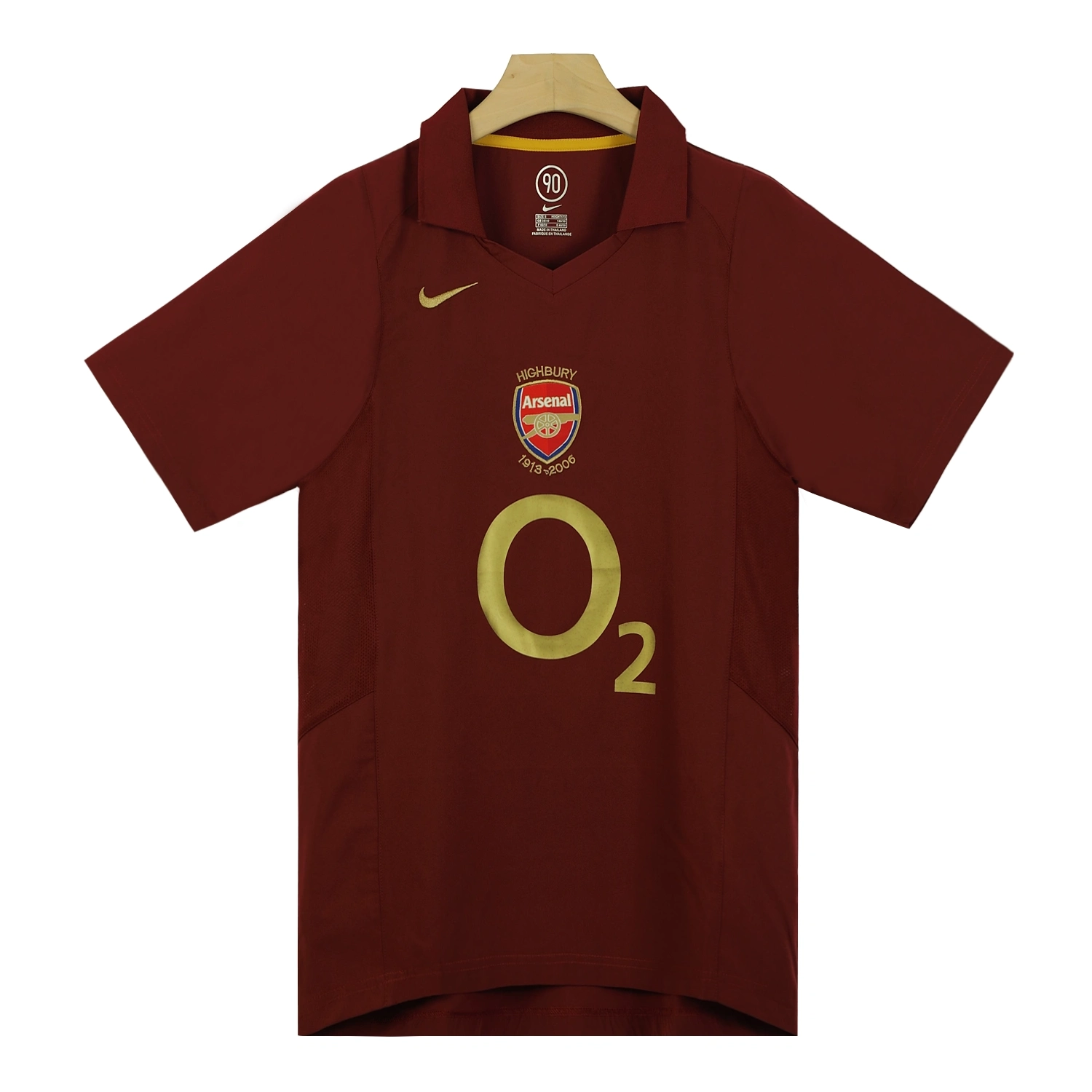 Redcurrant home shirt worn when the side ensured qualification for the Champions League at the expense of bitter rivals Tottenham. A Thierry Henry hat-trick secured a 4-2 victory over Wigan with Henry celebrating by kissing the Highbury turf goodbye. The side also played in their first ever Champions League Final.