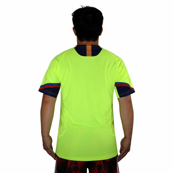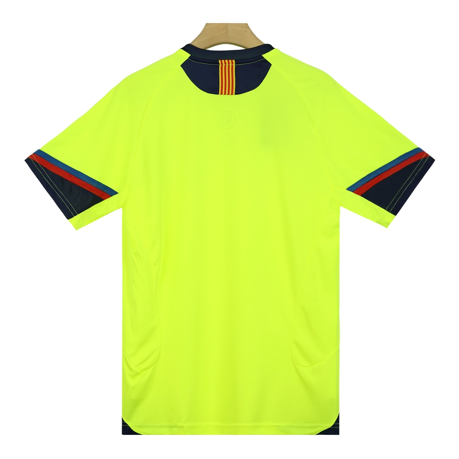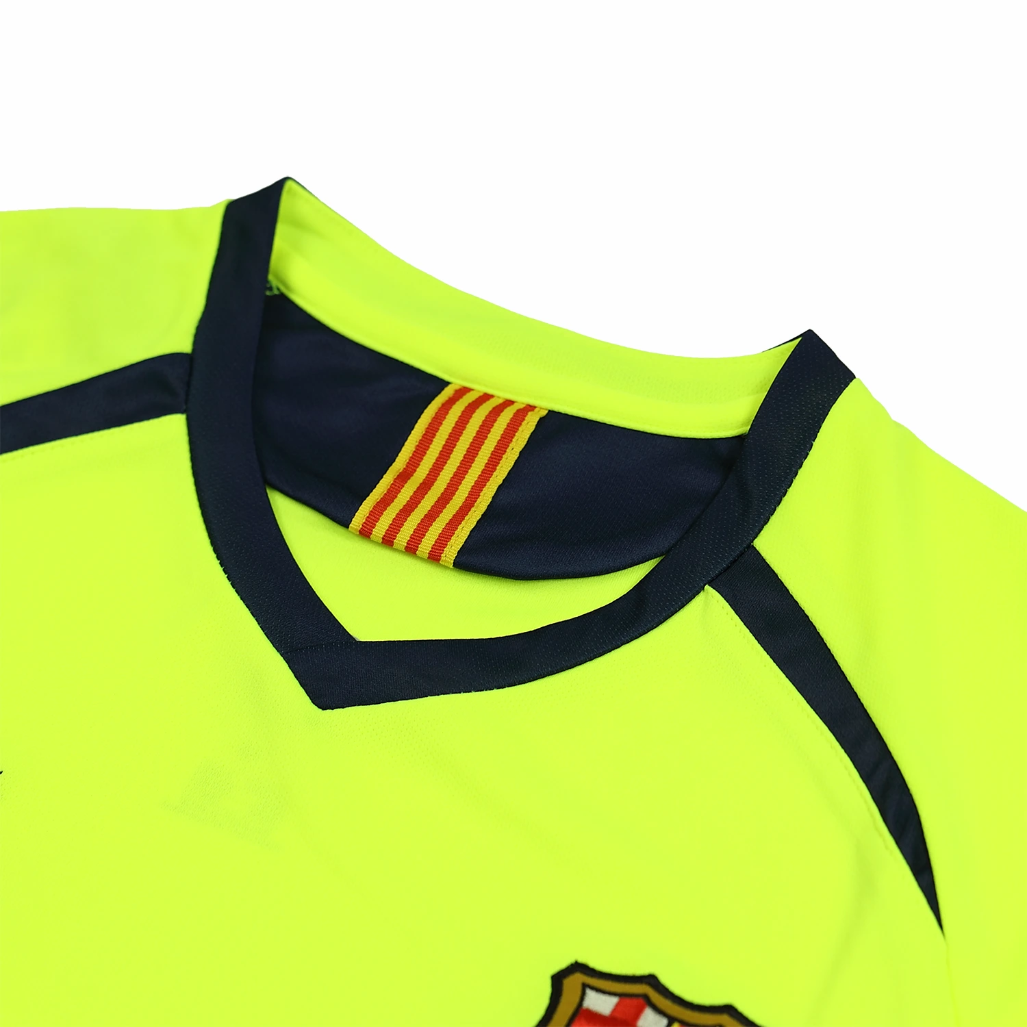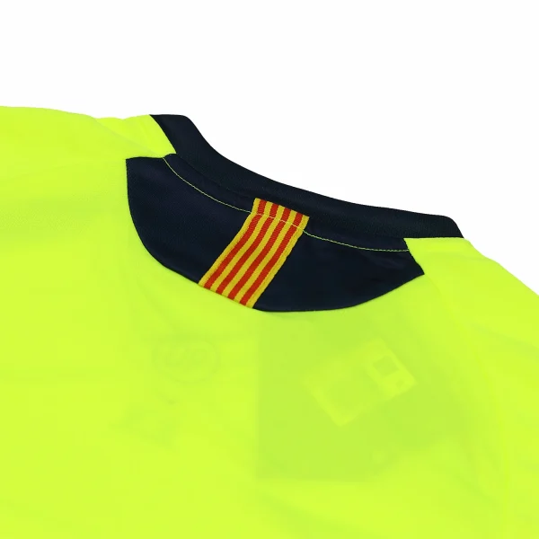 The away shirt features a luminous yellow material with red and blue trim. The shirt is fully customizable with the name and number of your favorite player or even your own. The font used for customization is identical to the official one from that era.