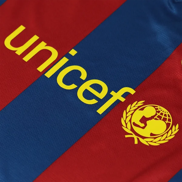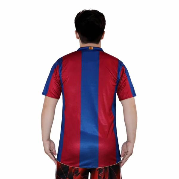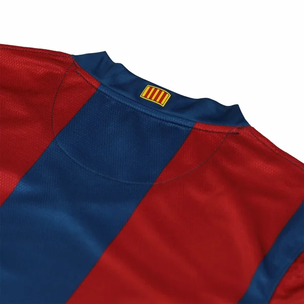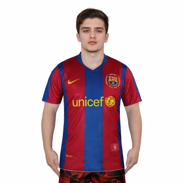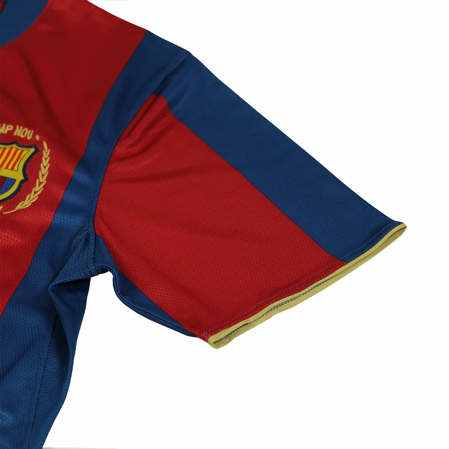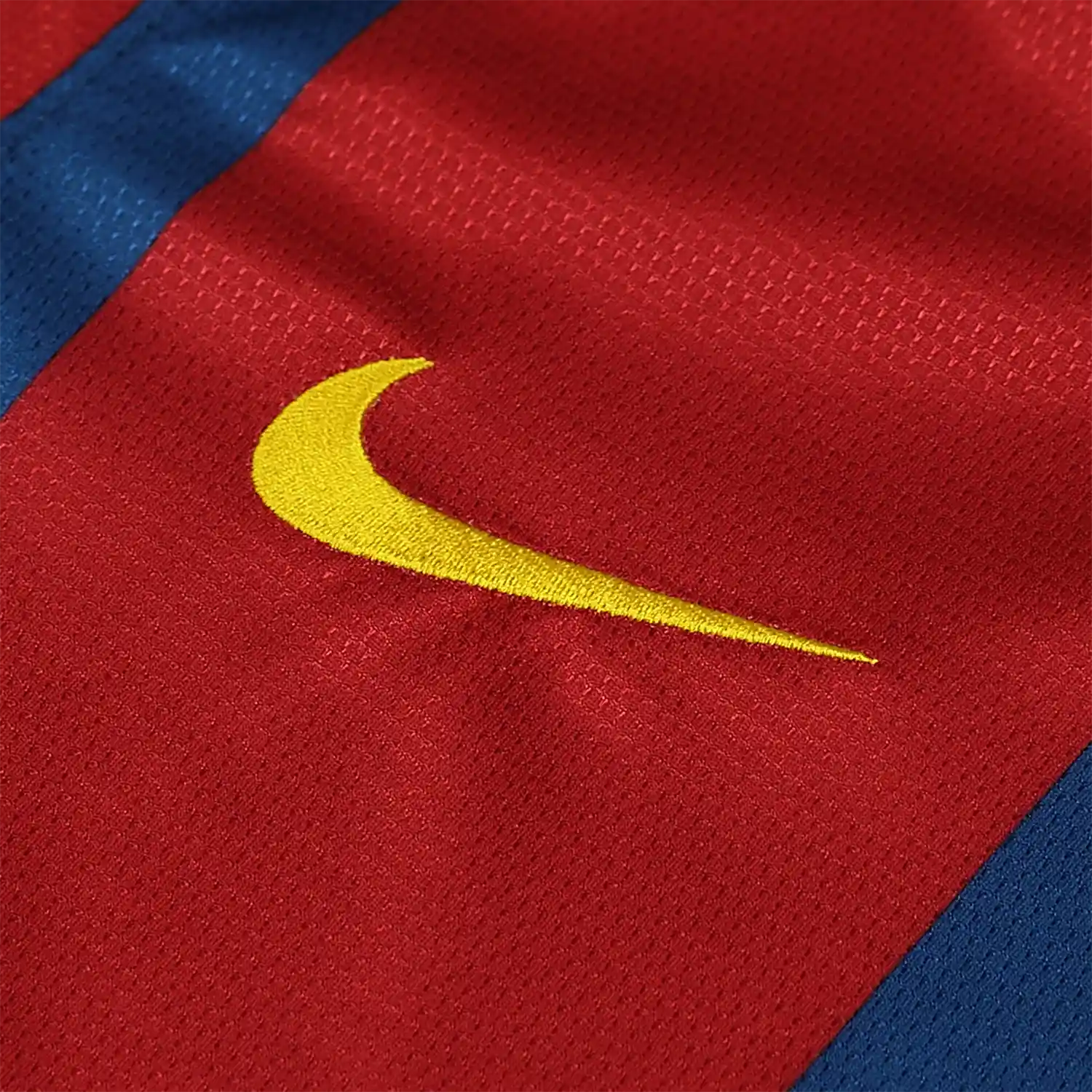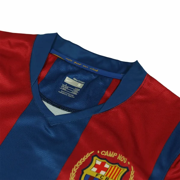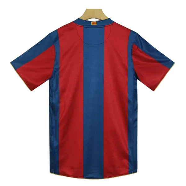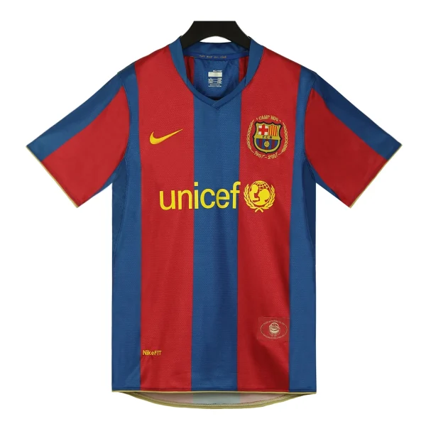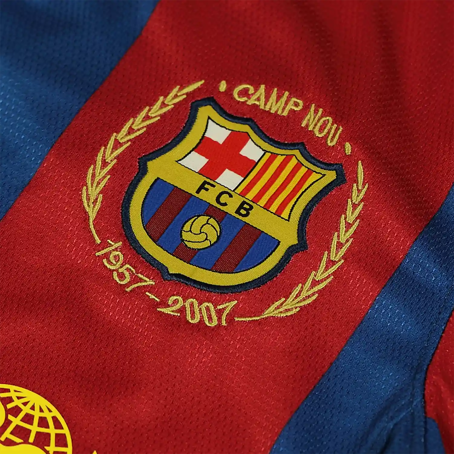 The Barcelona 2007-08 home shirt features the traditional red and blue vertical stripes of FC Barcelona, with gold accents. It includes the special embroidery ‘Camp Nou 1957-2007’ around the club badge, commemorating the 50th anniversary of Barcelona’s iconic stadium, Camp Nou.