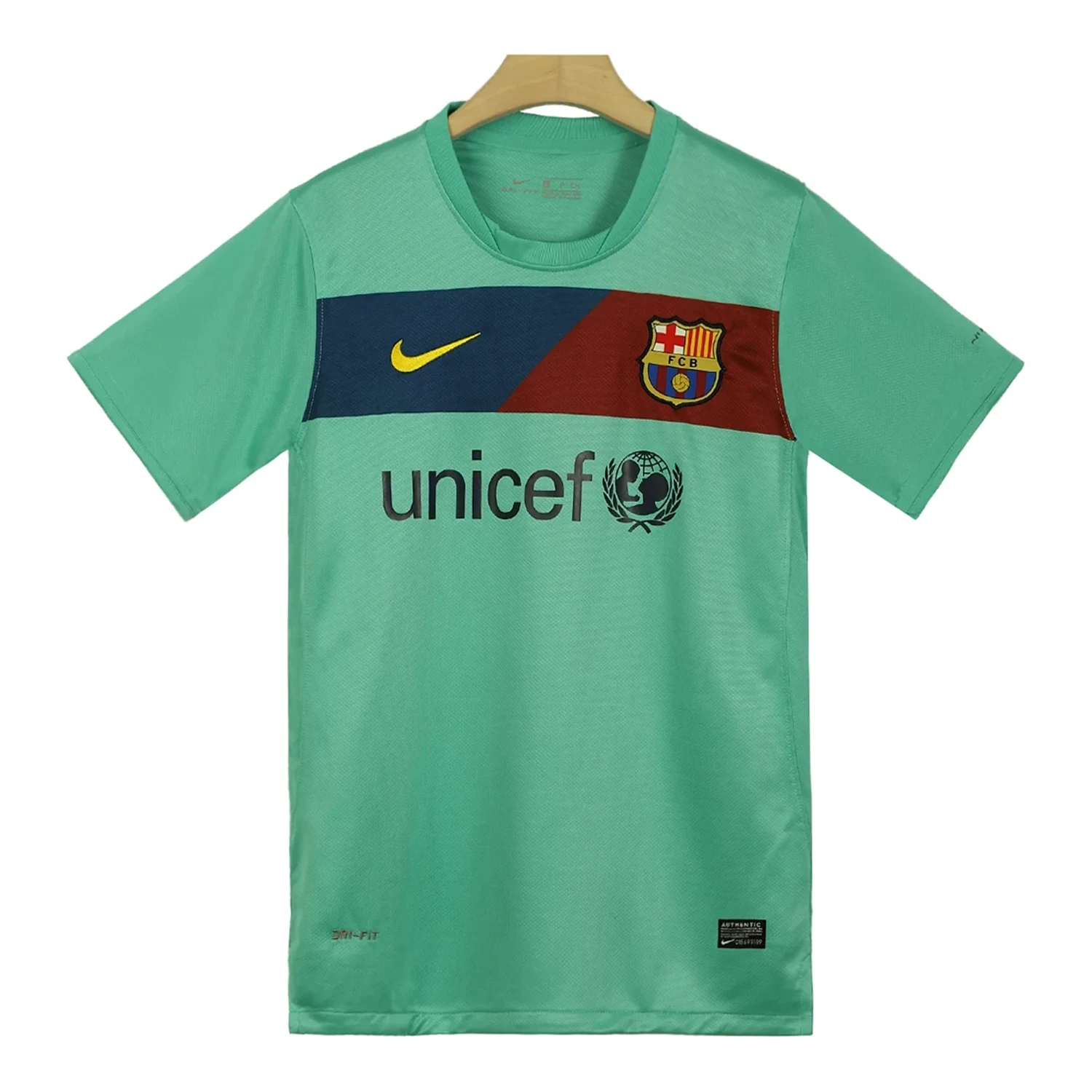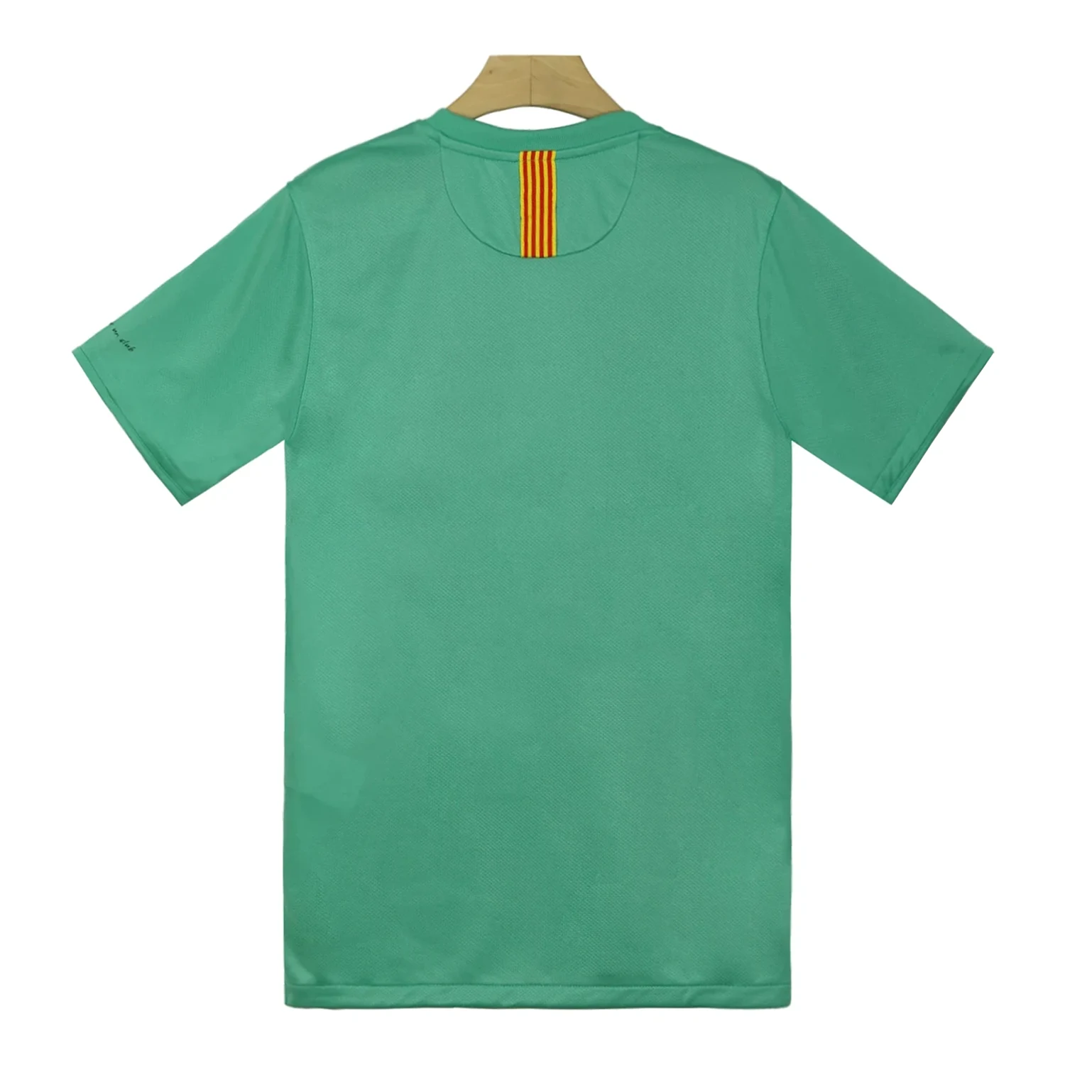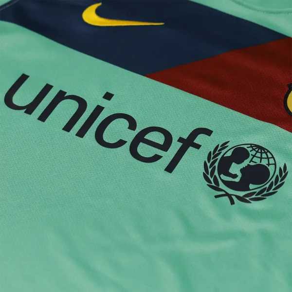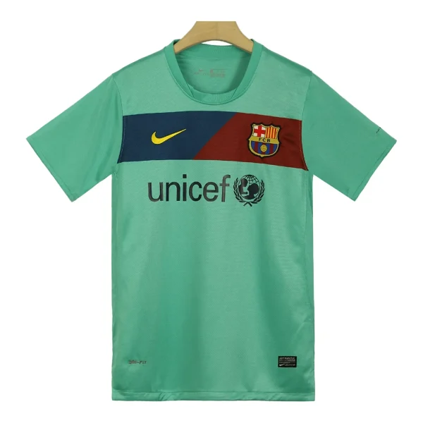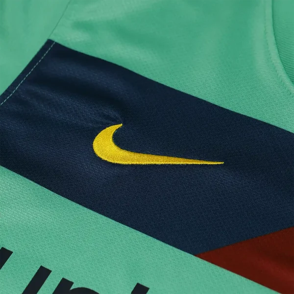 The Barcelona 2010-11 Away Shirt is a green design created by Nike. The shirt showcases a sleek design and there is a horizontal red and blue stripe across the chest, which reflects the club’s traditional colors.