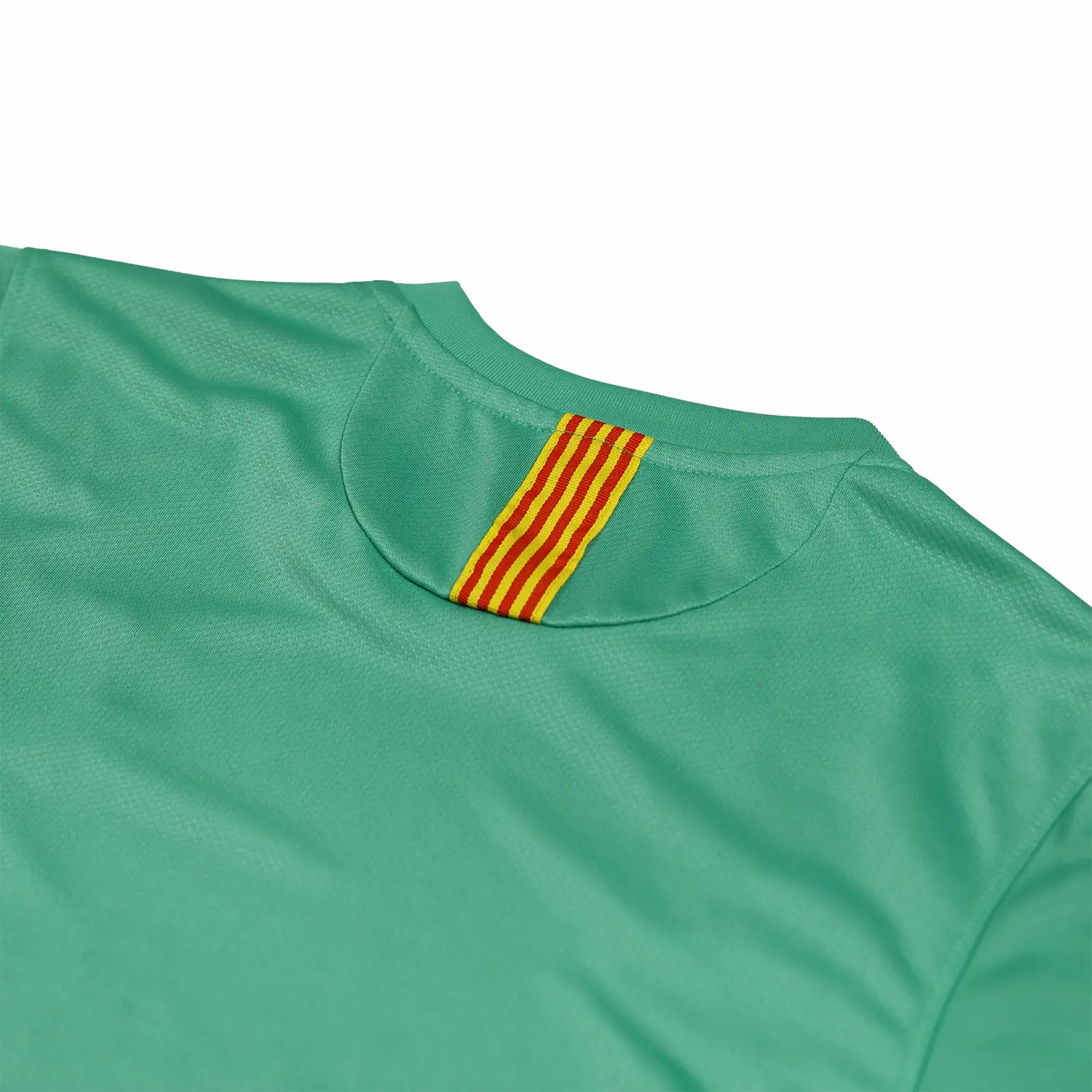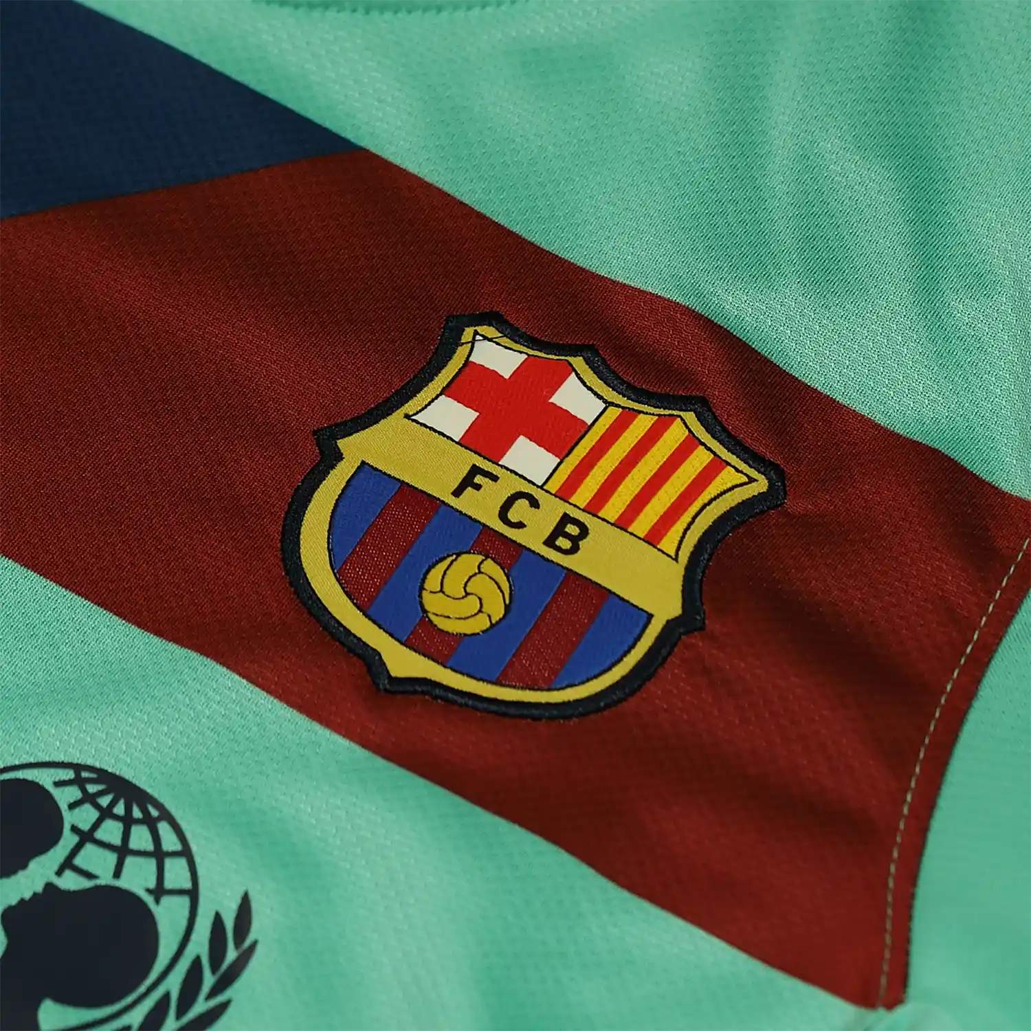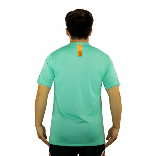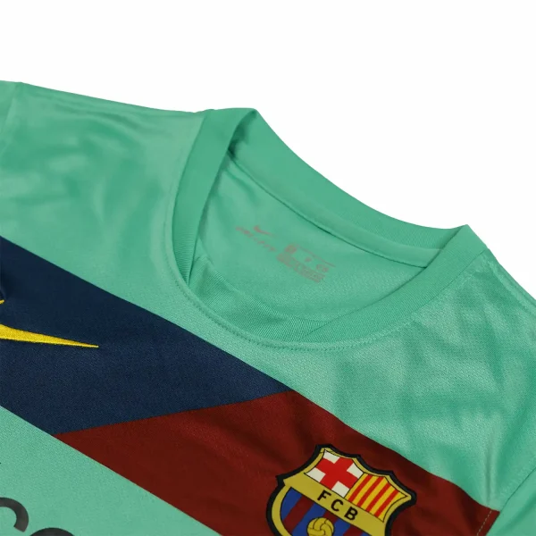 The Barcelona 2010-11 Away Shirt is a green design created by Nike. The shirt showcases a sleek design and there is a horizontal red and blue stripe across the chest, which reflects the club’s traditional colors.
