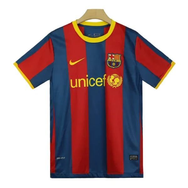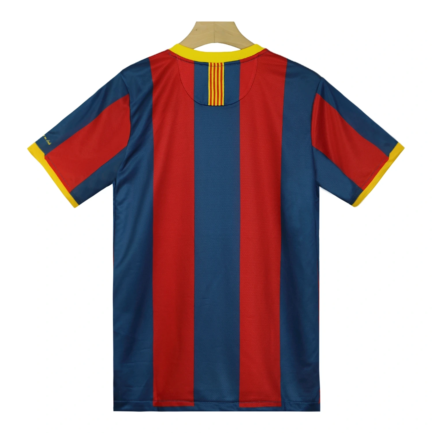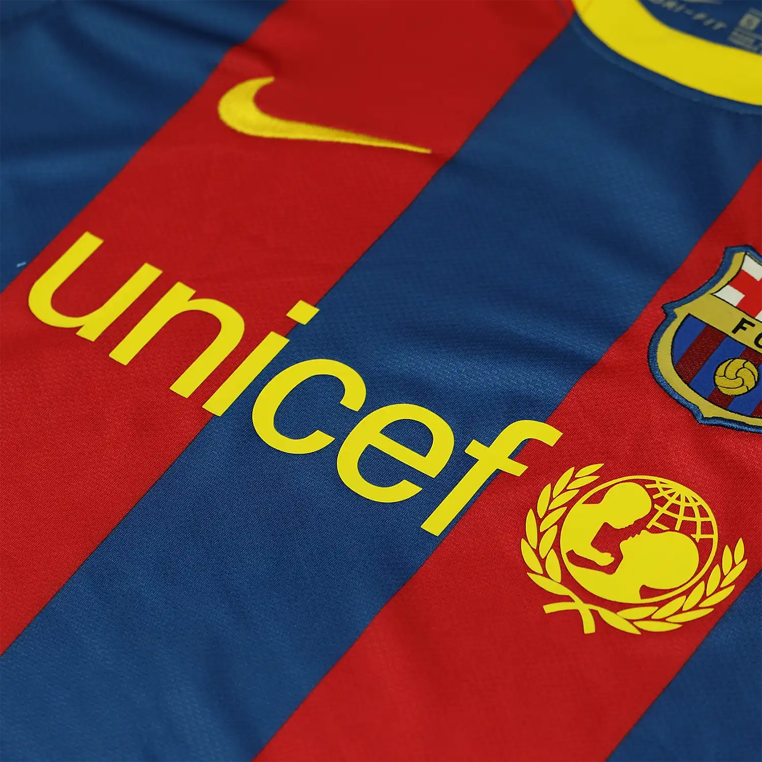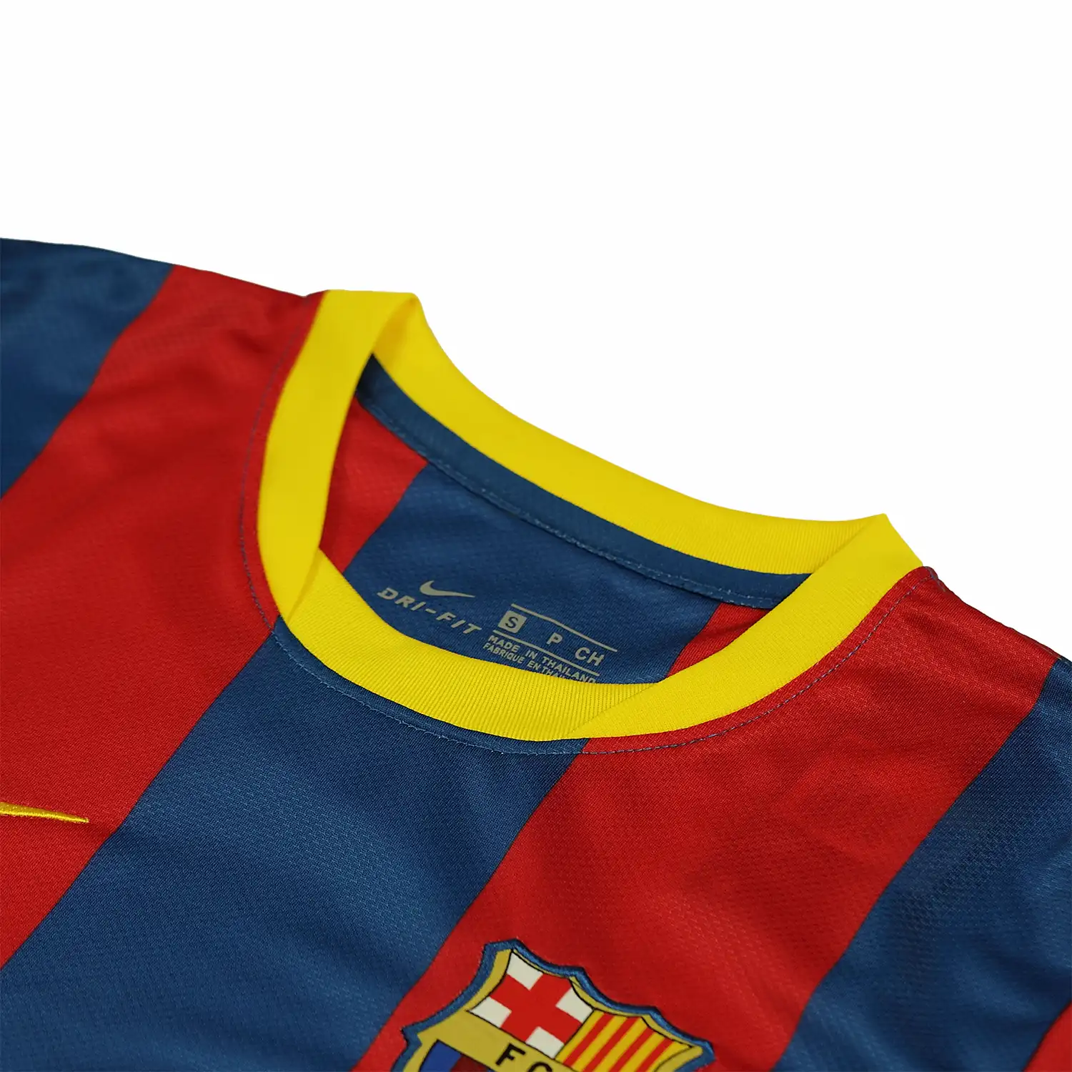 The Barcelona 2010-11 home shirt features the classic blaugrana vertical stripes, alternating between deep blue and vibrant garnet. The stripes are broad and evenly spaced, extending from the collar to the hem, which creates a timeless and elegant look.