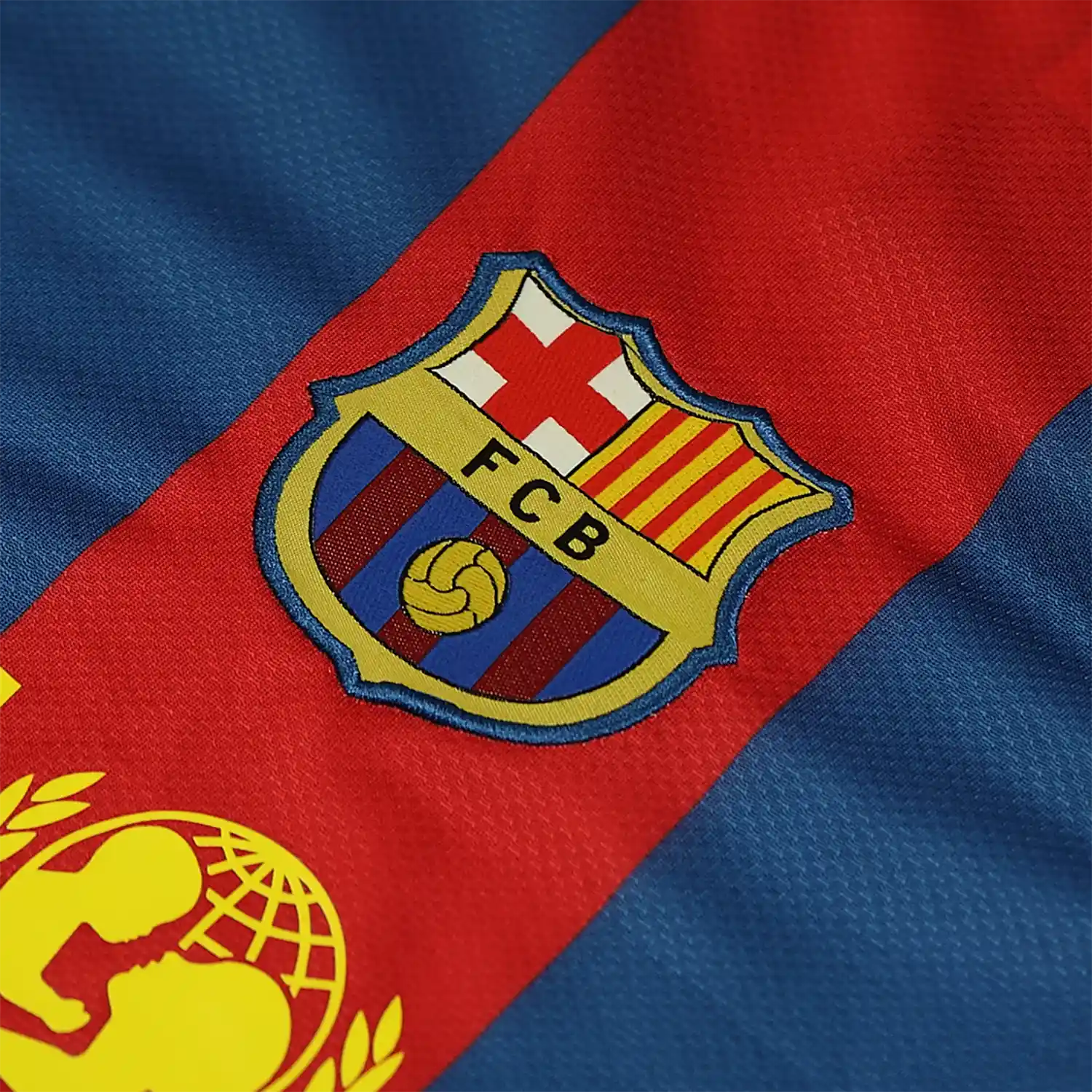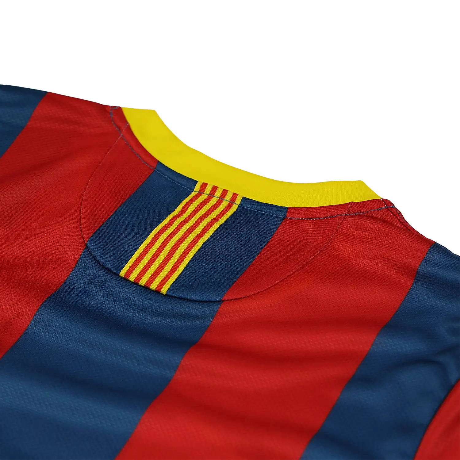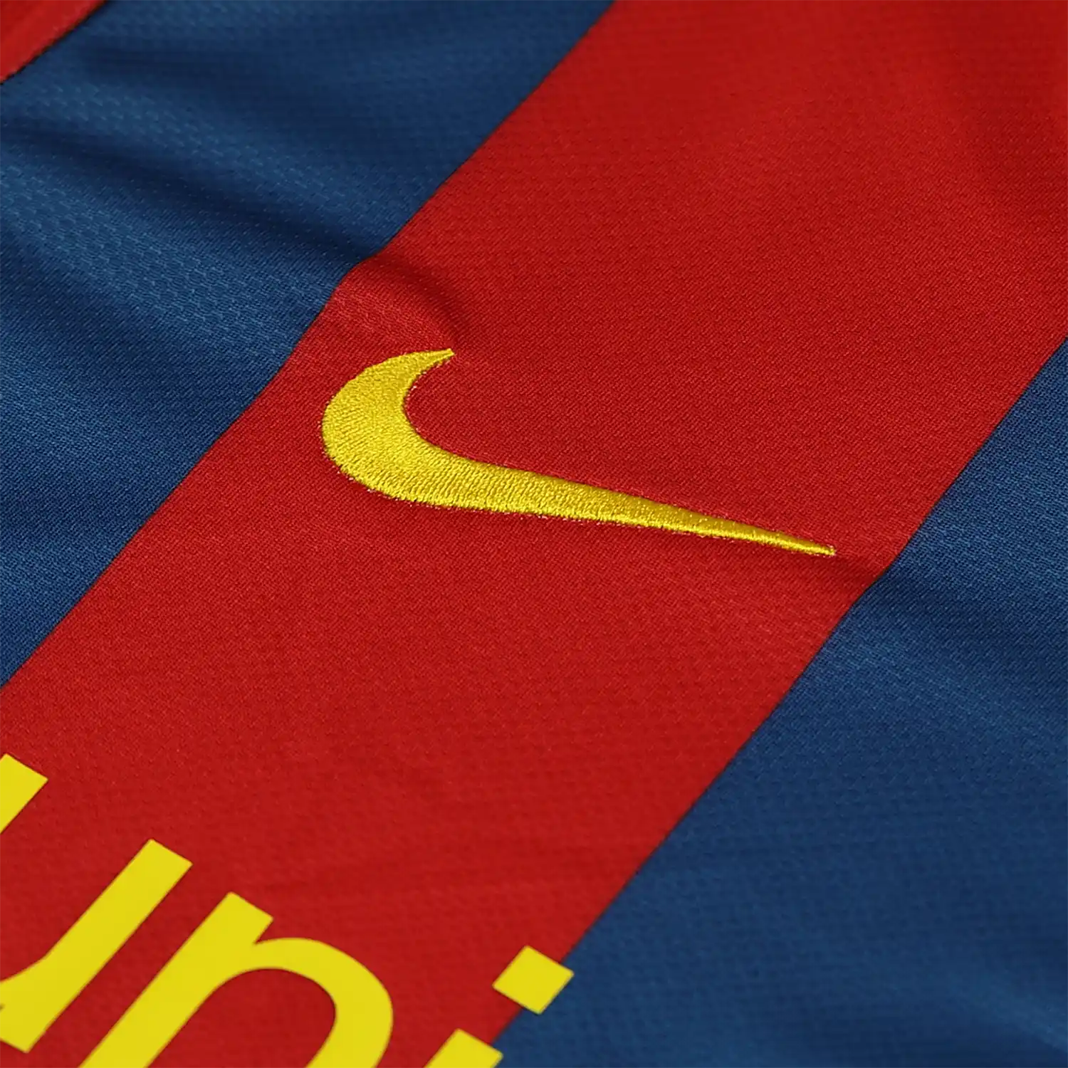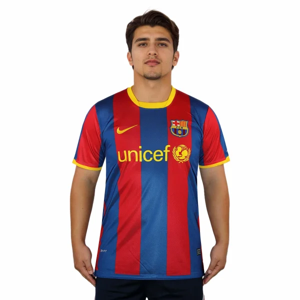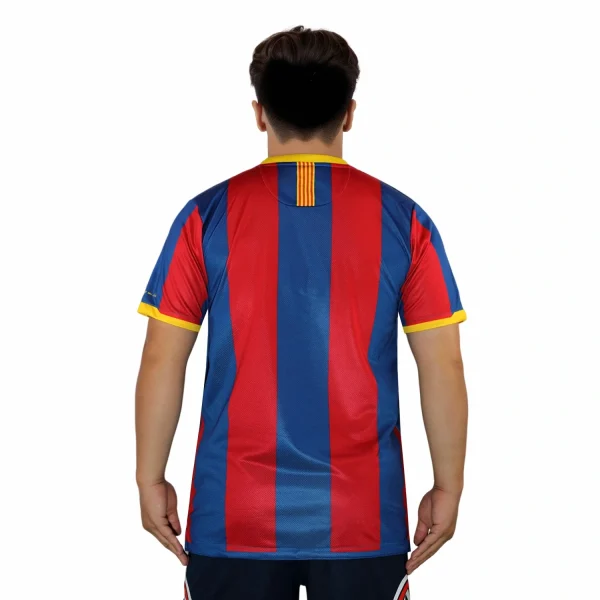 The Barcelona 2010-11 home shirt features the classic blaugrana vertical stripes, alternating between deep blue and vibrant garnet. The stripes are broad and evenly spaced, extending from the collar to the hem, which creates a timeless and elegant look.