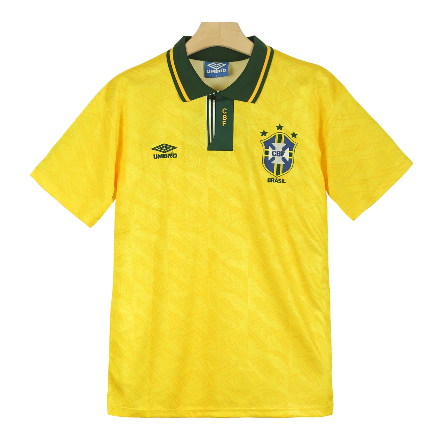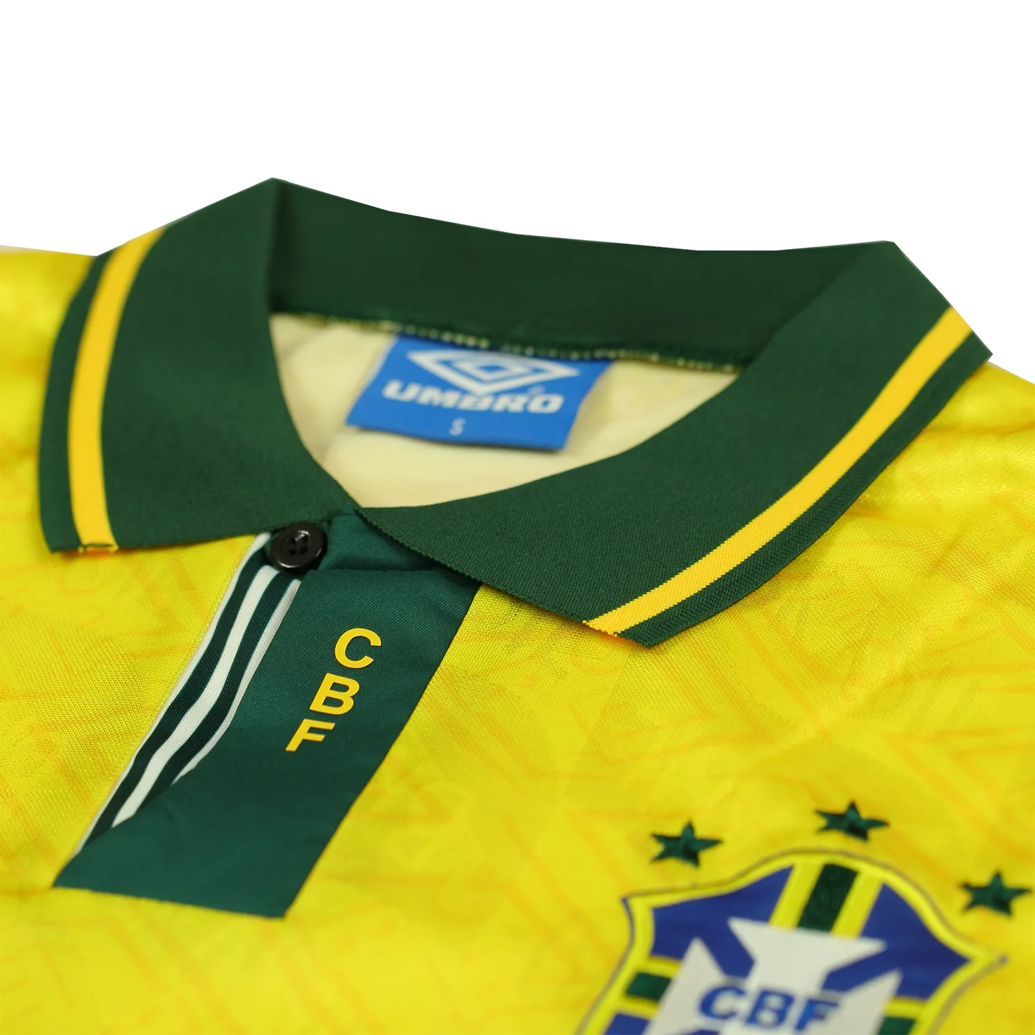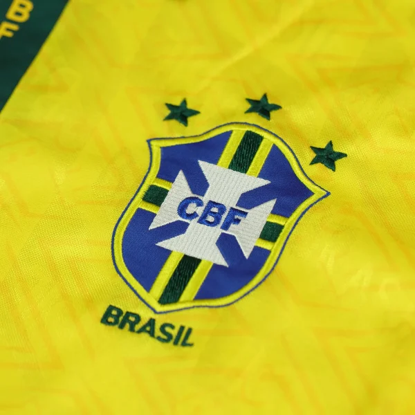 On the left chest, the Brazilian Football Confederation (CBF) crest is proudly embroidered, complete with three stars representing Brazil’s World Cup victories at that time. Opposite it on the right chest is the Umbro logo, signifying the shirt’s authenticity and quality. A unique feature of this shirt is the watermark pattern of the BRASIL crest subtly printed across the entire front, adding depth and texture without overwhelming the classic yellow base.