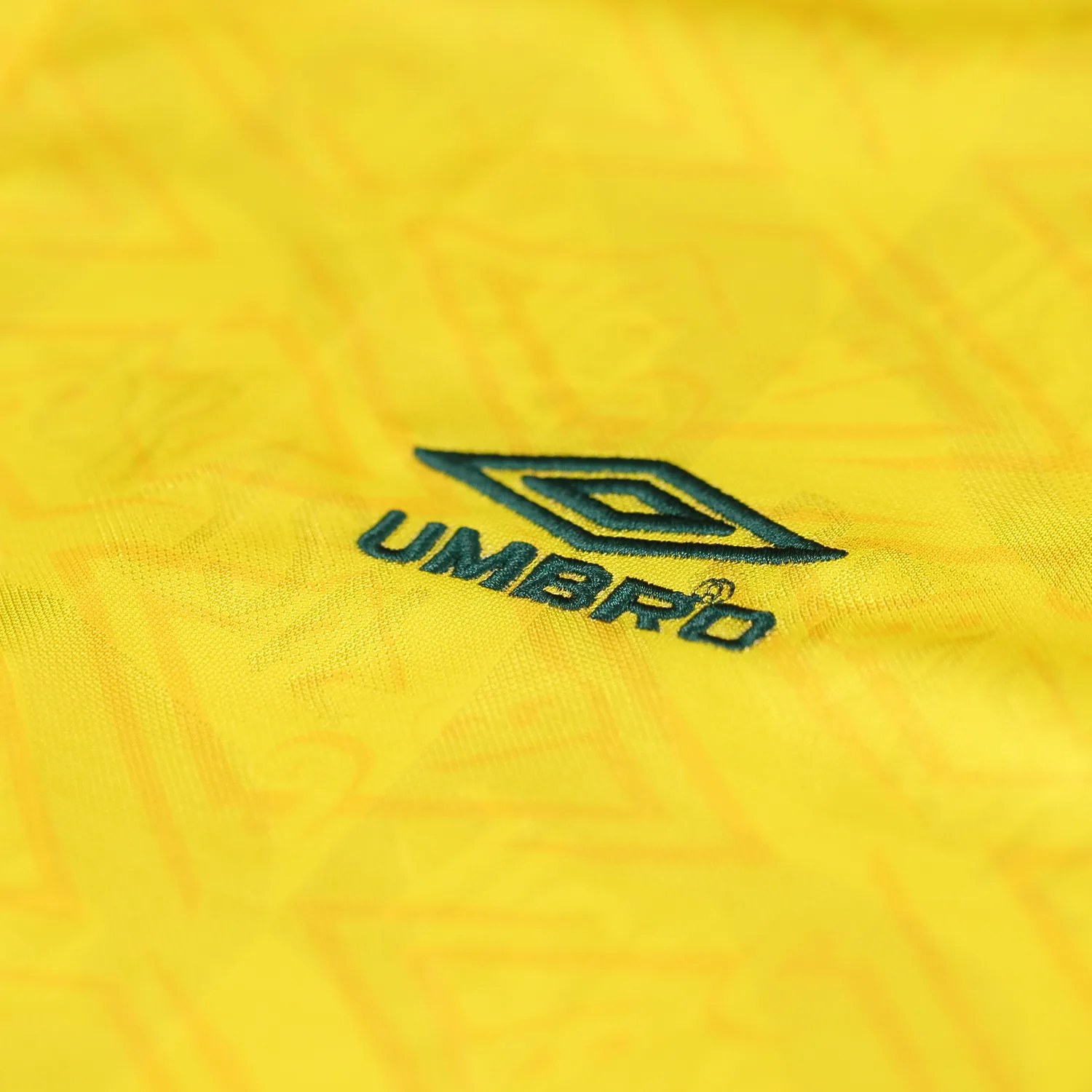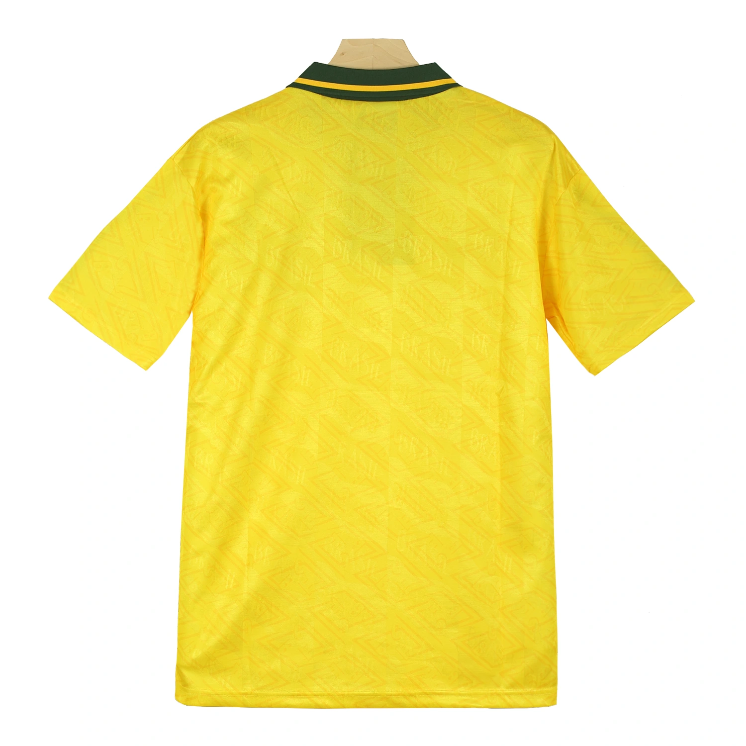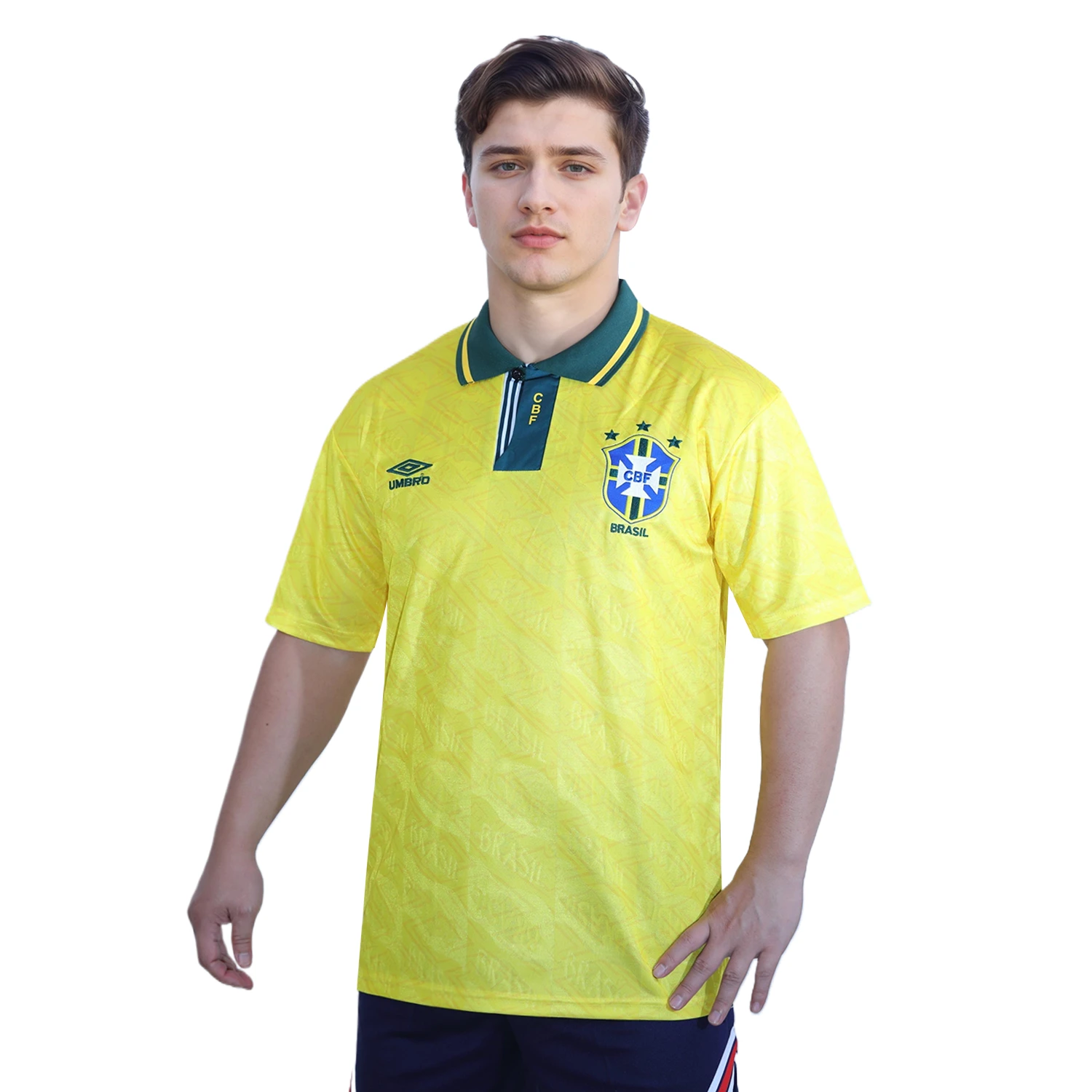 On the left chest, the Brazilian Football Confederation (CBF) crest is proudly embroidered, complete with three stars representing Brazil’s World Cup victories at that time. Opposite it on the right chest is the Umbro logo, signifying the shirt’s authenticity and quality. A unique feature of this shirt is the watermark pattern of the BRASIL crest subtly printed across the entire front, adding depth and texture without overwhelming the classic yellow base.