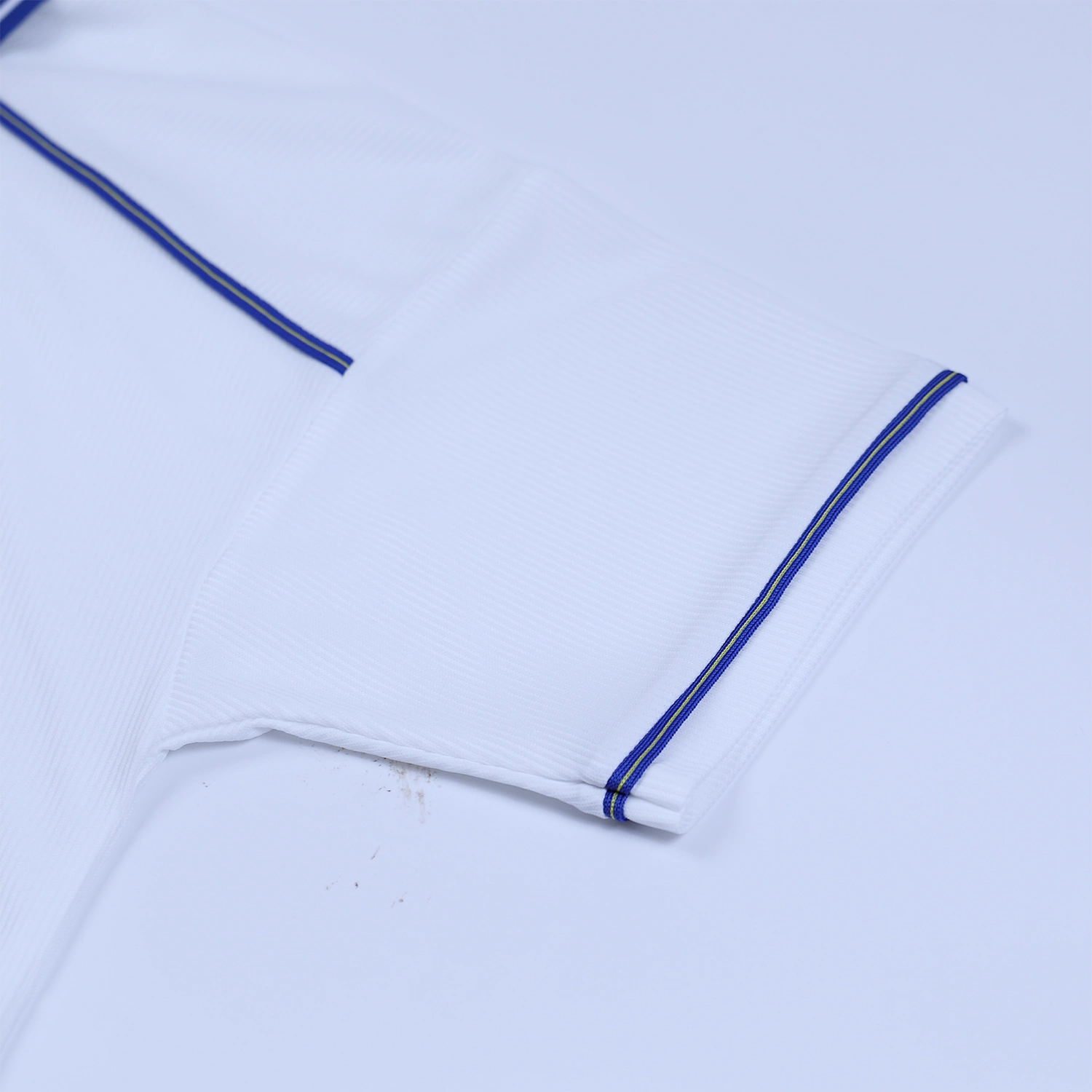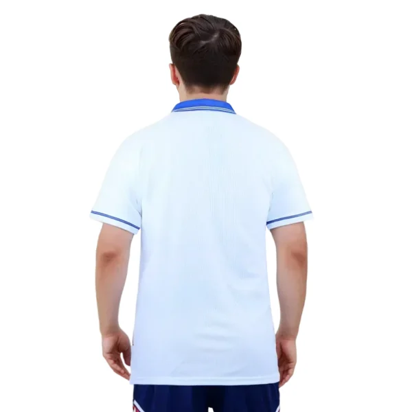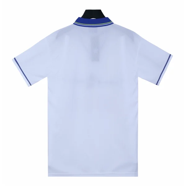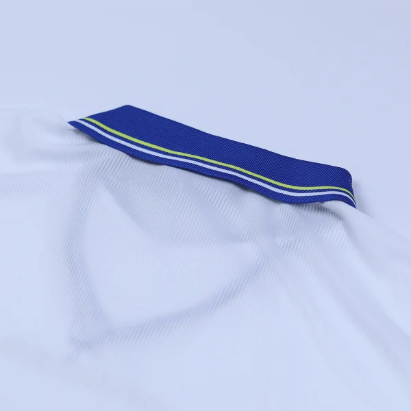 The Chelsea 1999-00 away shirt is notable for its distinctive design and color scheme, reflecting the club’s identity during that era. The shirt was manufactured by Umbro and is primarily characterized by a white base color. This choice aligns with Chelsea’s historical use of white for away games. The shirt features bold blue and yellow accents, integrated into elements such as the collar and sleeve trims, providing a vibrant contrast to the white base.