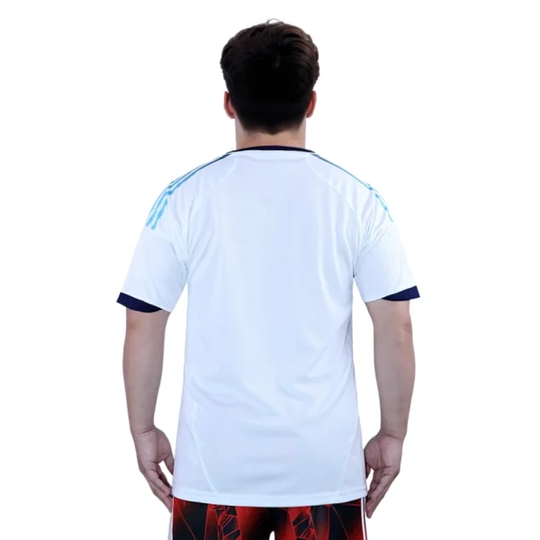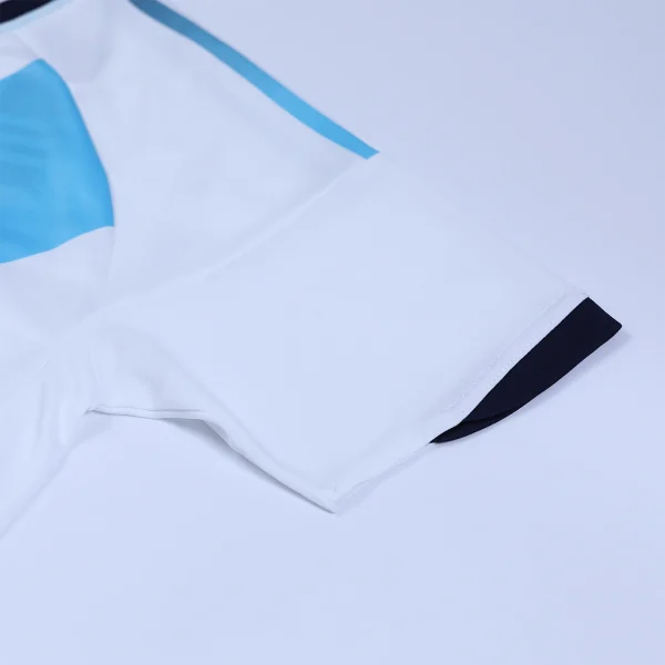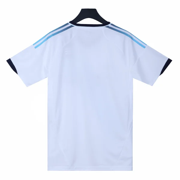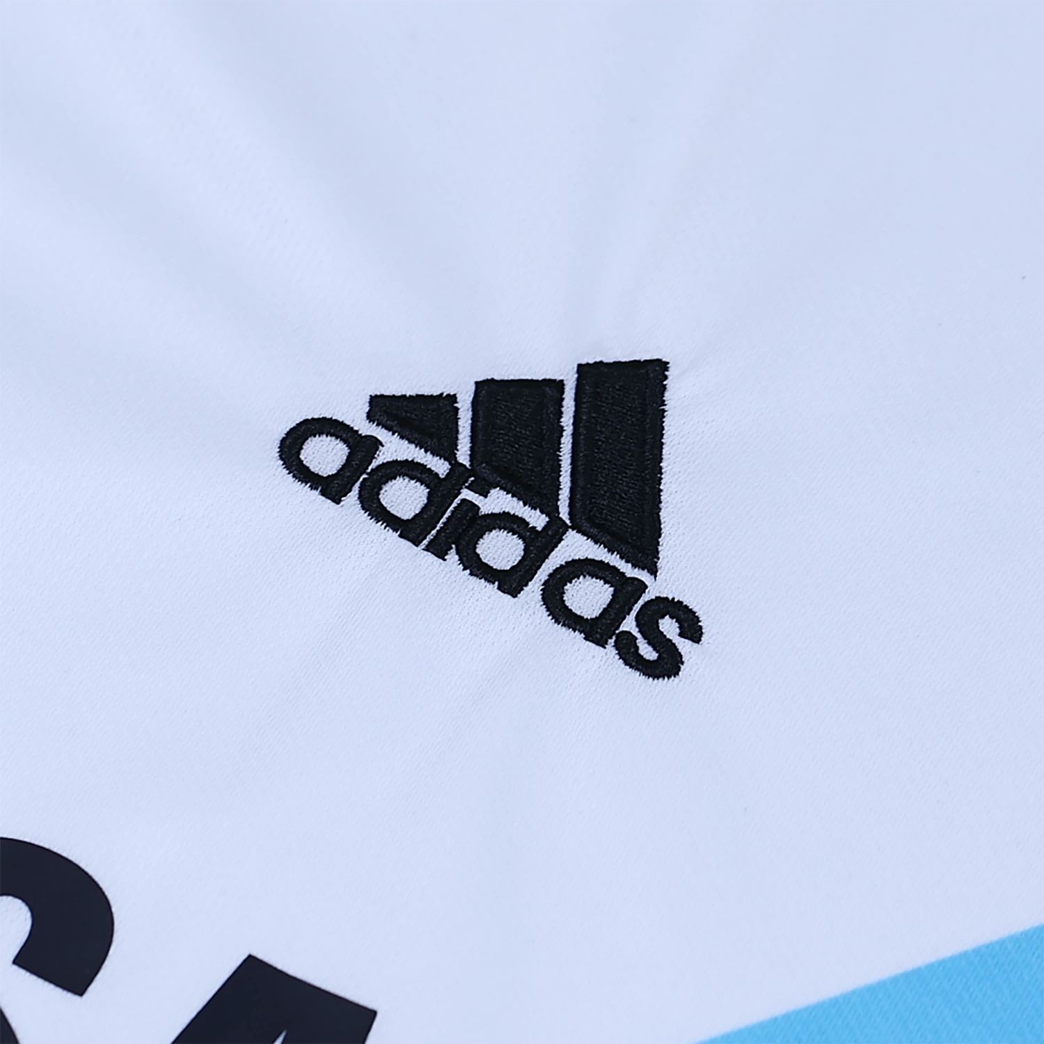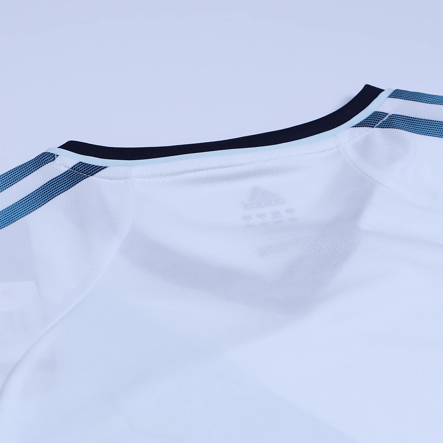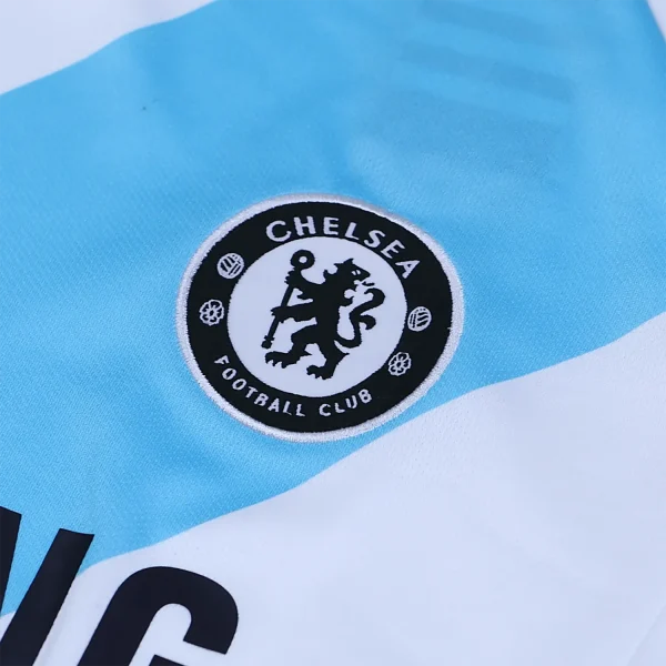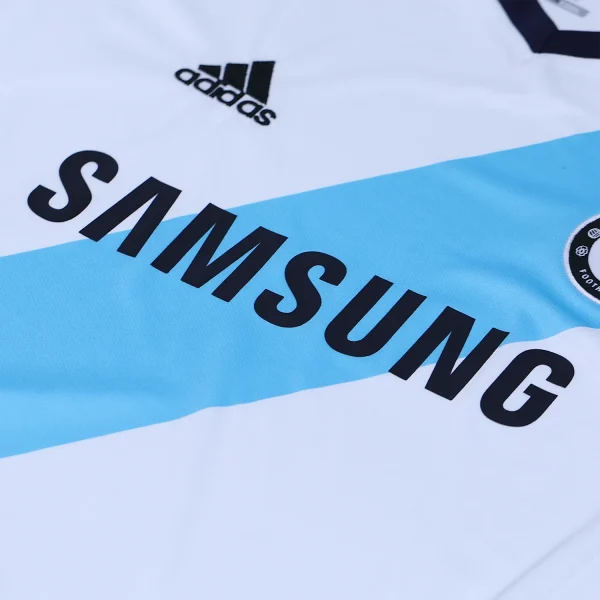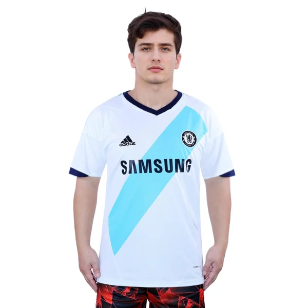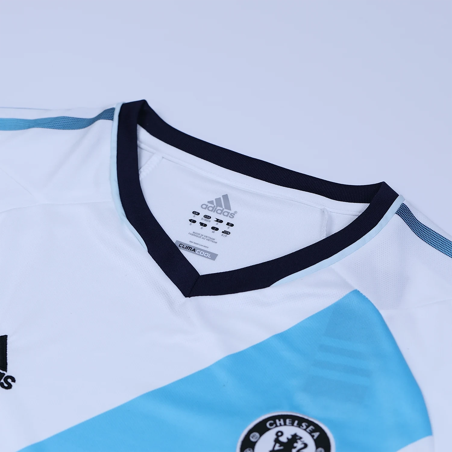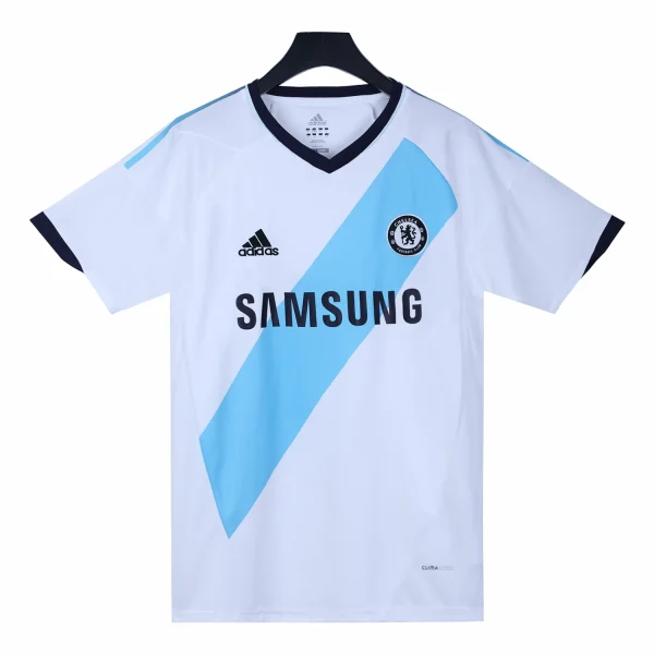The Chelsea 2012-13 Away Shirt, crafted by Adidas, features a predominantly white design with striking blue accents. This includes a blue long stripe on the chest and blue stripes on the sleeves, embodying a sleek and modern look.