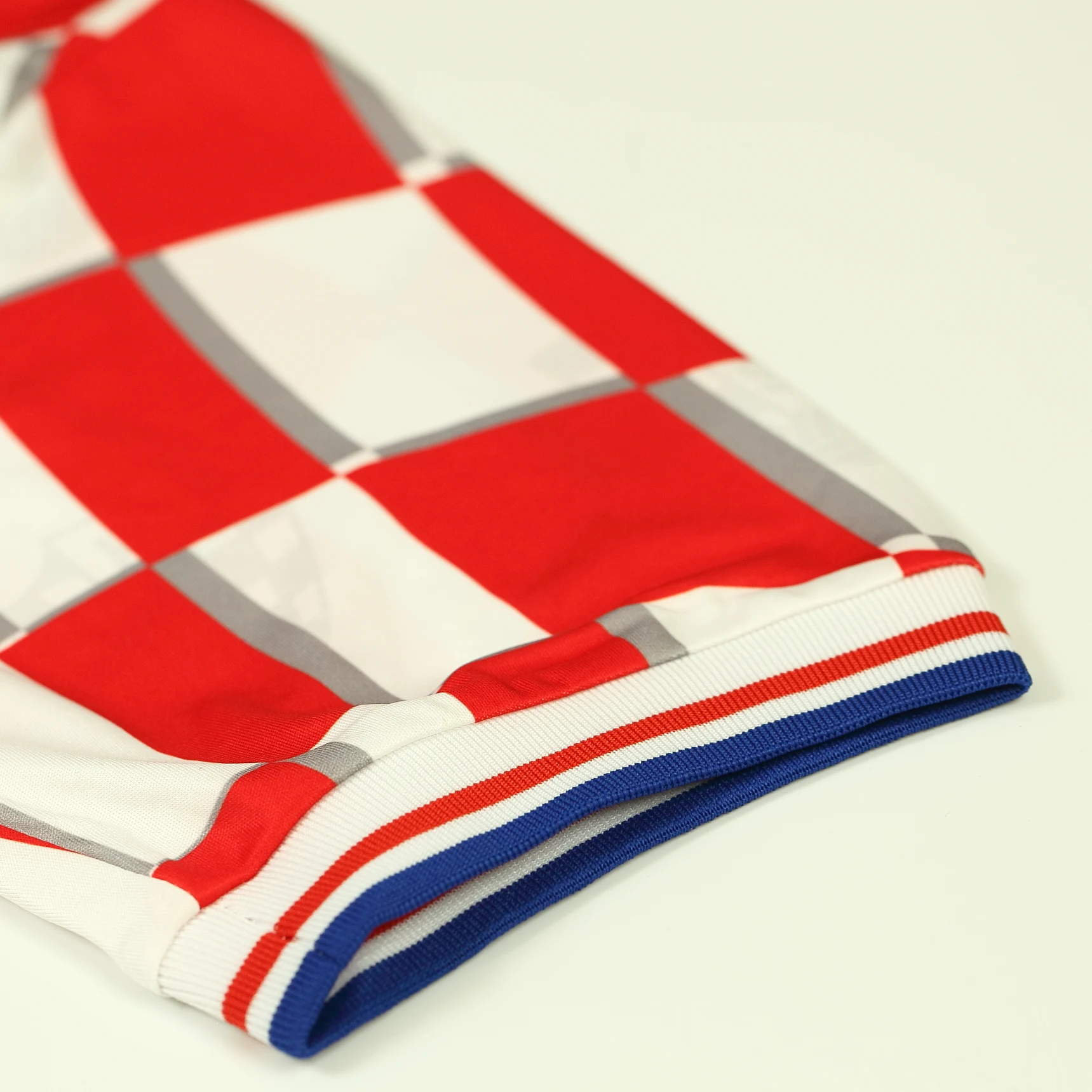 The shirt features Croatia’s iconic red and white checkered pattern, inspired by the country’s national flag and coat of arms. This bold design covers the right side of the shirt, with the left side in solid white, creating a striking and unique visual effect. The collar is a traditional polo style in blue, adding a touch of contrast and complementing the red and white checks. The sleeves are predominantly white, with the checkered pattern continuing along the right shoulder, maintaining the cohesive and dynamic design.