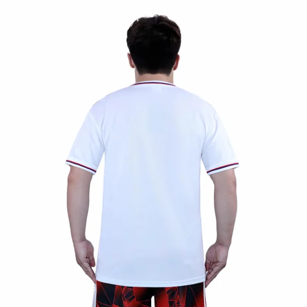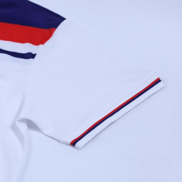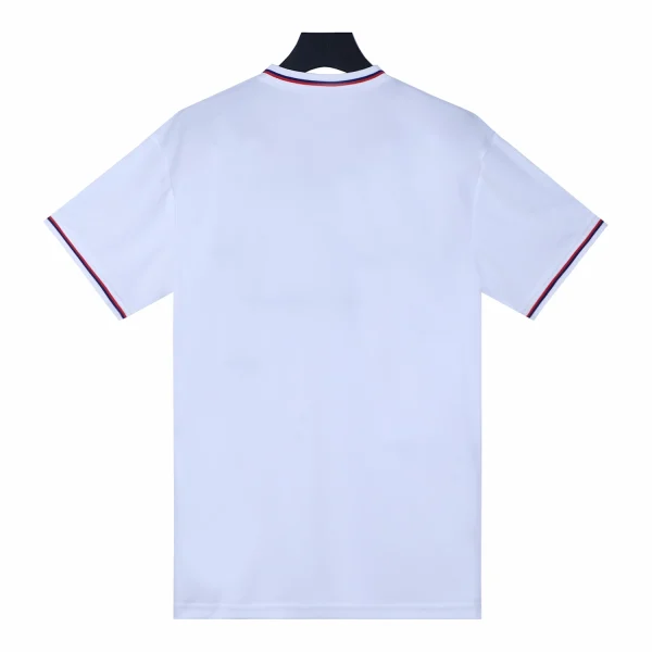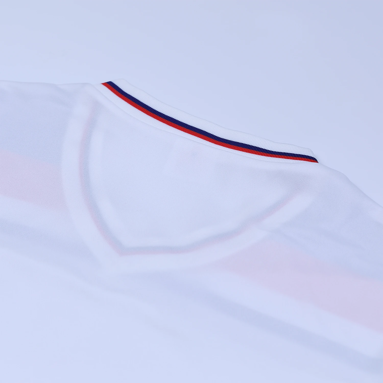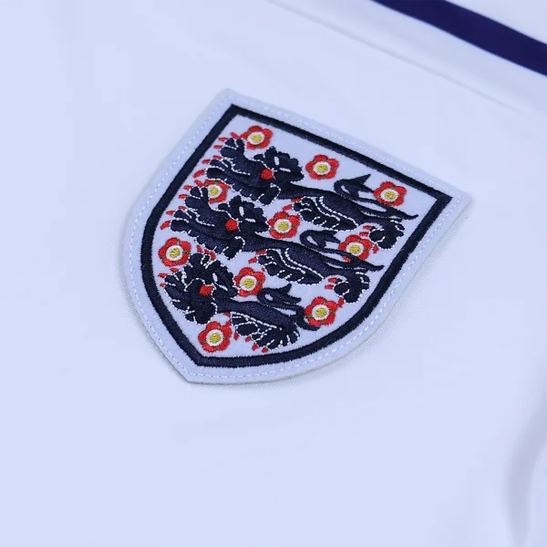 A notable feature of the shirt is its collar. It has a classic, rounded design with a slight v-neck cut, and is finished with a red and blue trim, echoing the colors of the England flag. This detail adds a touch of elegance and complements the shirt’s overall design.