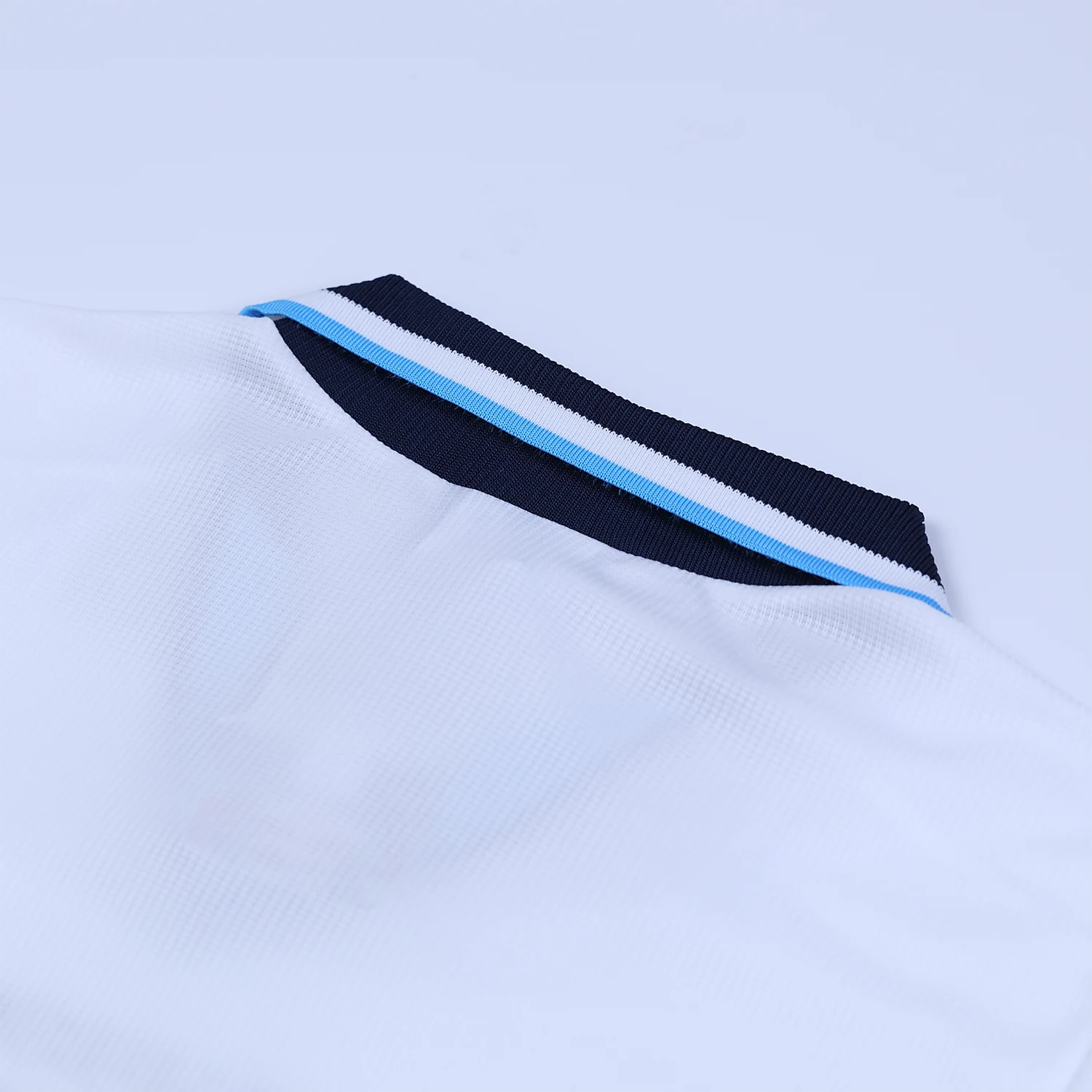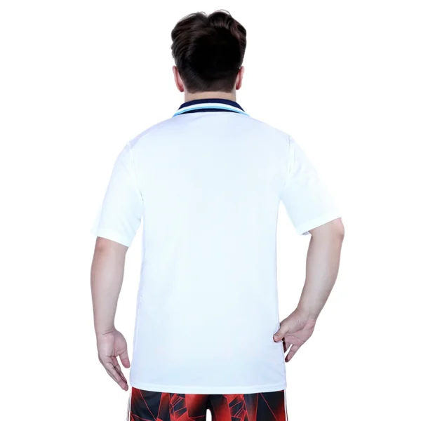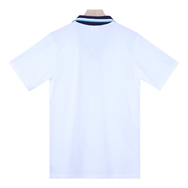 The design features a retro look with a lightweight construction, short sleeves, and Polo collar for comfort. The iconic Three Lions logo is prominently displayed on the center chest, adding to its nostalgic appeal