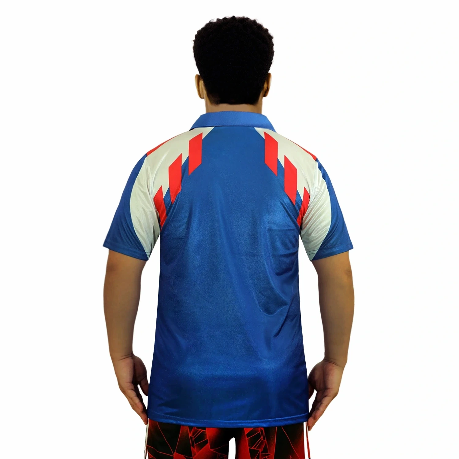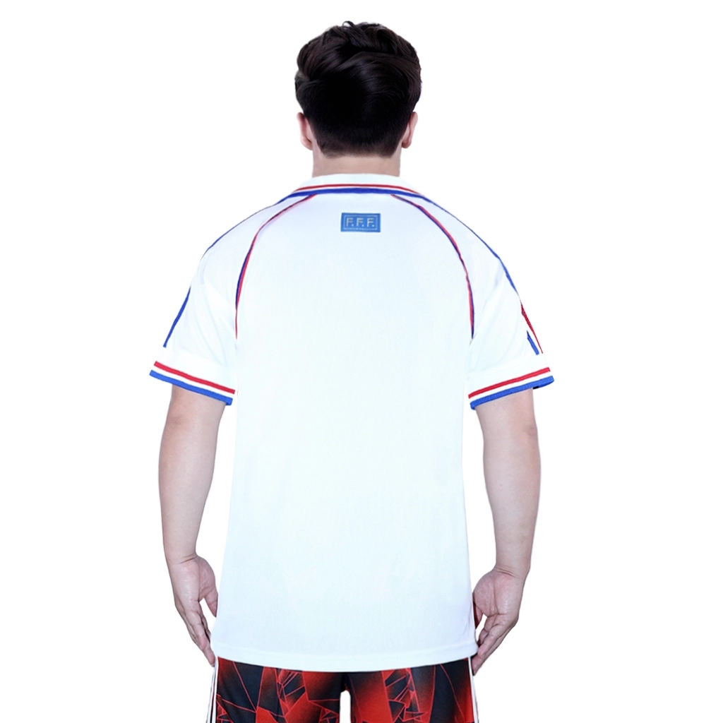 The shirt features France’s traditional deep blue base color, which is both vibrant and rich, reflecting the nation’s football heritage. The design is highlighted by bold white and red accents that add a dynamic and stylish touch to the jersey.