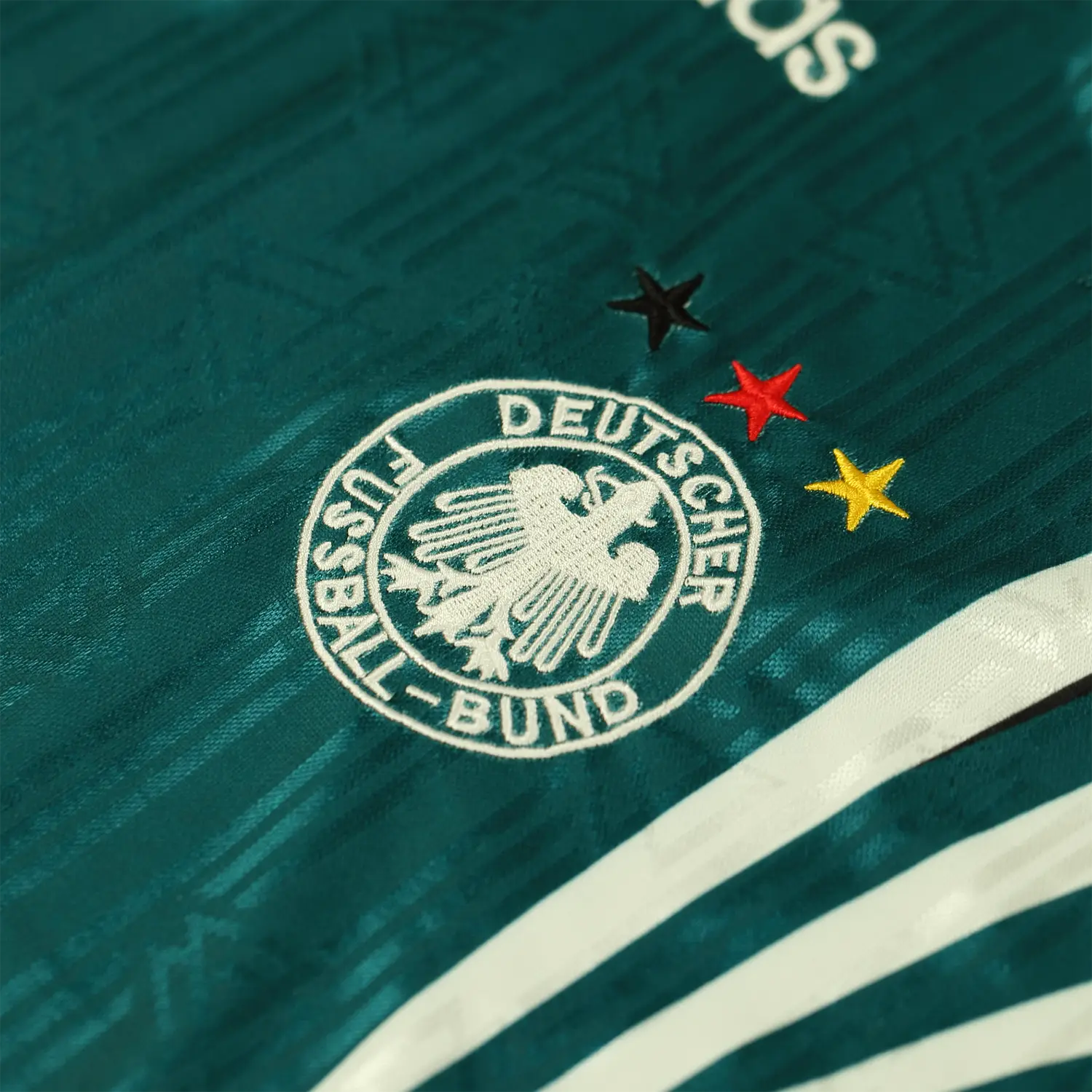 The Germany 1996 away shirt brings back the vibrant design of the 90s for an instantly recognizable look. The era-evoking loose fit cut, the printed white 3-Stripes curving down from the shoulders and the embroidered federation badge create a striking contrast with the iconic green backdrop.
