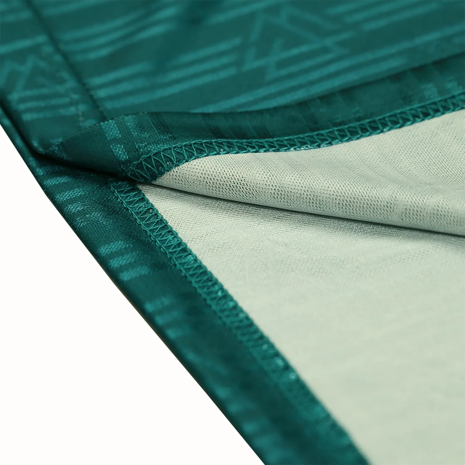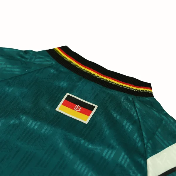 The shirt is primarily green, a bold choice that stands out in Germany’s football apparel history. The collar is a classic polo style, in green with a subtle trim of black, red, and gold, mirroring the chest stripe.