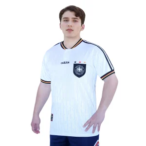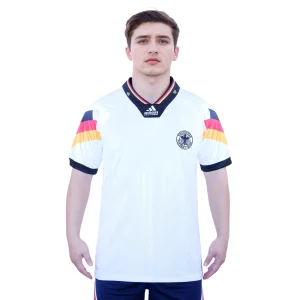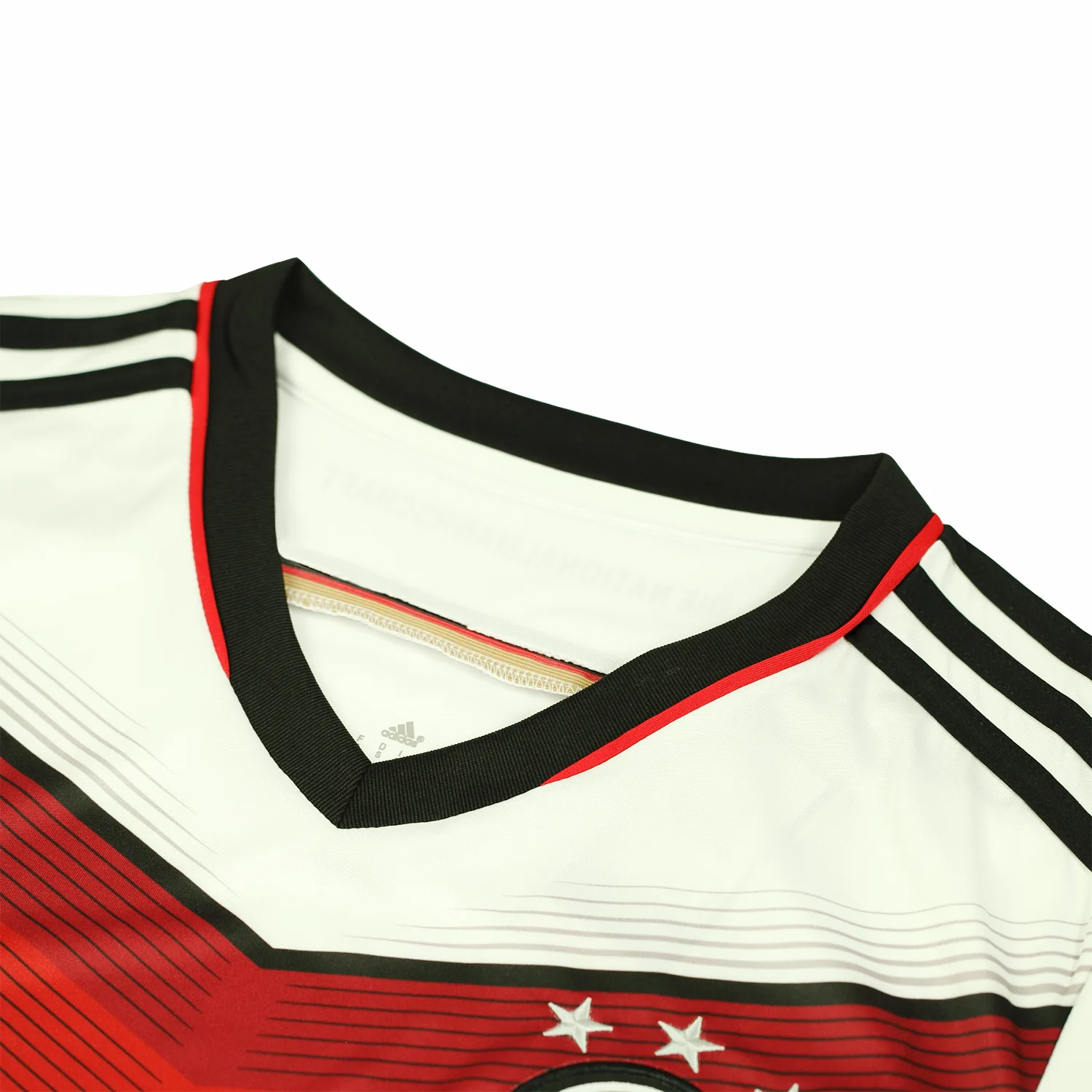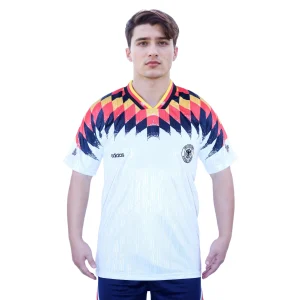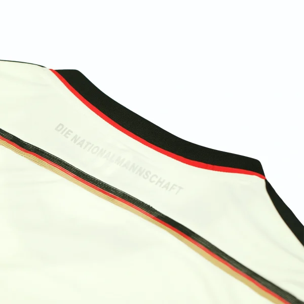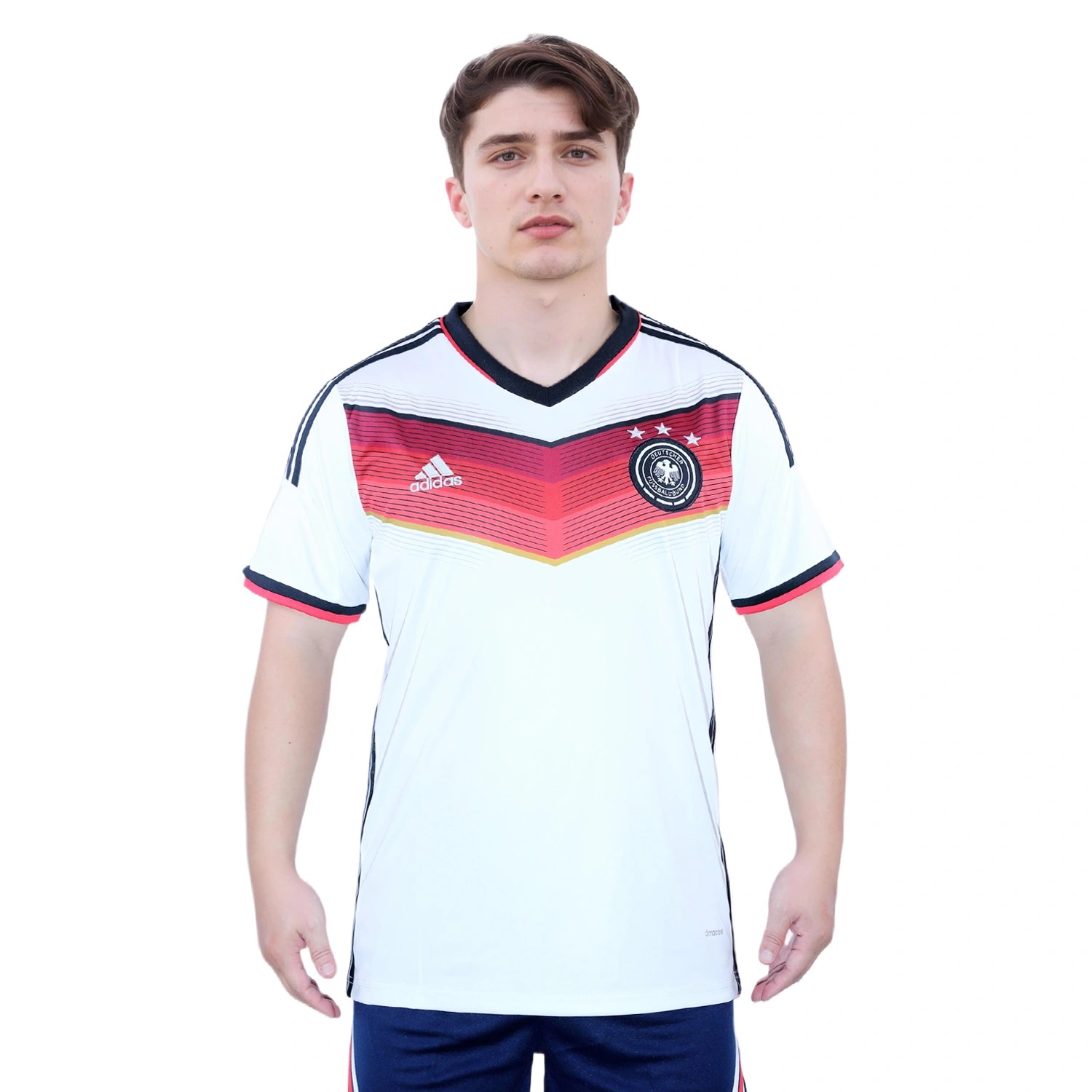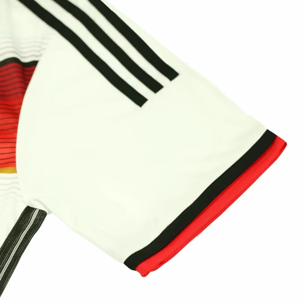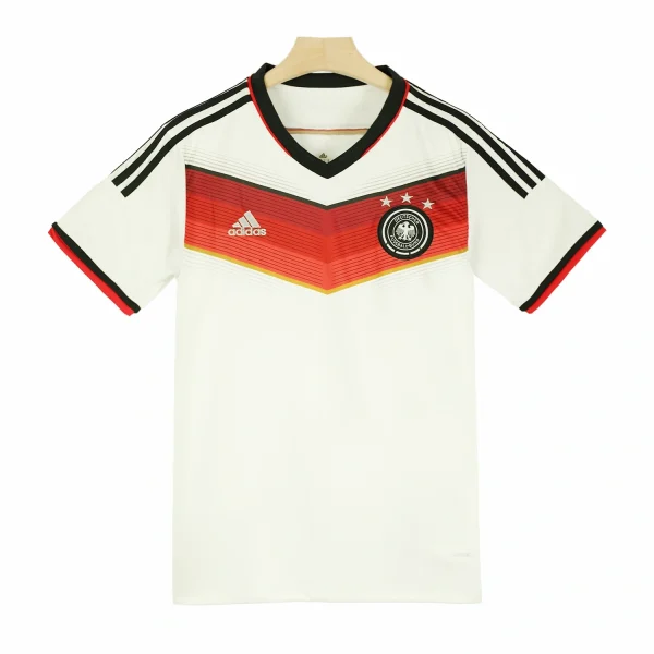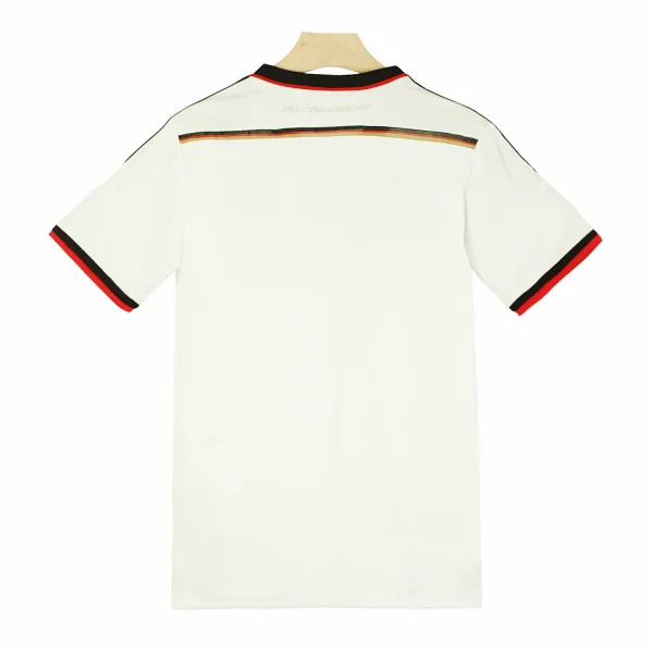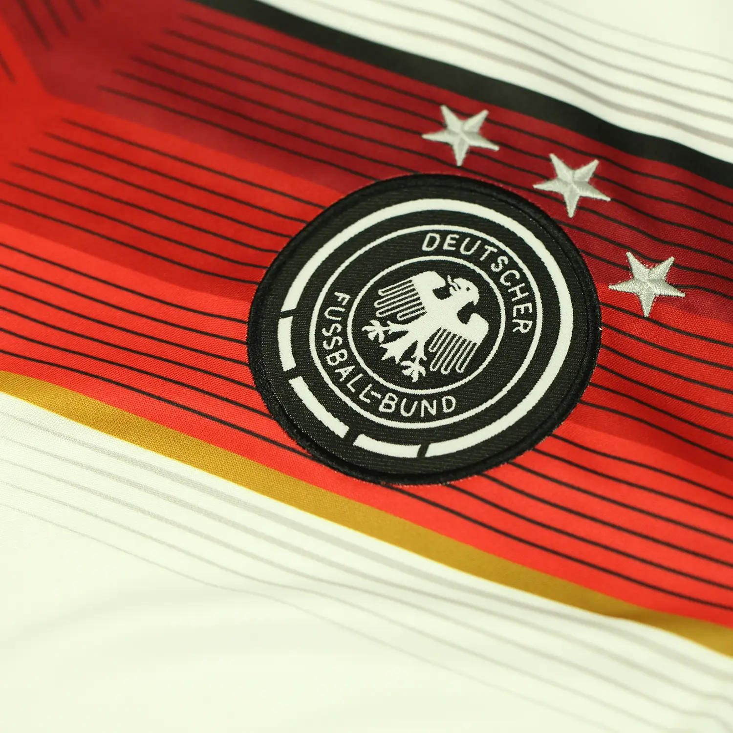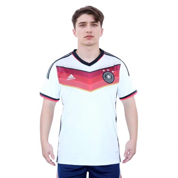 During the 2014 FIFA World Cup, the Germany national football team’s home jersey stood out for its simple yet classic design. Created by Adidas, the jersey features a predominantly white base with black, red, and gold accents, reflecting the colors of the German flag.
