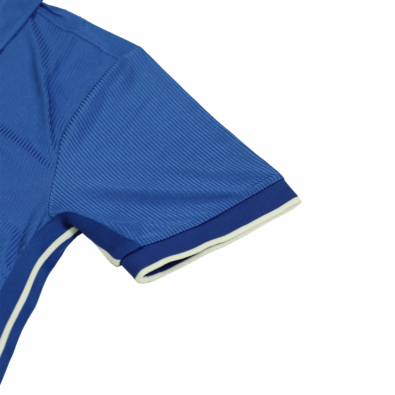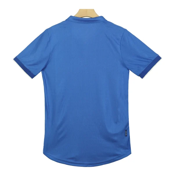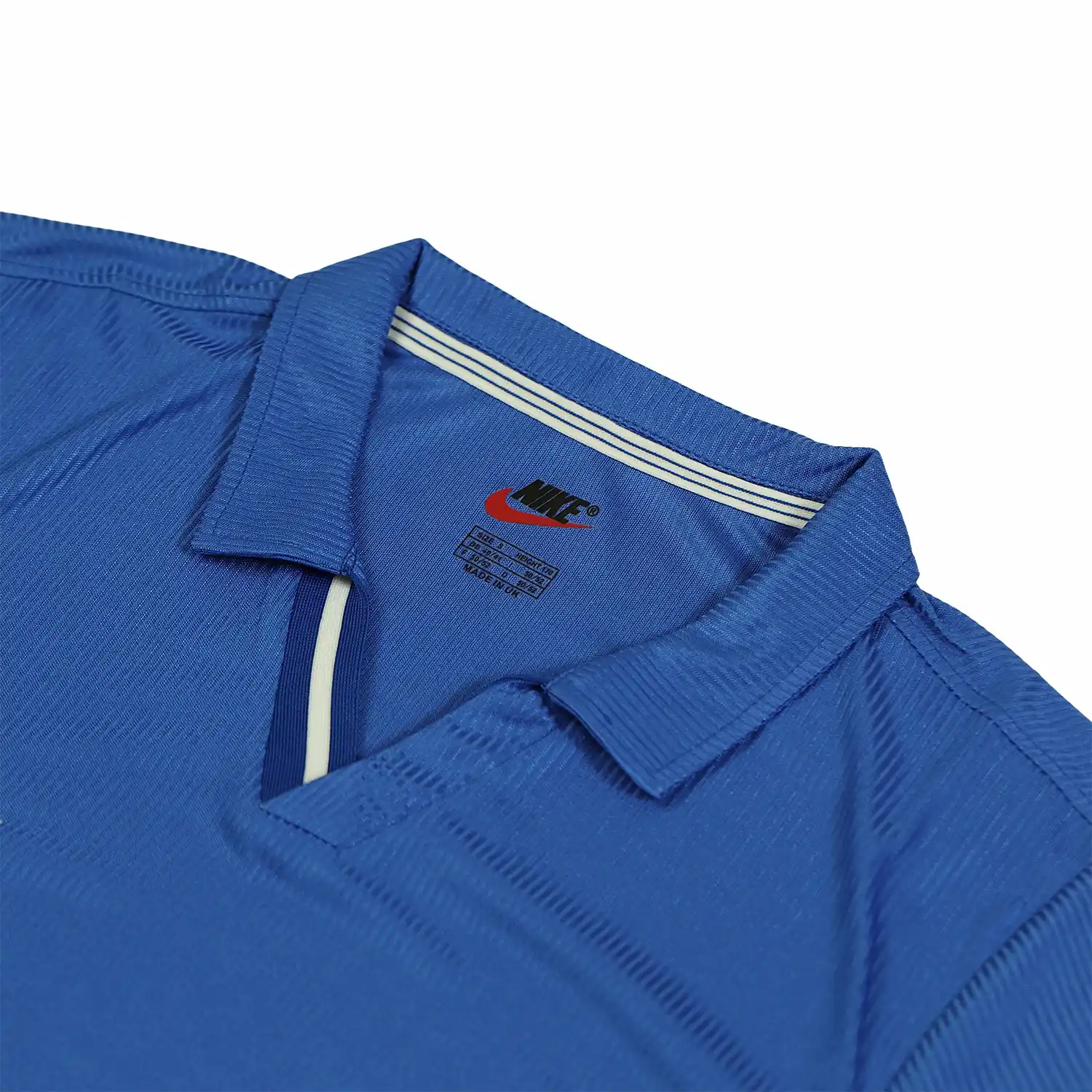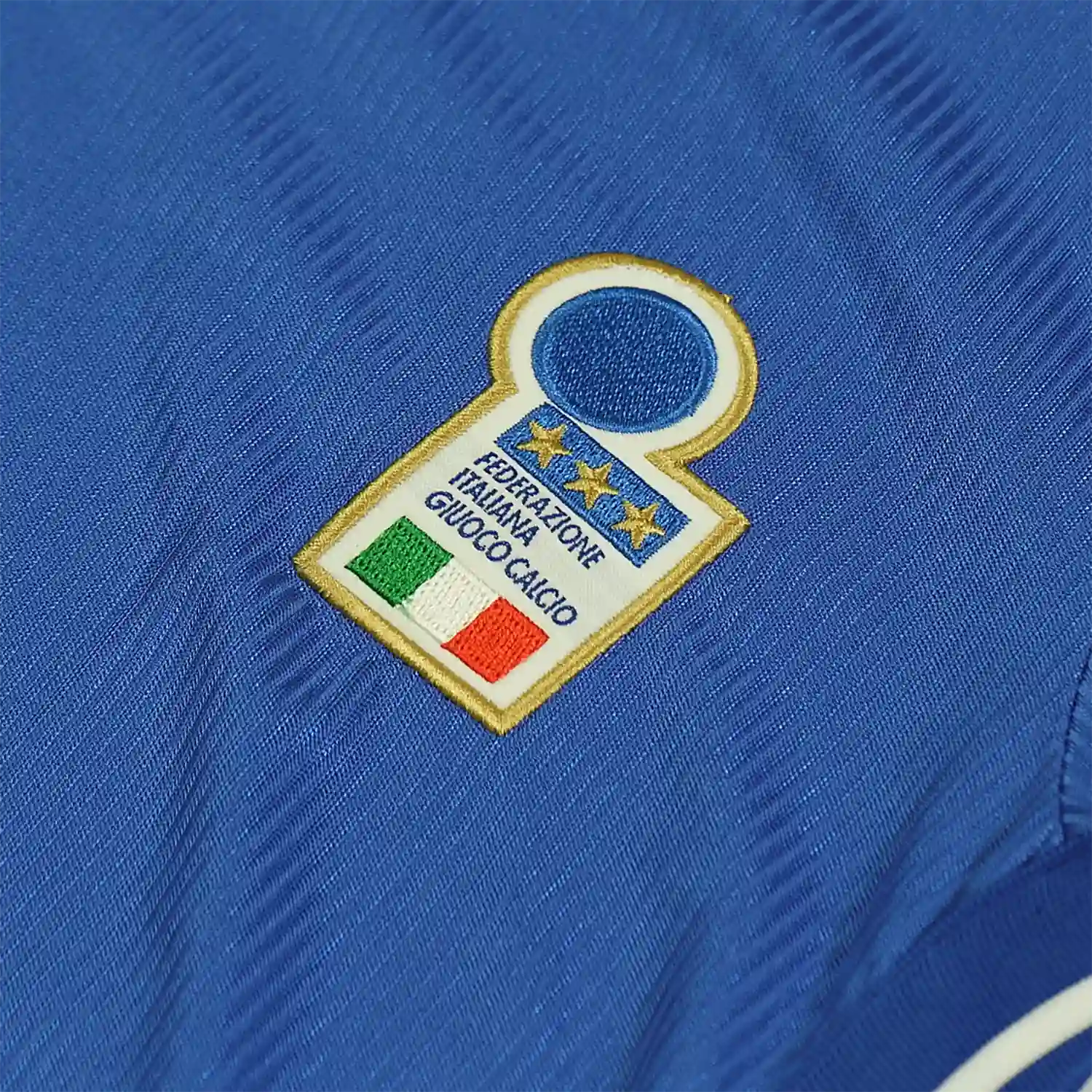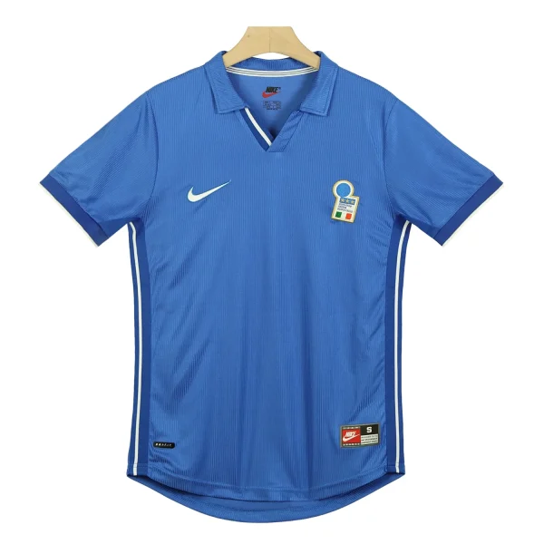 The Italy 1998 home shirt is a classic piece of football memorabilia, known for its historical significance and iconic design. The shirt has a traditional polo-style collar, with a blue trim that complements the overall design.