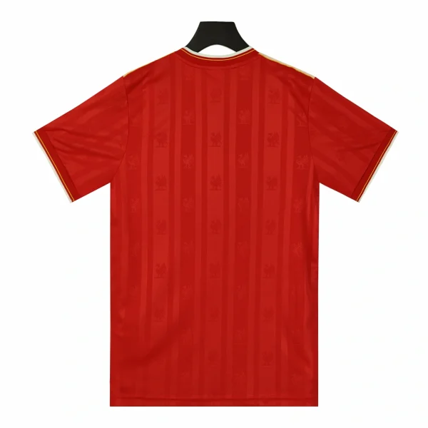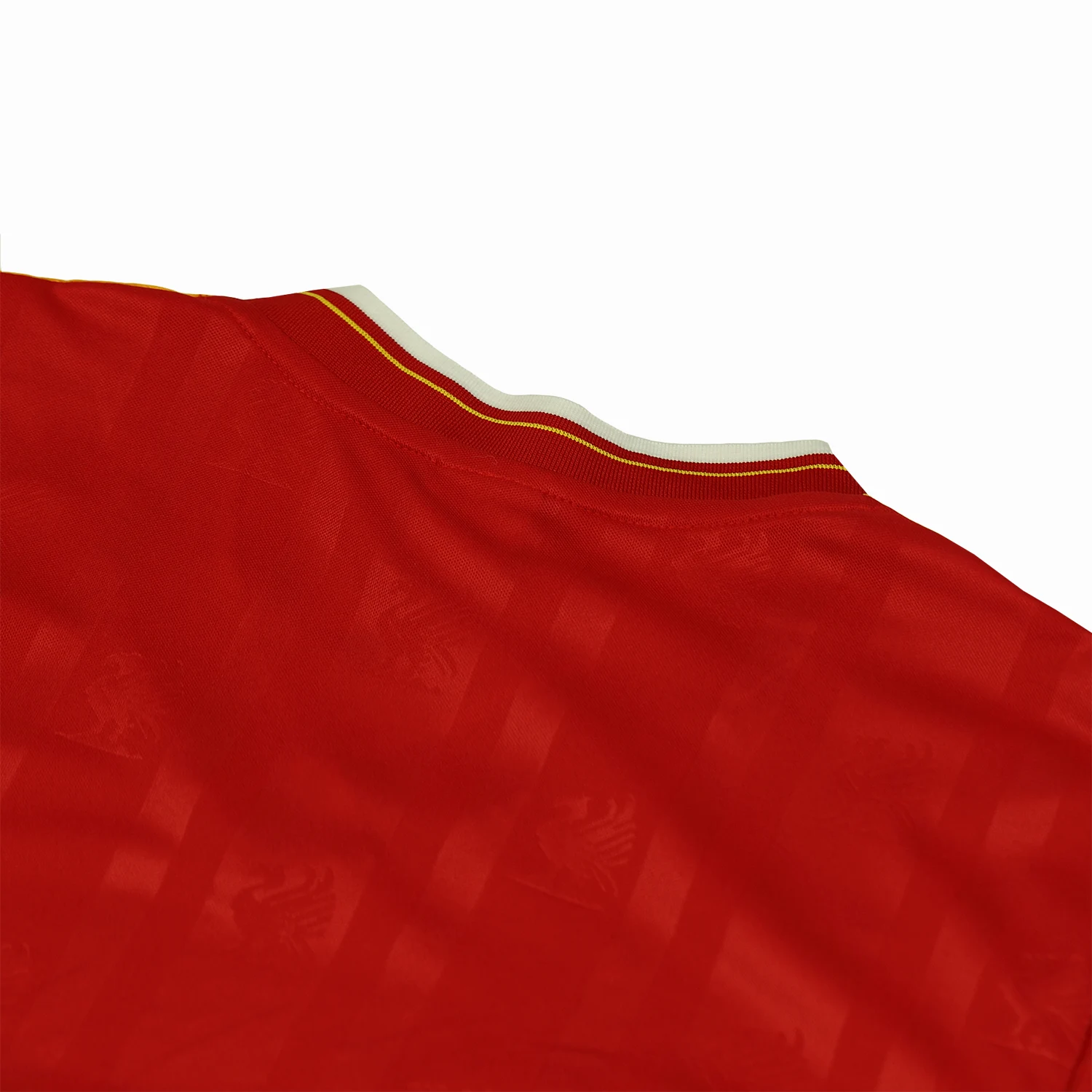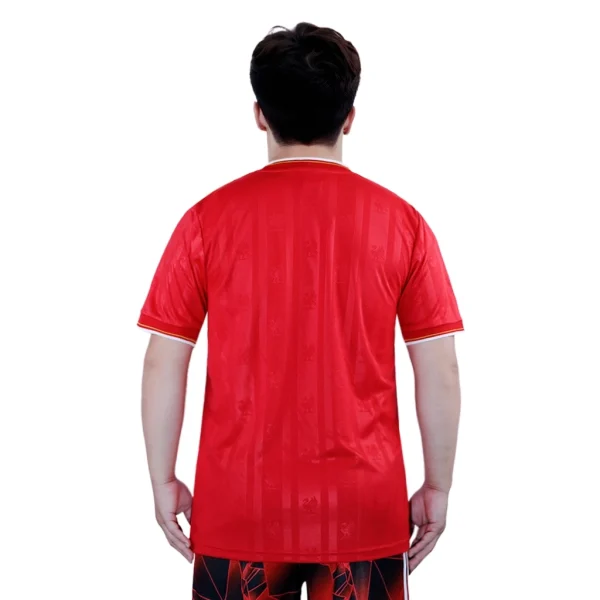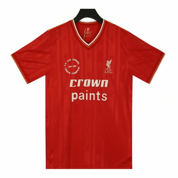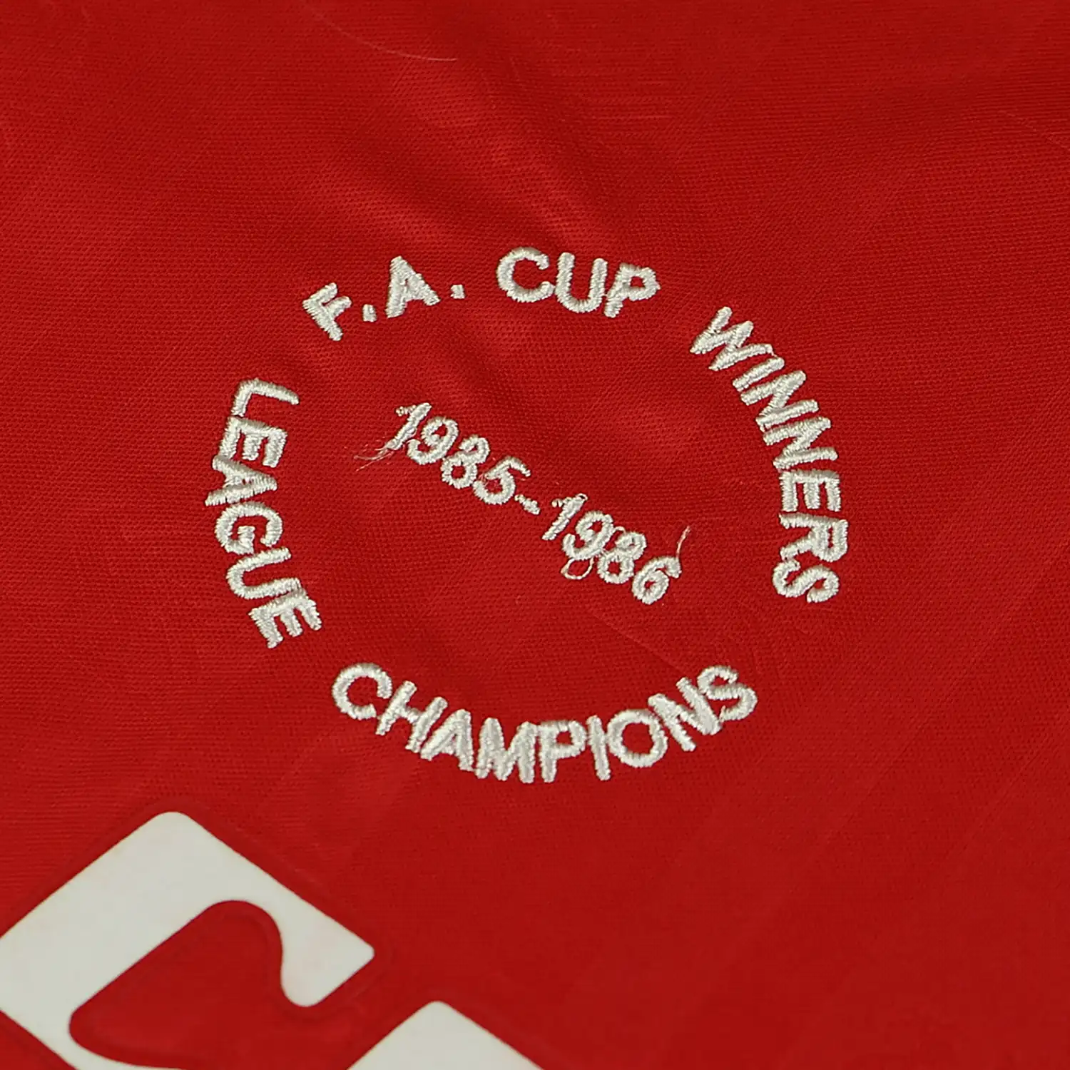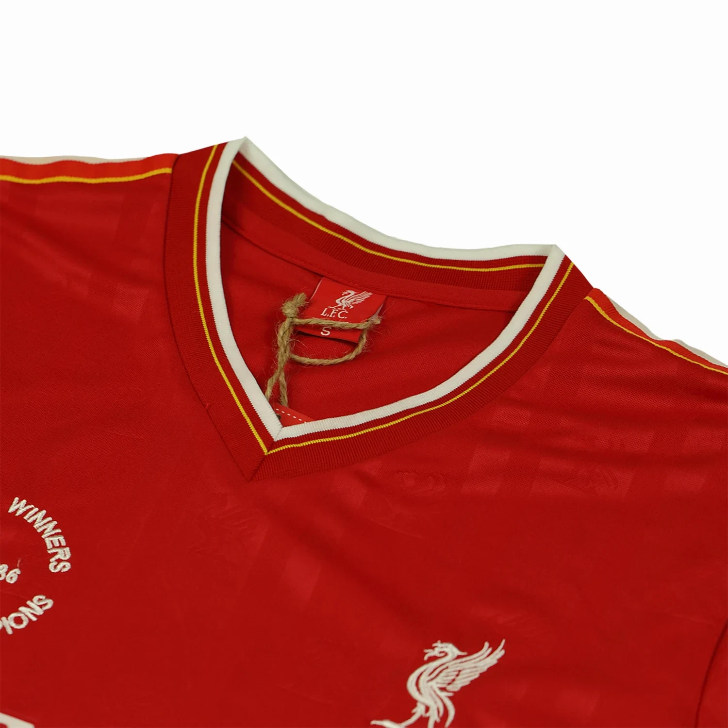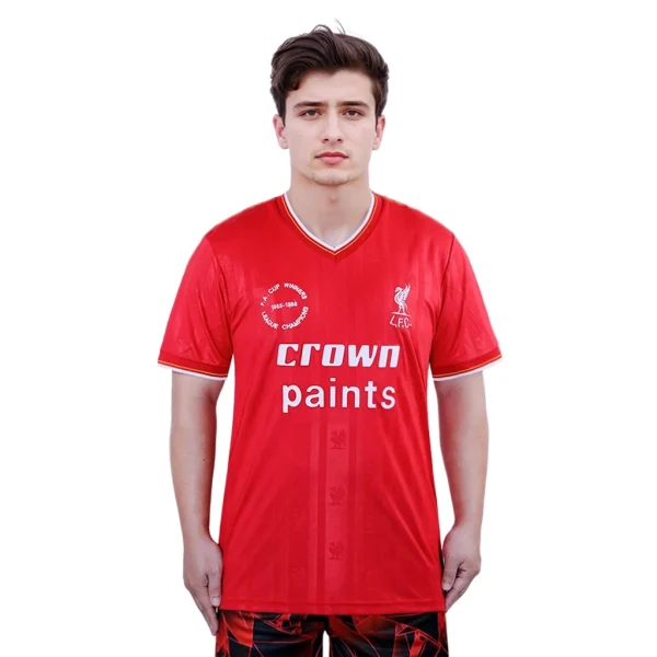 This particular design was worn by legendary players such as Kenny Dalglish, Ian Rush, and Jan Molby, making it a significant part of Liverpool’s rich football heritage. The shirt’s design includes white accents and a v-neck collar, which were popular styles in the mid-1980s. It was used during a season where Liverpool competed in various competitions, including the EFL First Division and the FA Cup, further solidifying its historical importance.