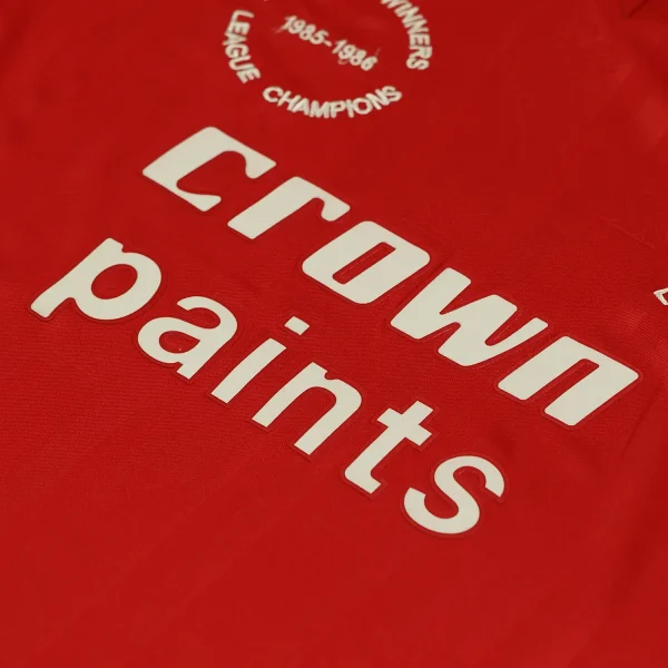 The Liverpool 1986-87 home shirt is a notable piece of football history, characterized by its vibrant red color and classic design elements. Manufactured by Adidas, the shirt features the iconic CROWN PAINTS logo prominently displayed across the chest, which was a common branding for Liverpool during that era. The shirt is made from 100% polyester, ensuring durability and comfort for players on the pitch.
