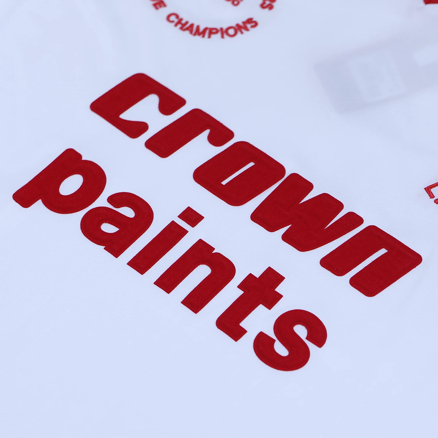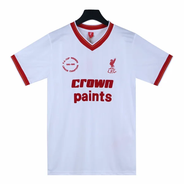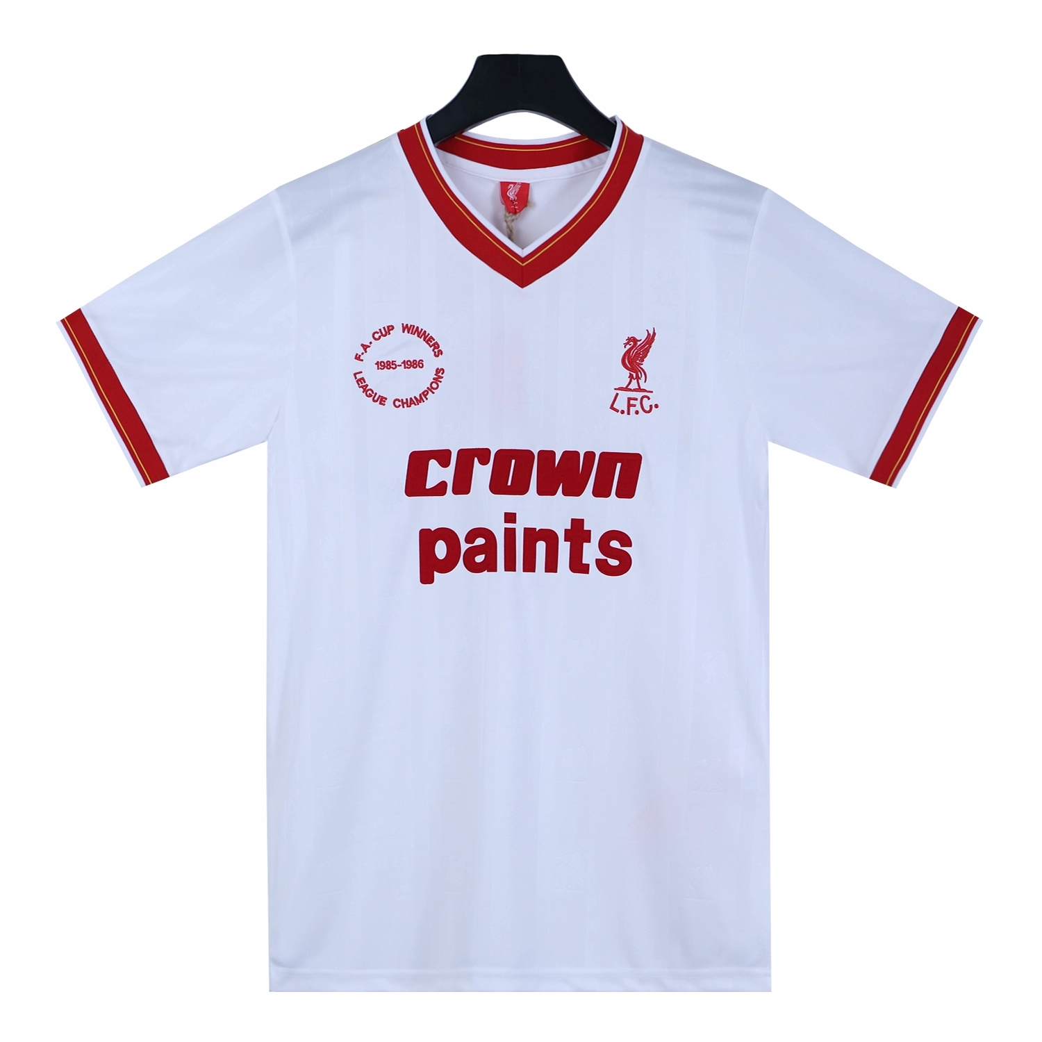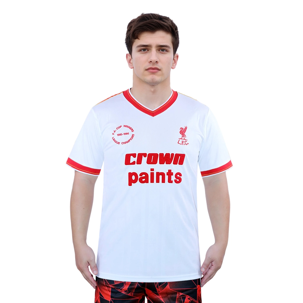 The design includes the iconic CROWN PAINTS sponsor logo prominently displayed across the chest, which was styled in two lines for better visibility on television screens, embroidered in a distinctive style, which was notably used during the League Cup Final. This shirt is a cherished item for collectors and fans, symbolizing a significant era in Liverpool FC’s storied past.
