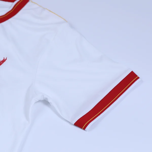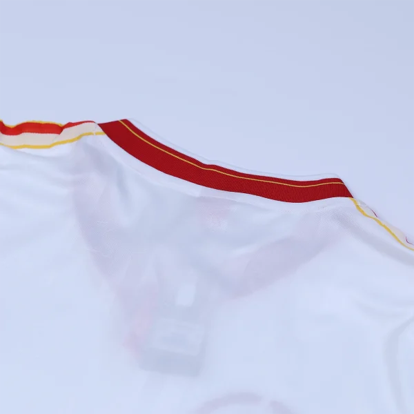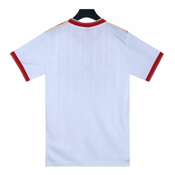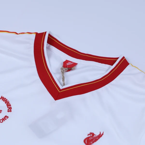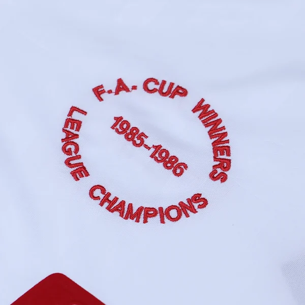 The Liverpool 1986-87 away shirt, crafted by Adidas, is a classic piece of football history. This shirt was worn during a season where Liverpool achieved significant success, including winning the league and cup double. The shirt also features a classic v-neck design and is characterized by its smooth texture, which was typical of Adidas kits from that era.