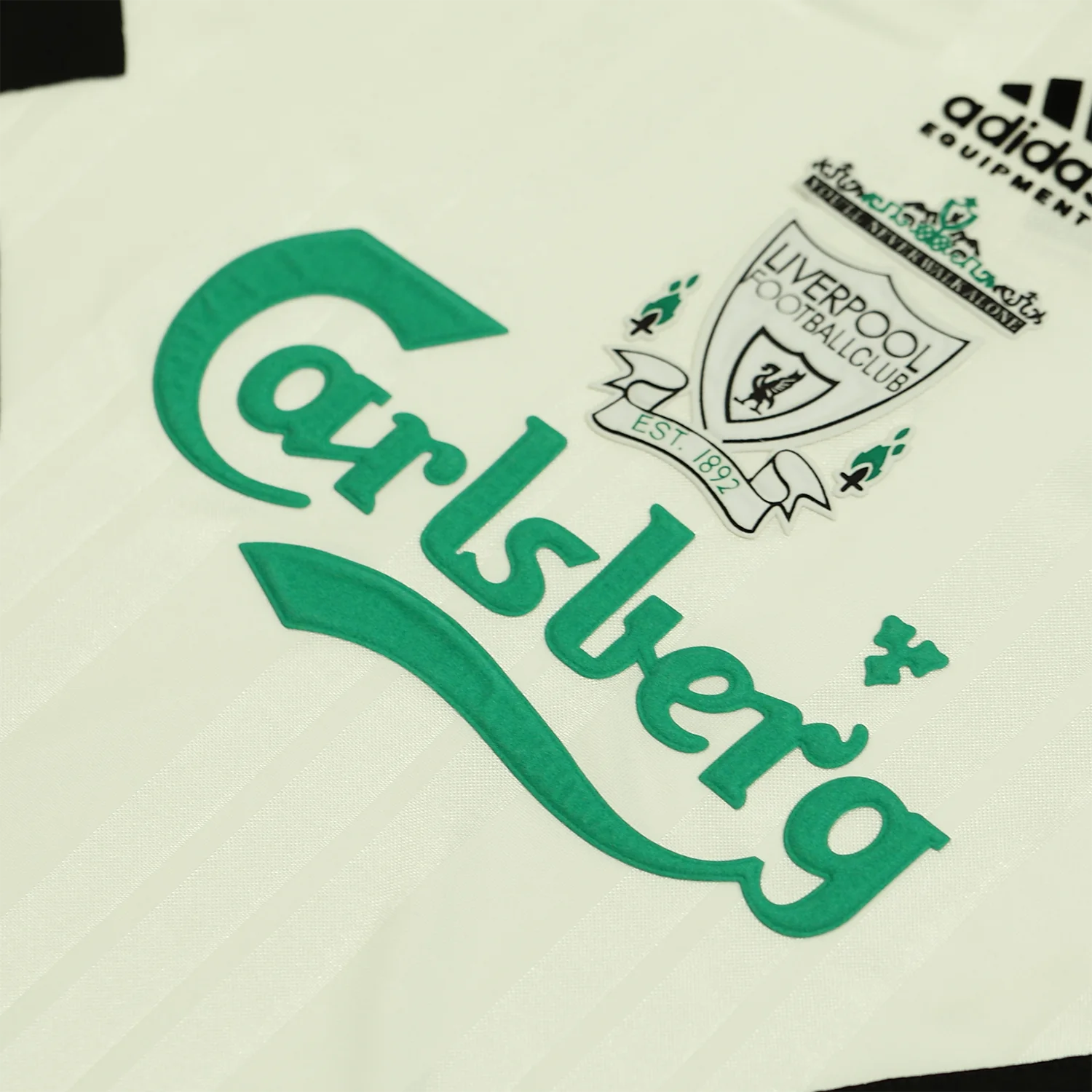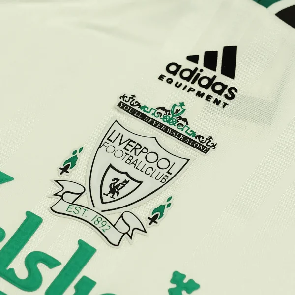 This jersey features white base color complemented by green accents, making it stand out among other kits of the era. It is adorned with the Liverpool club crest, the sponsor logo, and the manufacturer’s branding, which adds to its authenticity and appeal to collectors.