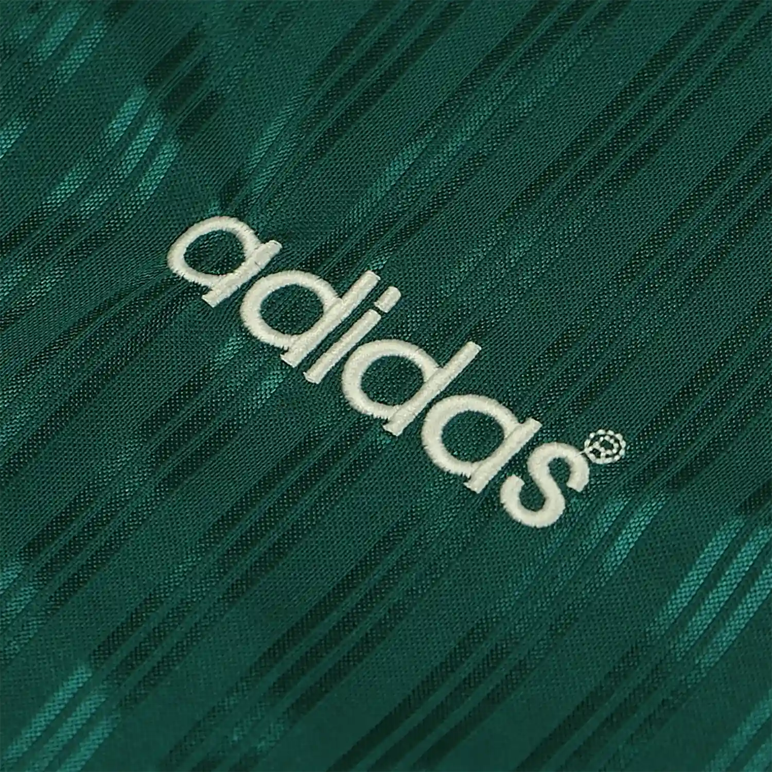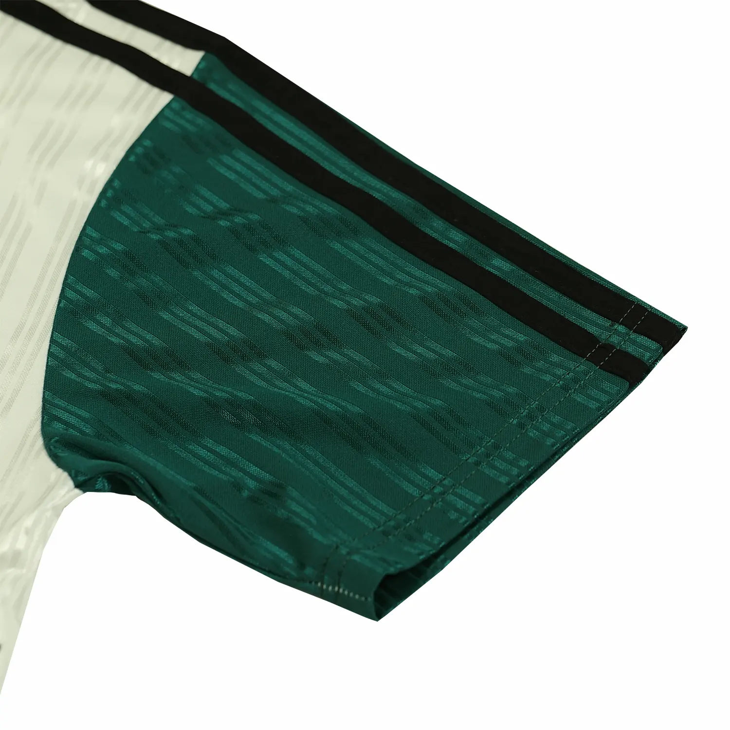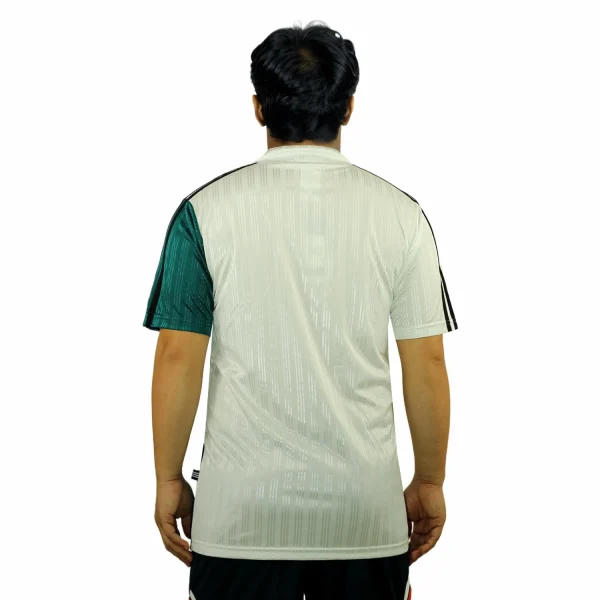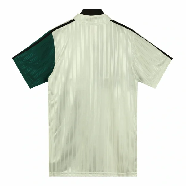 The Liverpool 1995-96 away shirt primarily features a striking combination of green and white. The main color is a bright green, complemented by white checkered sections, creating a visually appealing contrast that stands out in the club’s history.