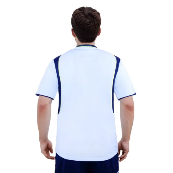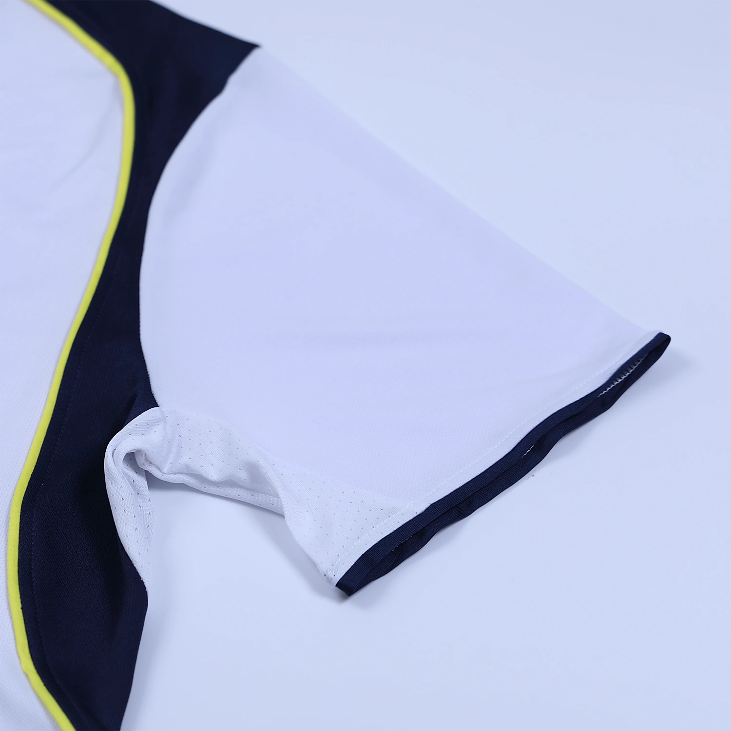 The shirt is primarily white, a traditional away color for Liverpool FC, providing a clean and classic look. It features navy blue and yellow accents, particularly in the collar and panel details, which add a striking contrast and sophistication to the overall design.