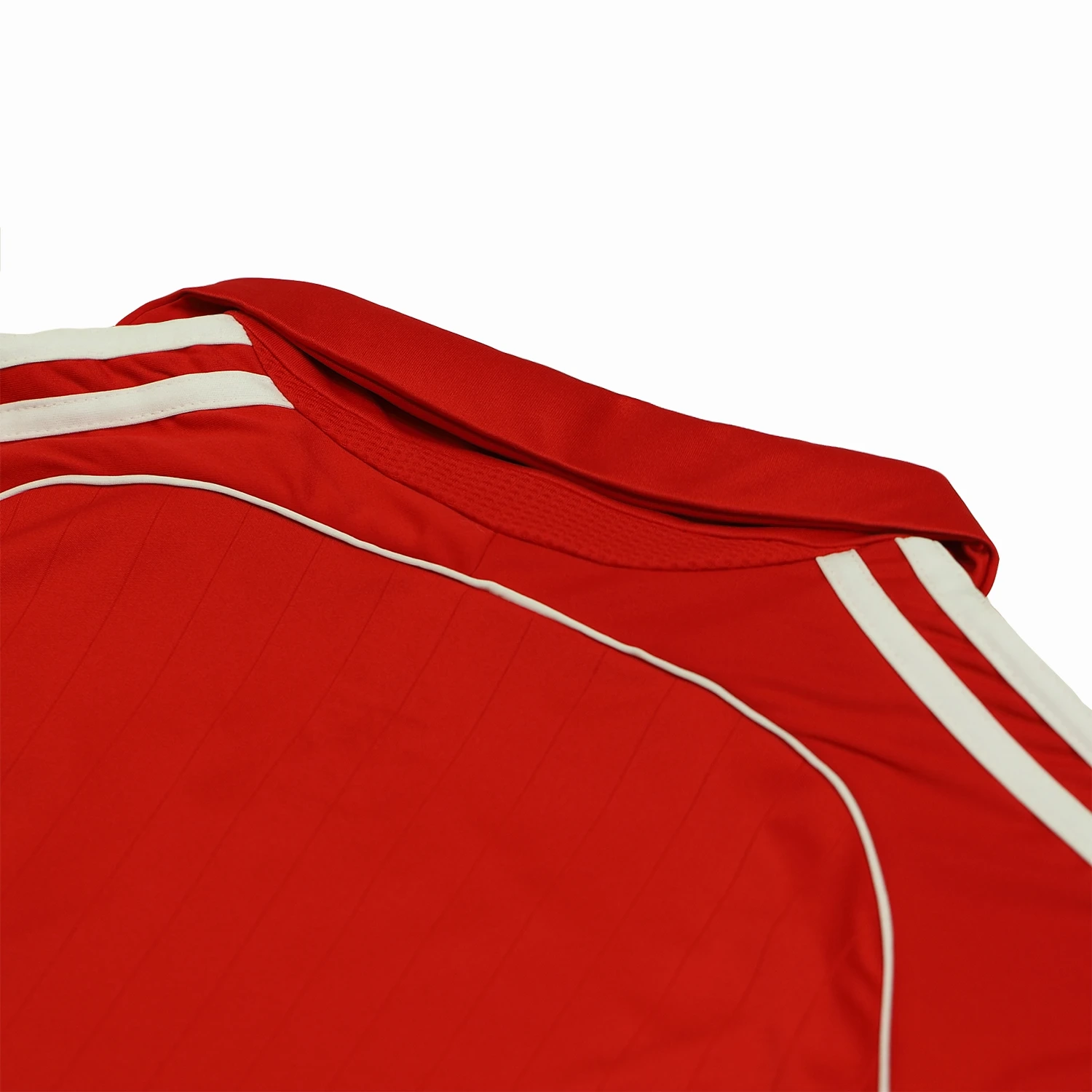 The sleeves are adorned with the signature Adidas three stripes in white, running from the shoulder to the cuff, further enhancing the shirt’s distinctive look. This design is both simple and elegant, capturing the essence of Liverpool FC during this period.