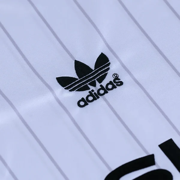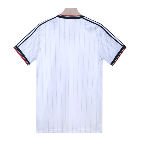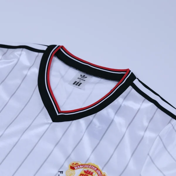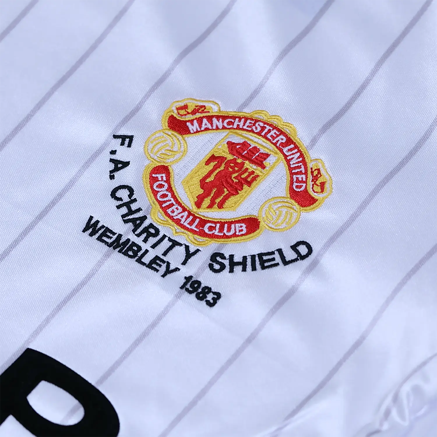 The Manchester United 1982-83 Charity Shield shirt features a simple yet elegant design, with a predominantly white body that exudes a timeless appeal. The fabric is comfortable and durable, reflective of the football kits from the early 1980s, designed for both style and practicality on the pitch.