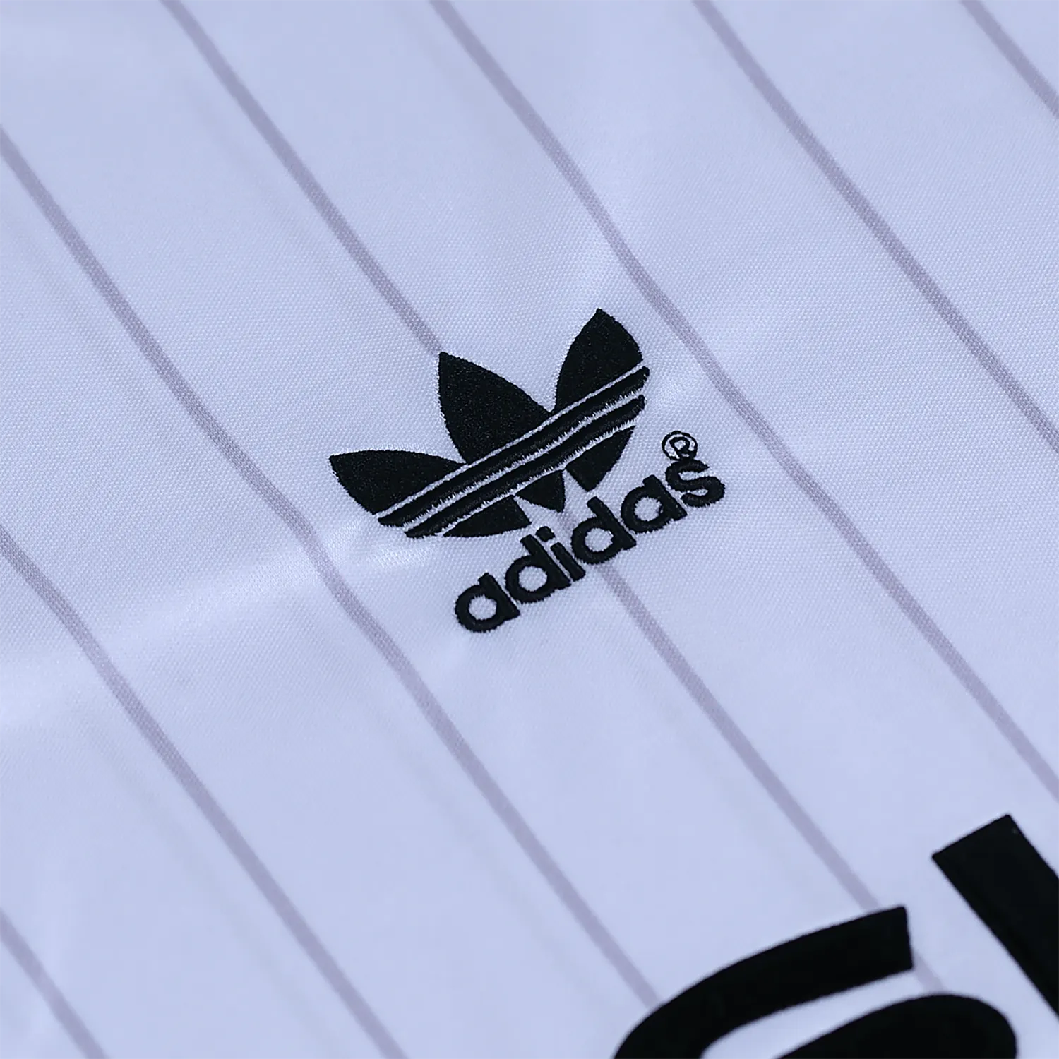 The Manchester United club crest is proudly displayed on the left chest, featuring the traditional round crest design used during this era. On the right chest, the adidas trefoil logo is embroidered in red, complementing the collar and cuffs while signifying the shirt’s quality and heritage.
