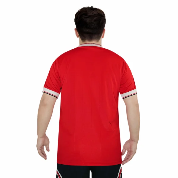 The shirt boasted a simple yet striking look, with a white V-neck collar and matching white cuffs, creating a sharp contrast against the rich red fabric. The Adidas three stripes, synonymous with quality and style, ran down the sleeves in white, adding to the jersey’s timeless appeal. The club’s crest was prominently displayed on the left chest, proudly showcasing Manchester United’s identity and legacy.