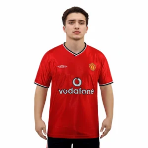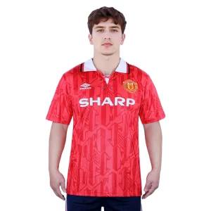 Prominently displayed on the left chest is the Manchester United crest, symbolizing the club’s pride and heritage. The Umbro logo sits on the right chest, ensuring the shirt’s authenticity. The sponsor logo, Sharp, is featured centrally across the chest in black, maintaining the shirt’s cohesive aesthetic.