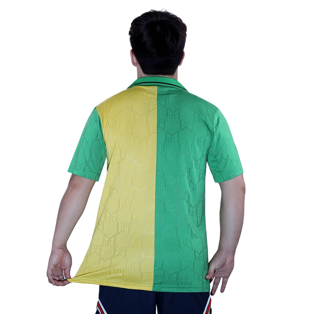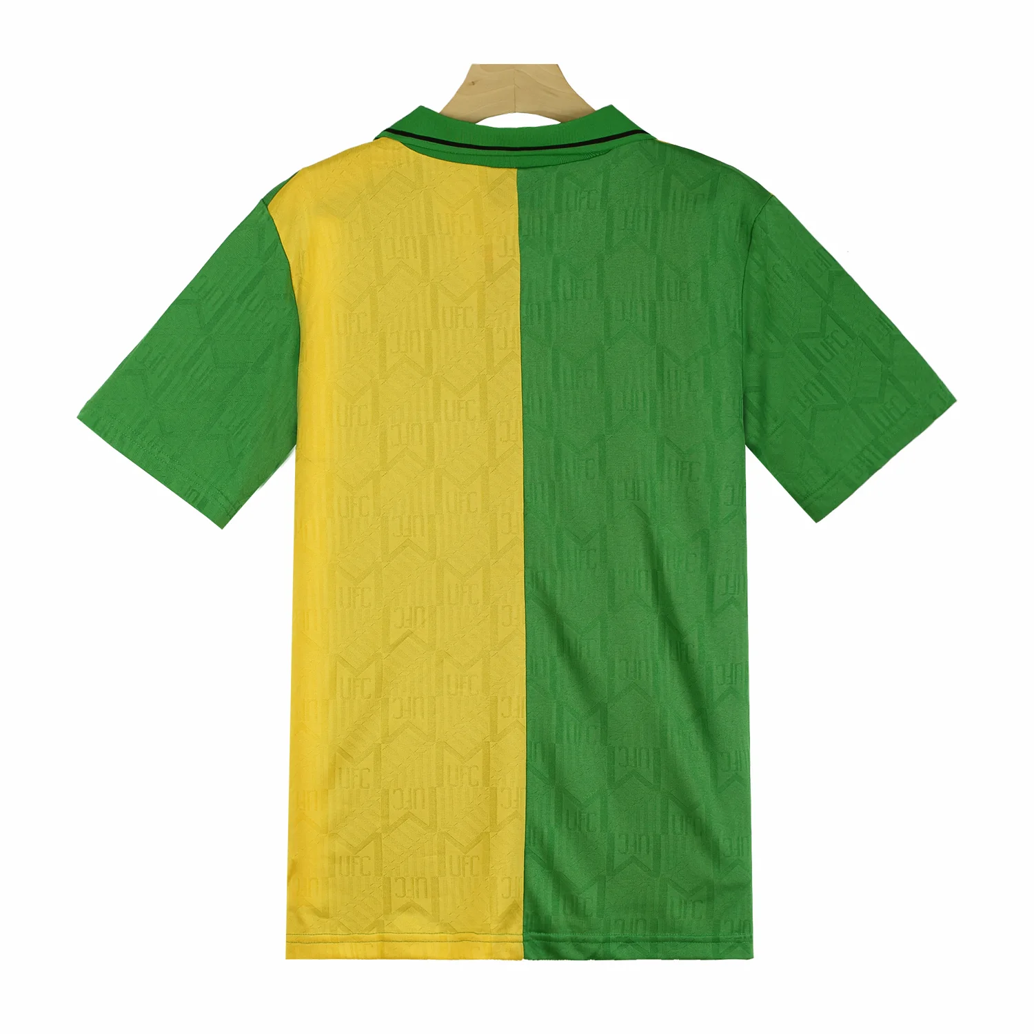 The shirt features a striking green and gold color palette, a bold departure from the club’s usual red and white. The body of the shirt is predominantly green, while the shoulders and sleeves are adorned with vibrant gold, creating a dynamic and eye-catching contrast. The collar is a classic polo style, combining both green and gold to complement the overall design.