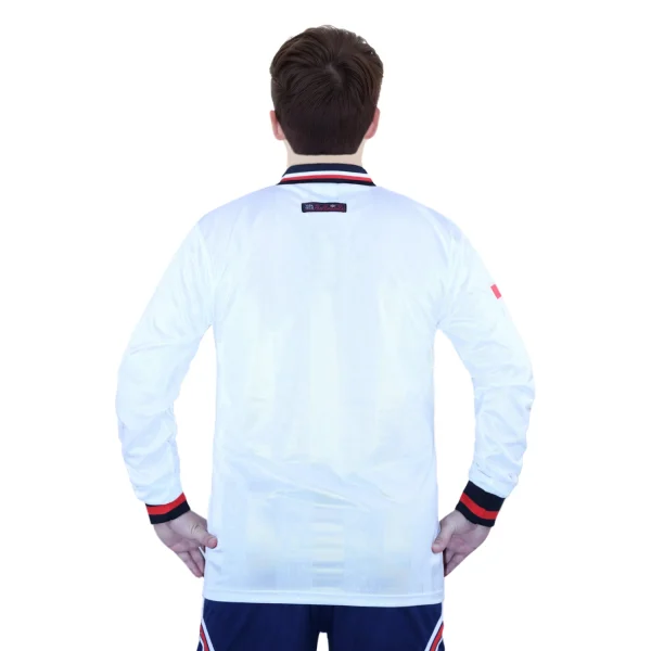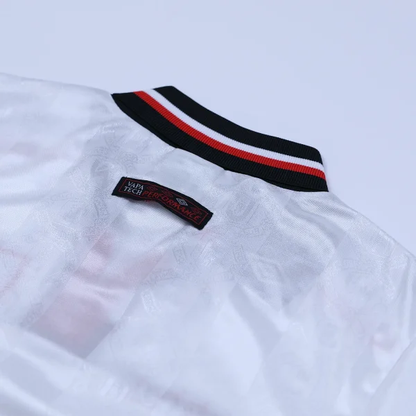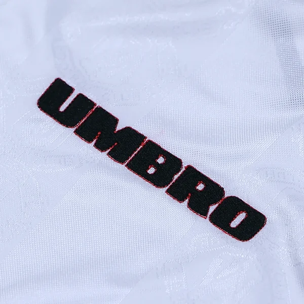 The Manchester United 1997-99 away shirt is a striking and memorable design, celebrated by fans for its unique aesthetic and association with a competitive era for the club. Crafted by Umbro, this shirt diverges from traditional designs, featuring a bold and distinctive look that stands out in the club’s kit history.