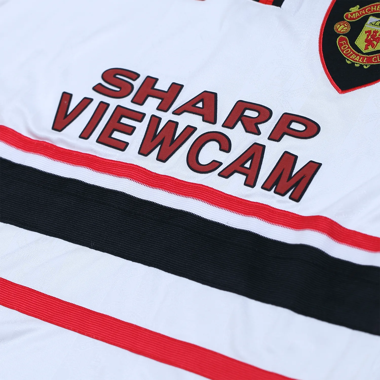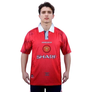 Prominently displayed on the left chest is the iconic Manchester United crest, while the Umbro logo sits on the right, emphasizing the shirt’s authenticity. The sponsor logo, Sharp, is featured centrally across the chest in white, maintaining the shirt’s balanced and cohesive appearance.