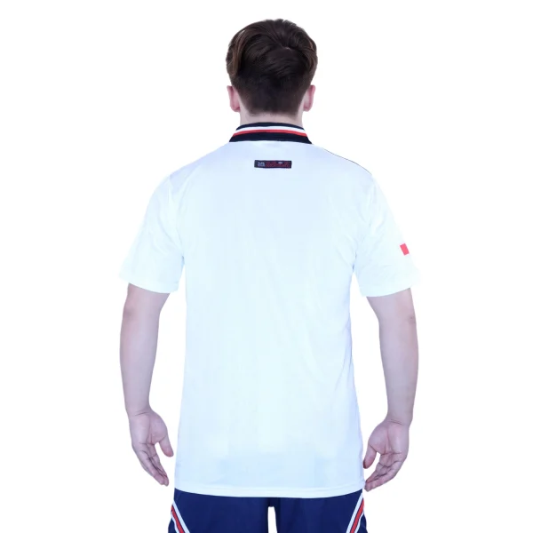 The shirt is predominantly royal blue, accented with an eye-catching black and white horizontal stripe pattern that runs across the chest and sleeves. This bold pattern adds a dynamic and modern touch, reflecting the energy and ambition of the team during that period. The collar is a classic polo neck style, solid black with white trim, adding to the shirt’s sharp and clean design.