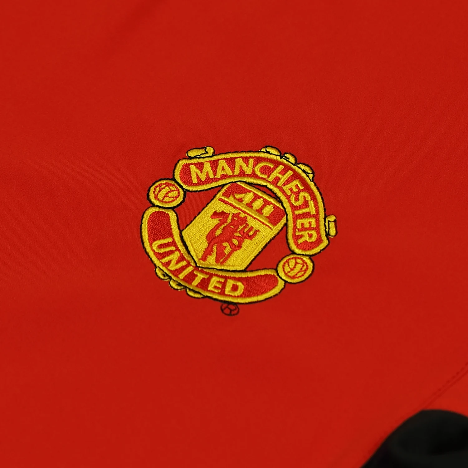 The shirt is predominantly red, staying true to Manchester United’s signature color. The design is clean and minimalist, emphasizing the club’s traditional values while offering a modern look. A key feature of this shirt is the black rounded collar, which adds a touch of contrast and sophistication to the otherwise simple design. The collar is complemented by a subtle black trim on the sleeves, maintaining a cohesive and stylish appearance.