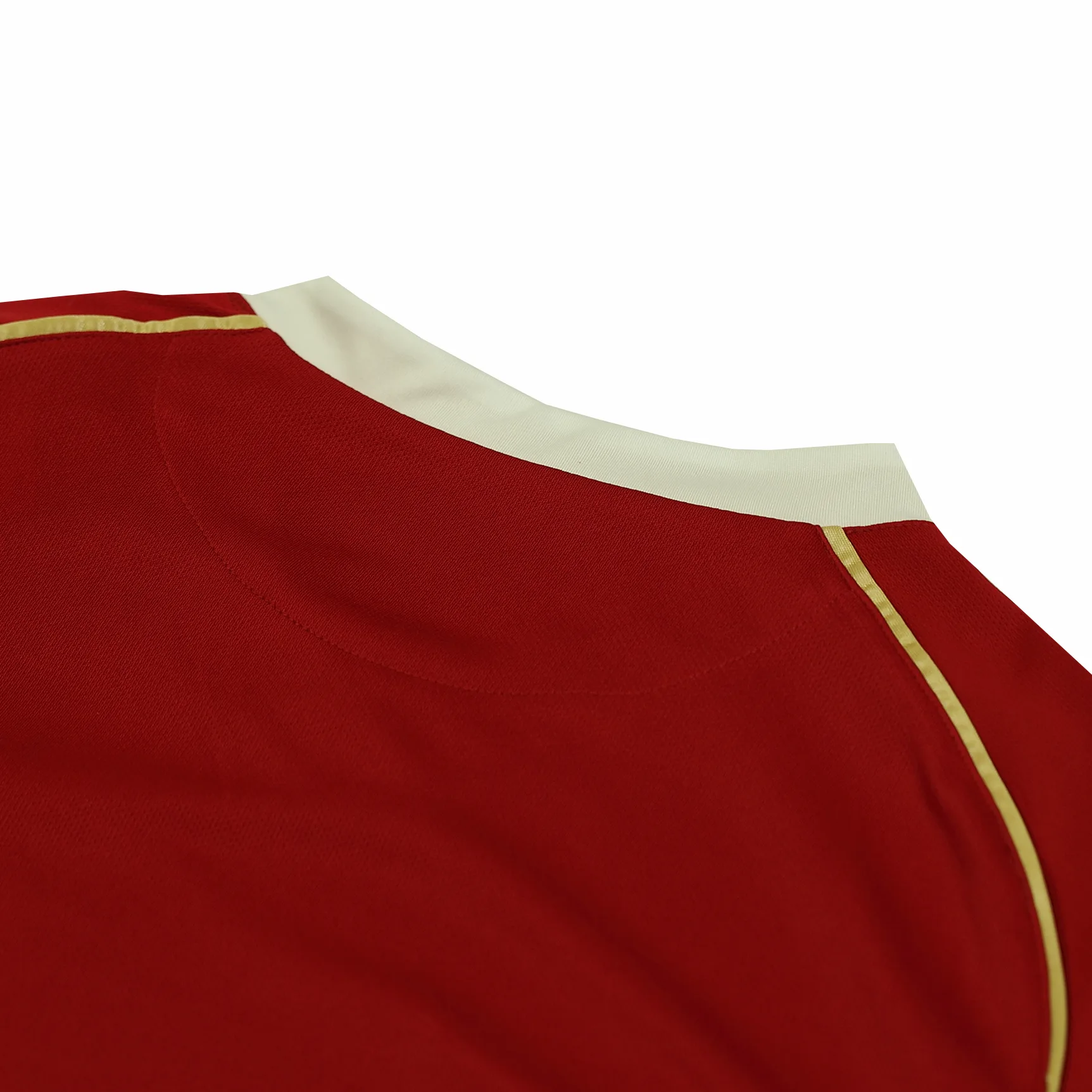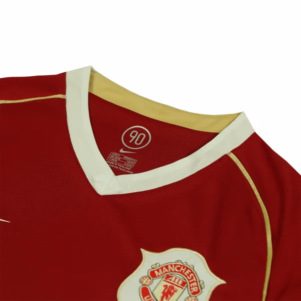 The Manchester United 2006-07 home shirt is renowned for its distinctive design features and color scheme, which pay homage to the club’s rich heritage while incorporating modern elements. The shirt’s primary color is a vibrant red, a traditional and iconic hue for Manchester United, symbolizing the club’s storied history and identity. This red is complemented by gold and white accents, which add elegance and contrast to the overall design.