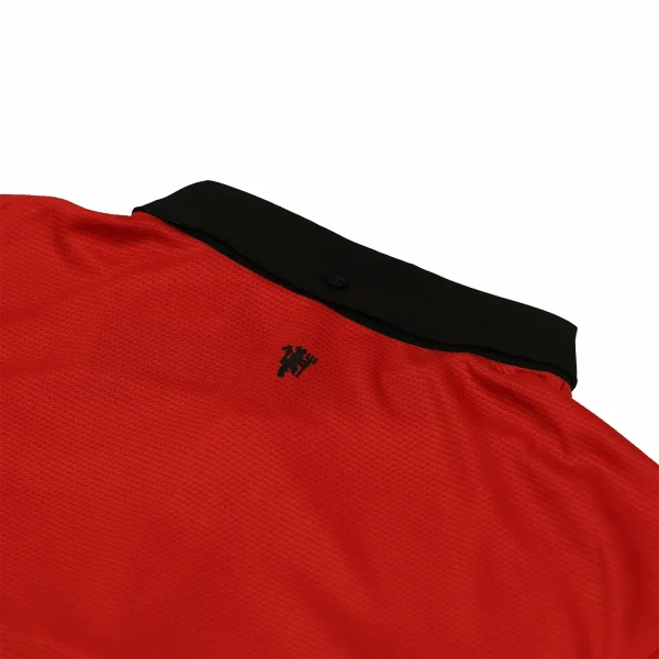 A standout feature of this shirt is the black polo collar with a subtle check pattern, which adds a touch of sophistication and contrast to the classic red body. The collar features a button-up design, providing a traditional yet stylish look.