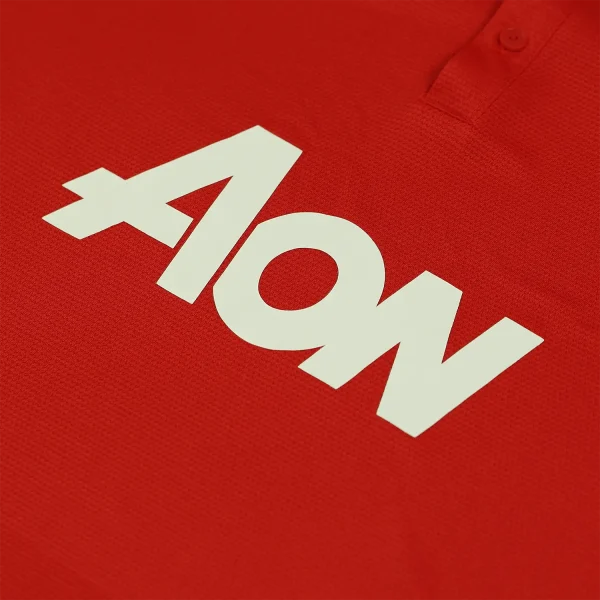 The shirt is predominantly red, showcasing the bold and vibrant color that is synonymous with Manchester United. The iconic Manchester United club crest is proudly embroidered on the left chest in full color, symbolizing the club’s storied legacy and tradition. Opposite it, on the right chest, is the white Nike swoosh logo, signifying the shirt’s quality and authenticity. The center of the shirt features the AON sponsor logo, printed in white, standing out prominently against the red backdrop.