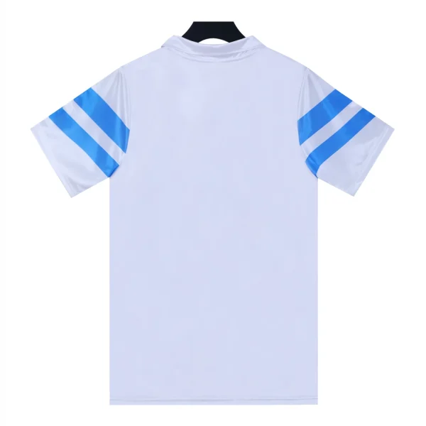 The Napoli 1988-89 away shirt is a celebrated piece of football history, known for its distinctive design and vibrant color scheme. The shirt features a white base, accented with blue geometric shapes, reflecting the aesthetic trends of the late 1980s and symbolizing the vibrant culture of Naples.