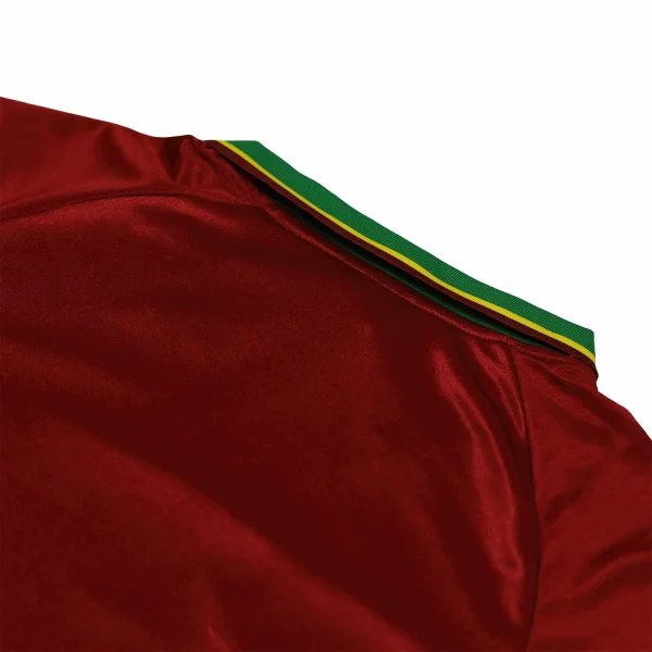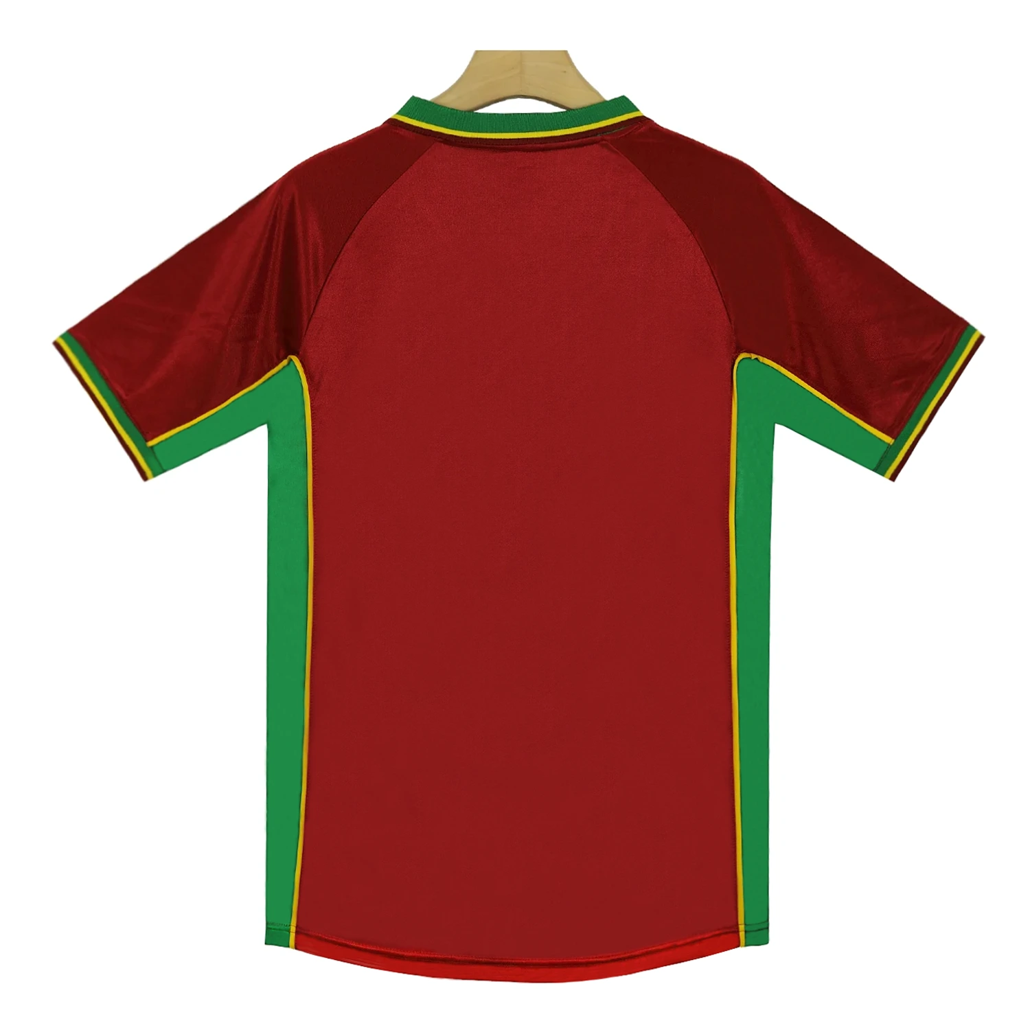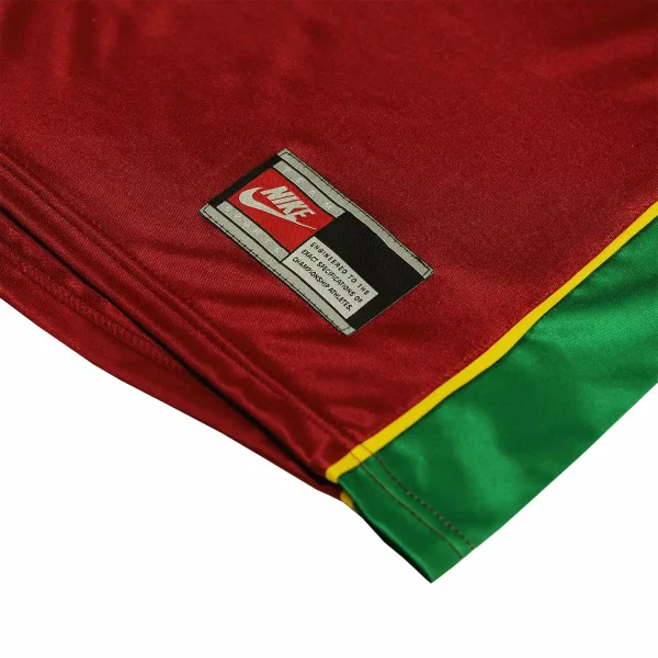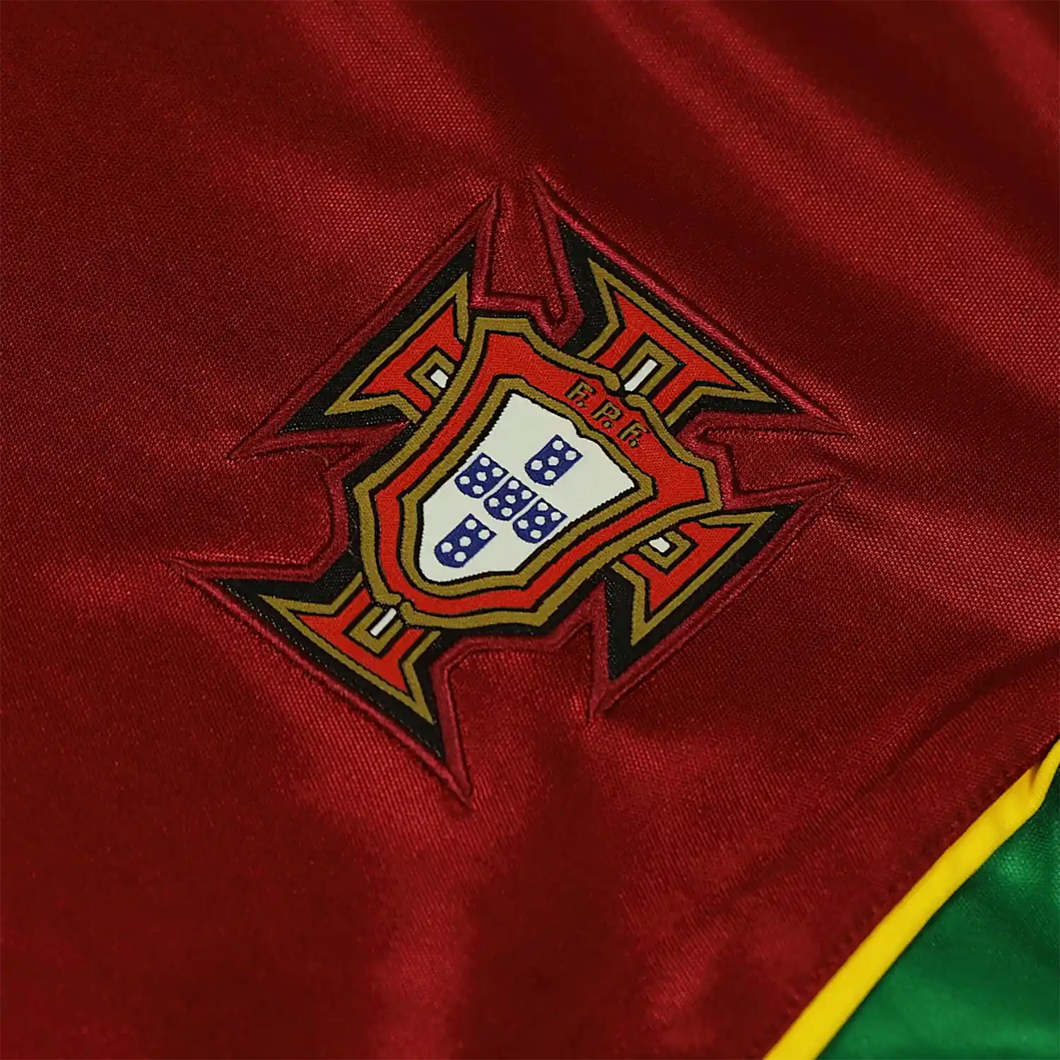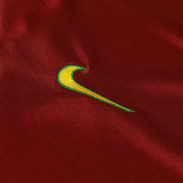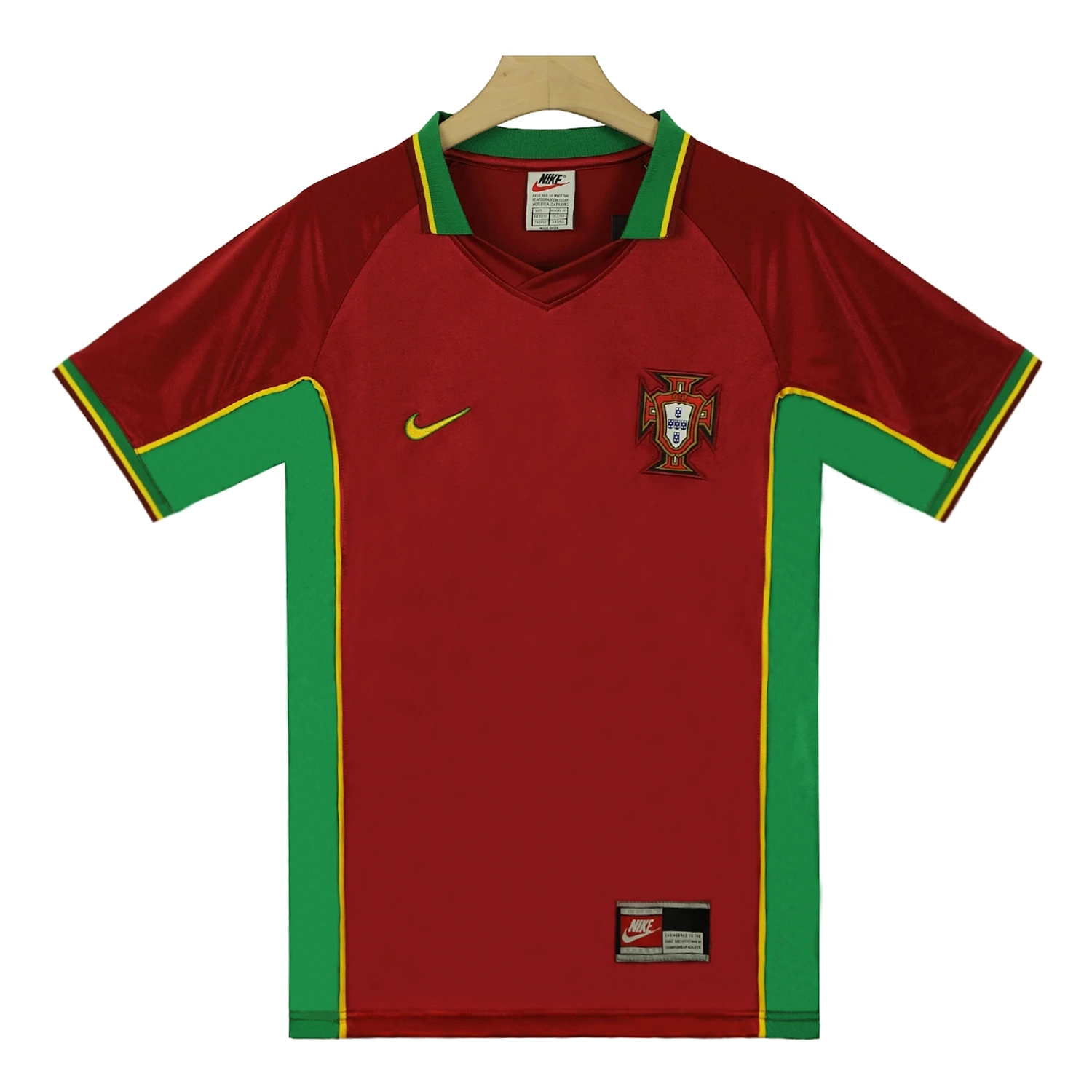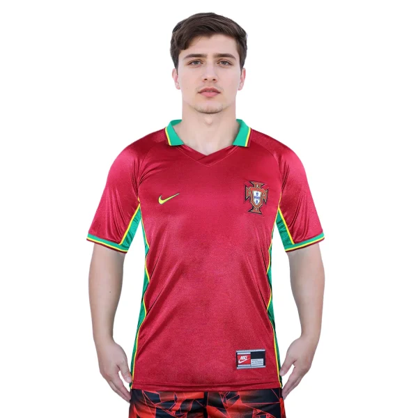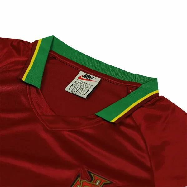It features the classic red color associated with Portugal’s national team, with green accents on the collar and sleeves. The Nike logo is prominently displayed, as Nike was the official kit manufacturer during this period.