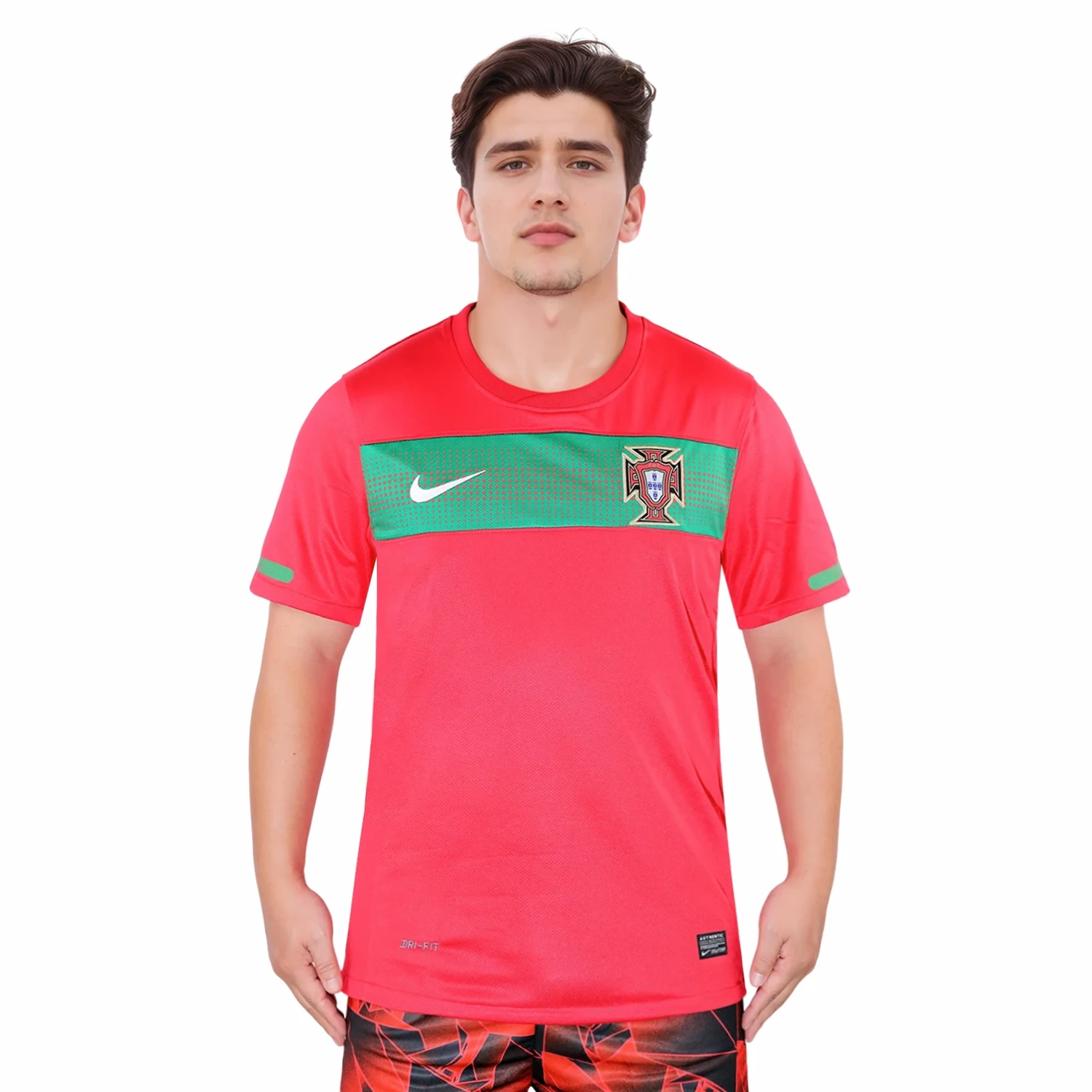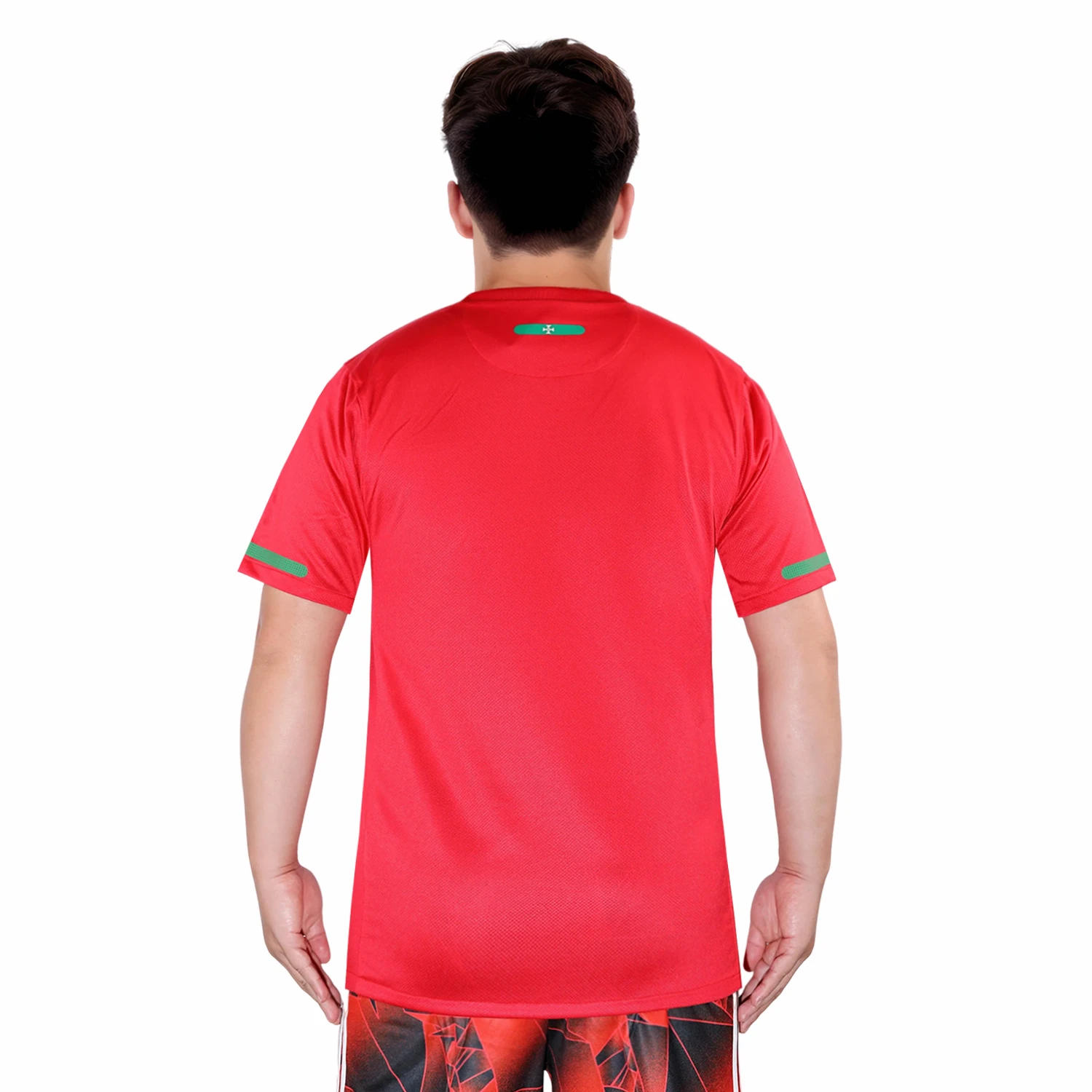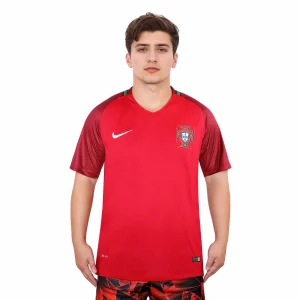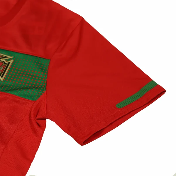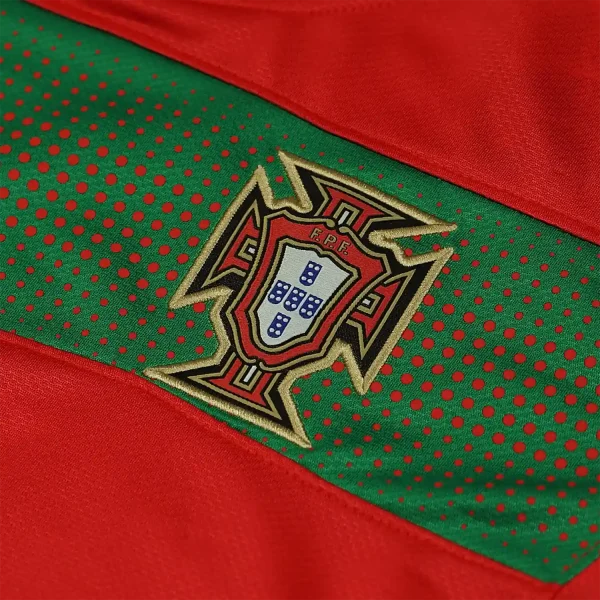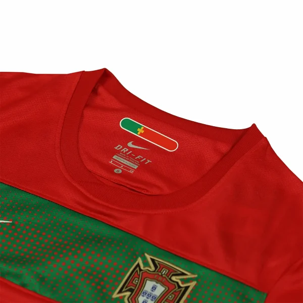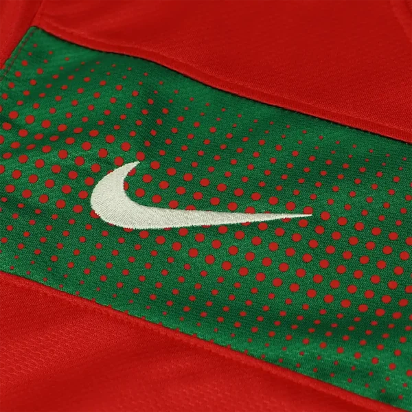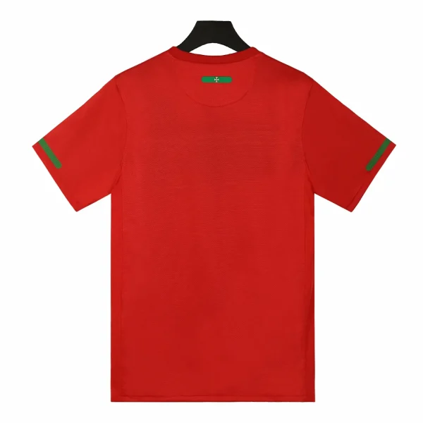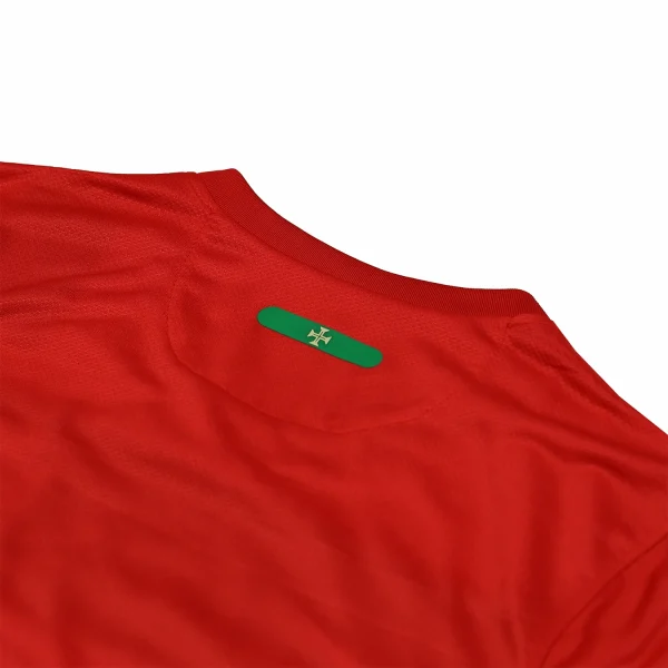 The shirt features Portugal’s traditional deep red base color, which is vibrant and rich, reflecting the nation’s football heritage. This red is contrasted with subtle green accents that add a unique and stylish touch to the jersey. The green is used sparingly, including on the collar and the side panels, providing a nod to Portugal’s national colors.