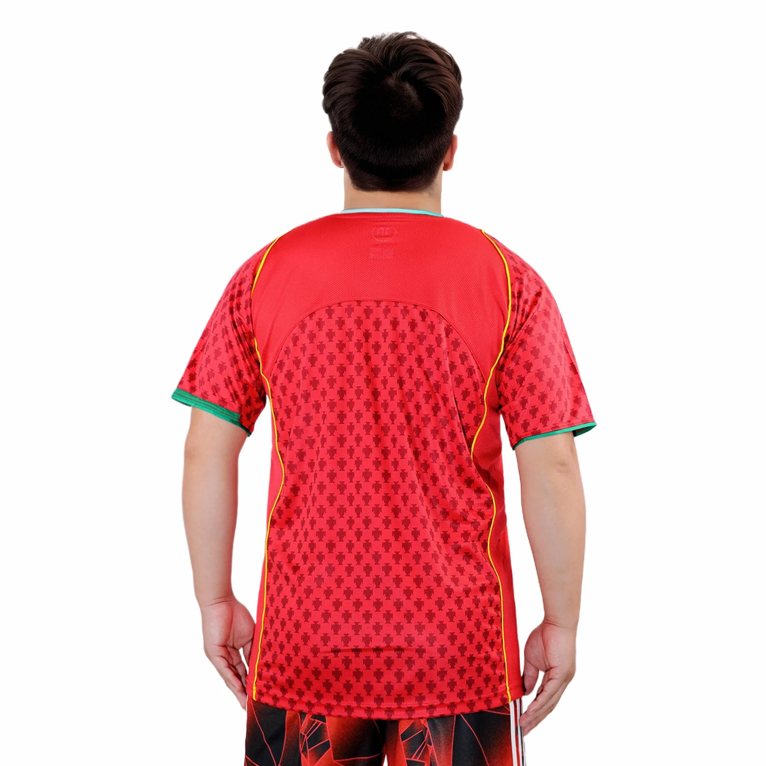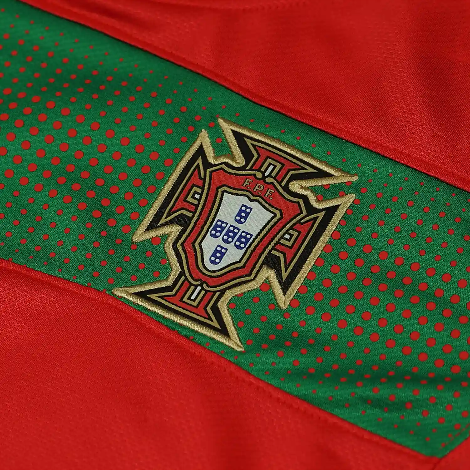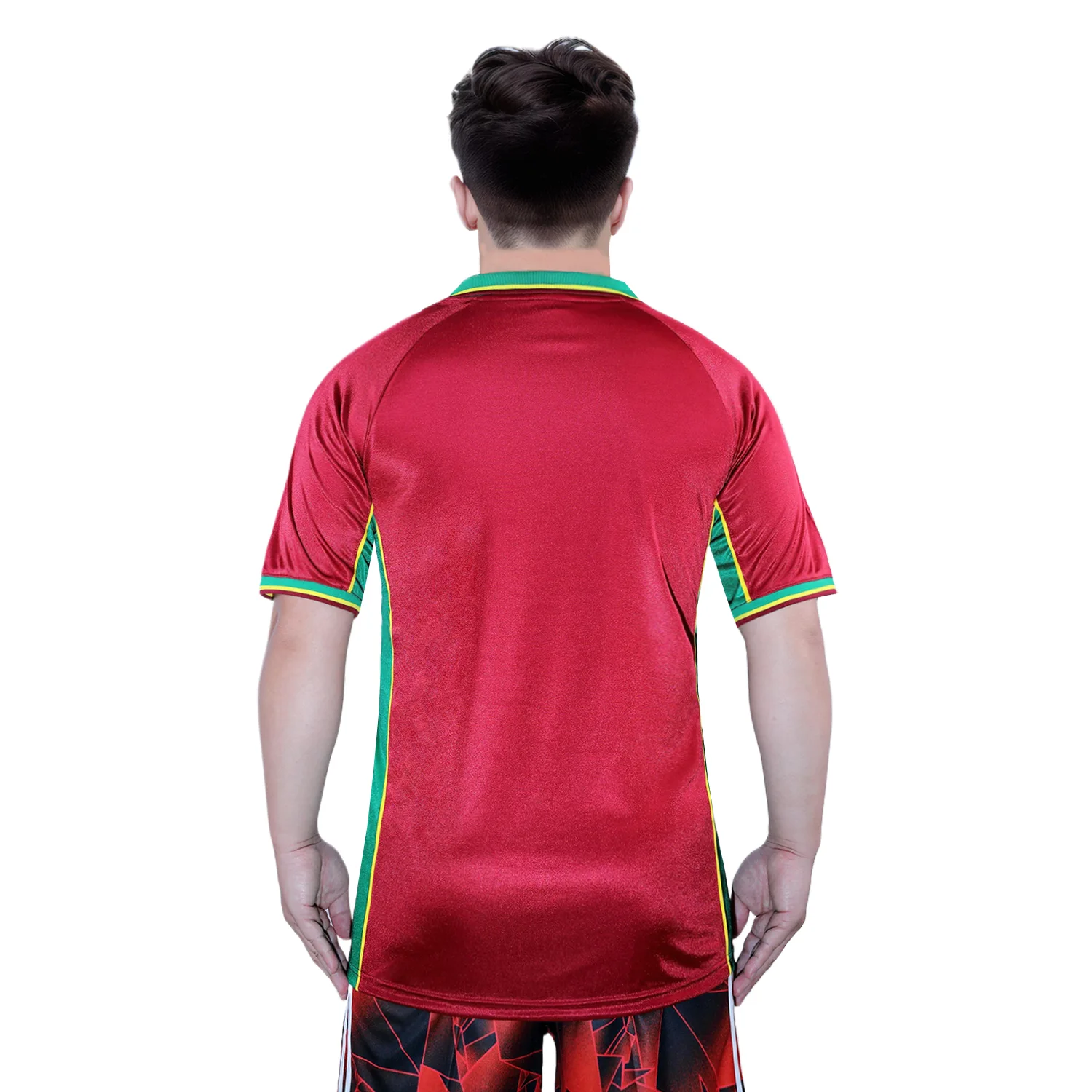The shirt features Portugal’s traditional deep red base color, which is vibrant and rich, reflecting the nation’s football heritage. This red is contrasted with subtle green accents that add a unique and stylish touch to the jersey. The green is used sparingly, including on the collar and the side panels, providing a nod to Portugal’s national colors.