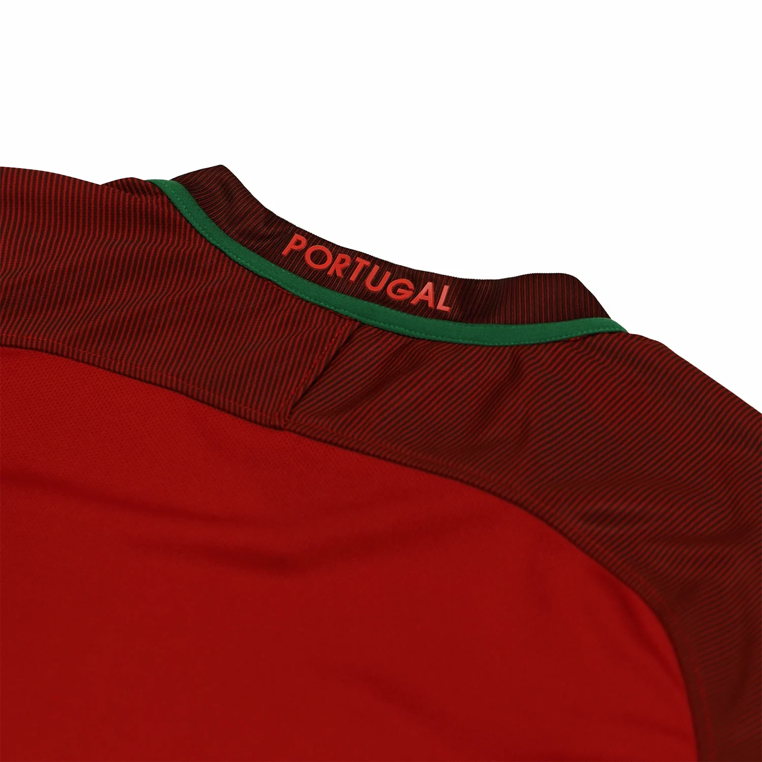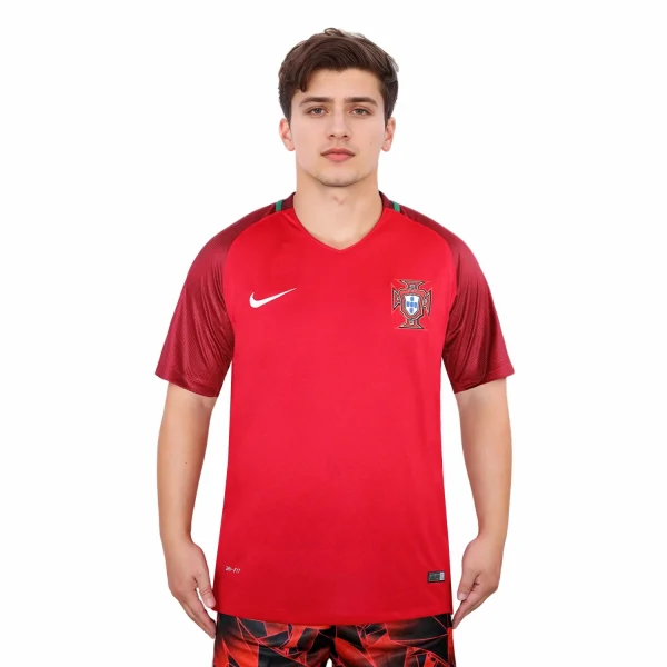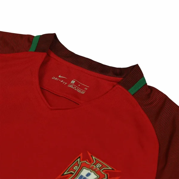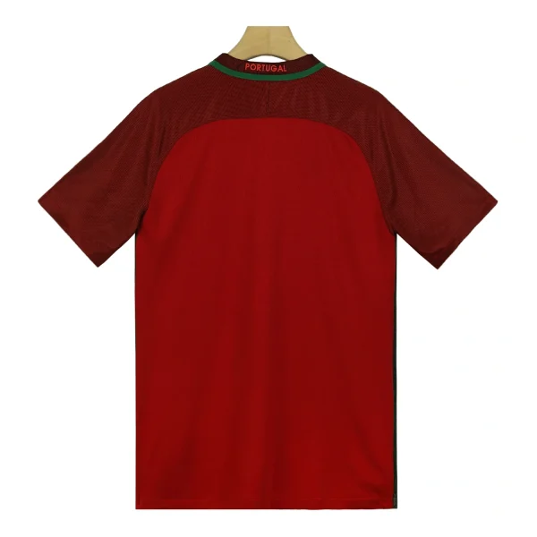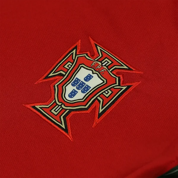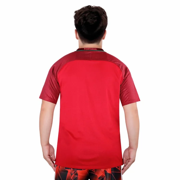The shirt features a deep red color, which is traditional for Portugal’s home kits. It includes green accents on the sides and collar, symbolizing the national flag’s colors.