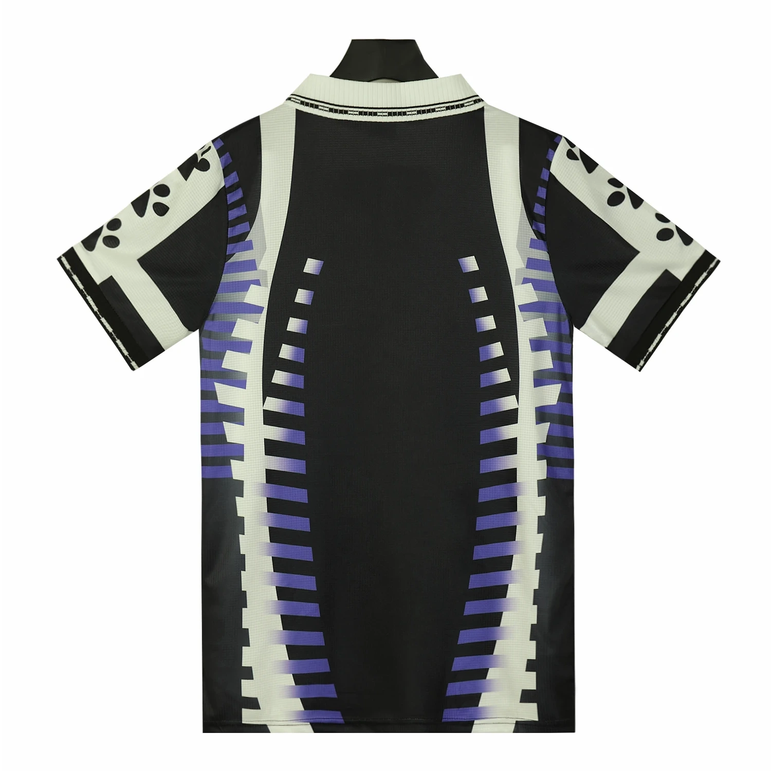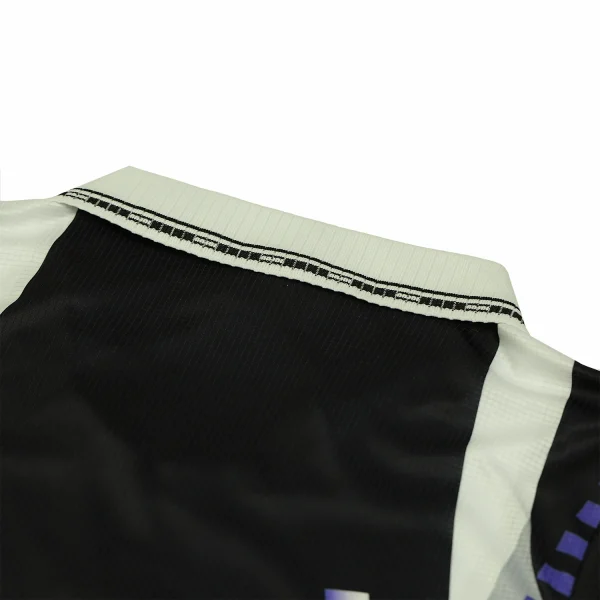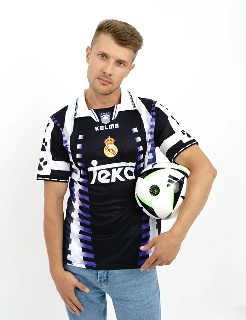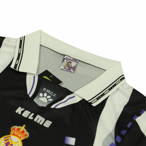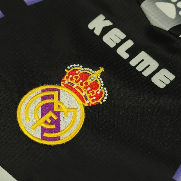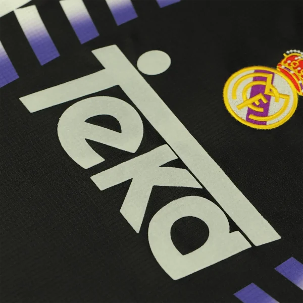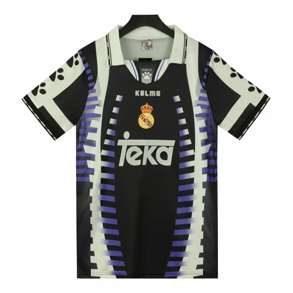 The Real Madrid 1997-98 third shirt is a notable piece of football history, characterized by its unique design and vibrant color scheme. This jersey features a striking black and purple colorway, which marked a departure from the club’s traditional white kits.