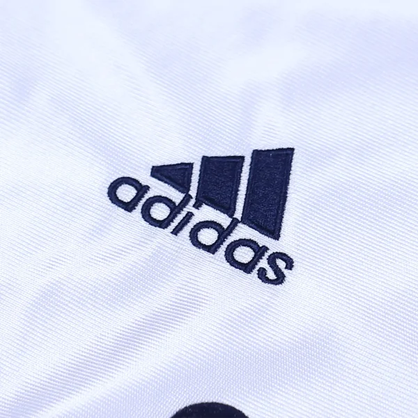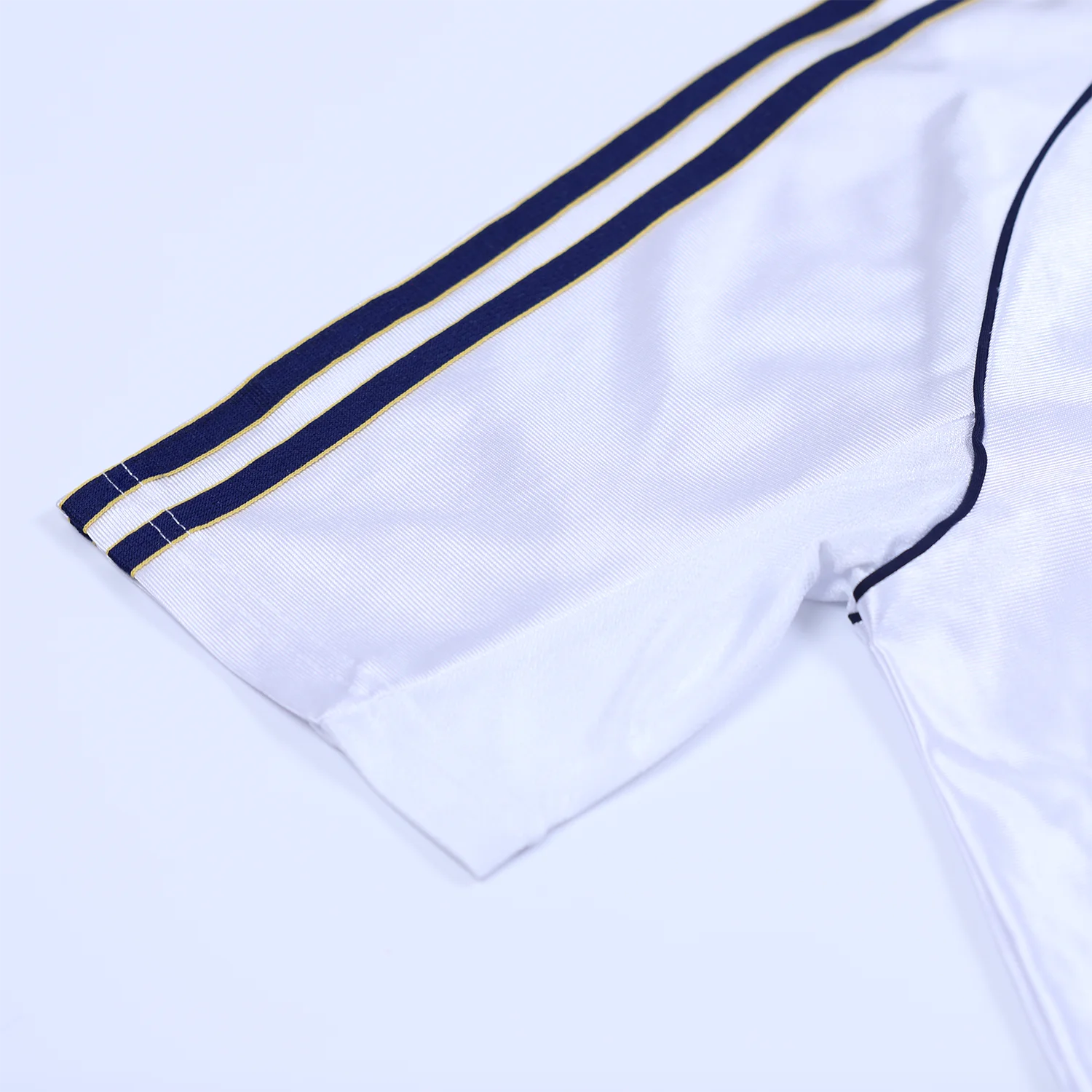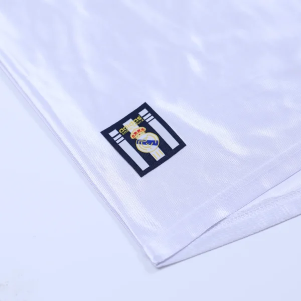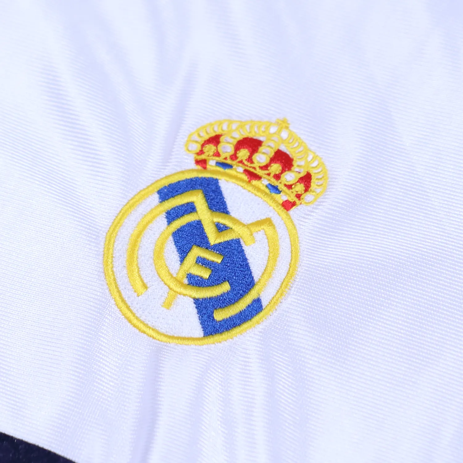 Player names and numbers are printed on the back in a bold font, often in a contrasting color for visibility. Notable players like Roberto Carlos and Raul wore this kit, adding to its historical significance and appeal among fans.